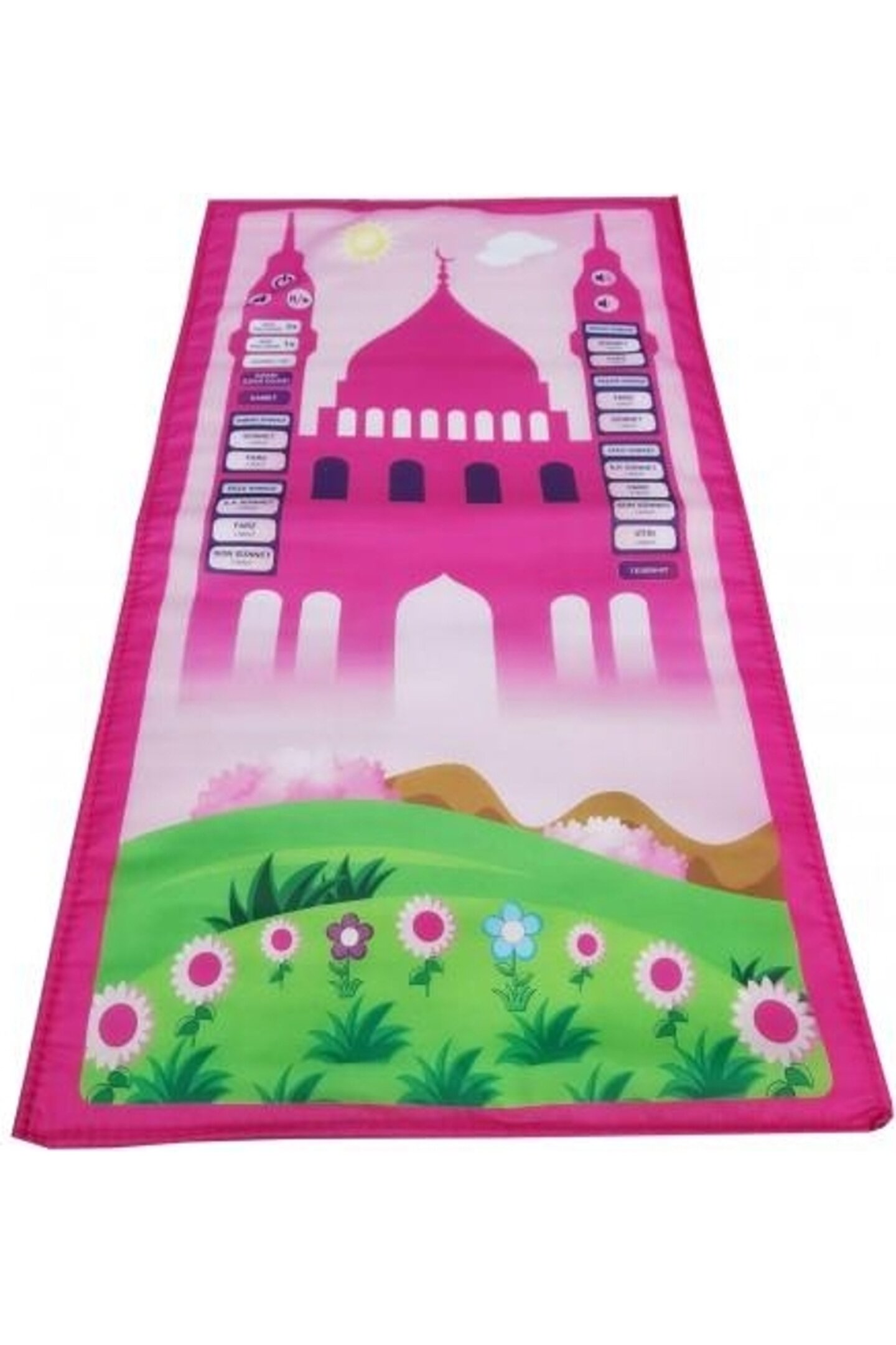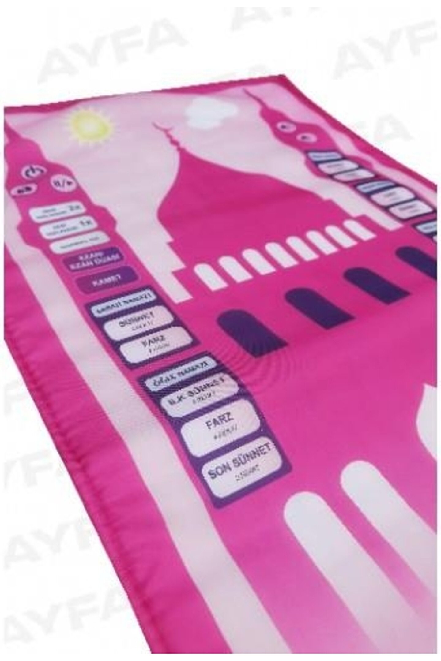 508P - Benim Seccadem - Çocuklar İçin Sesli Konuşan Namaz Kıldıran Seccade Kod: AYFA508-P Rabbimizin emri olan namazı çocuklarımızın namazlarını kılmaya alışmalarında ve ilk öğrenme aşamalarında eksiksiz ve en doğru şekilde namazlarını kılmalarını kılmayı öğrenmeleri için hazırlanmış bu eşsiz ürün ile çocuklarınız namaz kılmayı eğlenerek öğrensin. ; PAKET İÇERİĞİ: 1 Adet Benim Seccadem Sesli Eğitici Çocuk Seccadesi İLK SECCADEM ÇOCUKLAR İÇİN NAMAZ KILMAYI ÖĞRETEN SECCADE TEKNİK ÖZELLİKLERİ: Benim Seccadem iç kısmı naylon, ses boardı ve elektrik devreleri içerir, sudan ve ateşten uzak tutulmalıdır. ; Ses boardının içi sadece yalnızca profesyonel teknisyenler tarafından açılmalıdır. ; Ürünü kullanırken, en iyi performans ve ses kalitesi alabilmek için, ürünü düz bir yüzeyde ve katlamadan kullanın. ; İlk Seccademi temizlemek isterseniz hafif nemli bir bezle siliniz. ; Kesinlikle suya temas ettirmeyiniz ve çamaşır makinasın da yıkamayınız KULLANIMI: 3 Adet AAA pil ile çalışır. ; Piller paket içeriğine dahil değildir. ; Üzerinde bulunan görseller dokunmatik sistemlidir. ; Dilediğiniz dua veya namaz görseline dokunarak başlatabilirsiniz. ; Ses yüksekliği ayarı ve durdurma özelliğine de sahiptir. ; ÜRÜN BOYUTU: 88 Cm x 52 Cm Not: Garanti süresi, ürünün teslim tarihinden itibaren başlar. ; Ürün 1 yıl garantilidir. ; Teslimat Bilgileri Kargonuz teslim edildiğinde, ürünün paketinde deformasyon veya ürüne zarar verebilecek bir durum söz konusu ise, kargo görevlisi ile birlikte paketi açarak ürünlerinizin durumunu kontrol ediniz. ; Ürünlerinizde bir hasar gördüğünüz takdirde, kargo yetkilisinden tutanak tutmasını isteyiniz ve paketi teslim almayınız. ; Tutanak tutulan ürünler kargo firması tarafından bize ulaştırılacak ve ürünlerin değişimi yapılacaktır. ; 0 332 350 07 06 numaraya bilgi verilmesi gerekmektedir.;