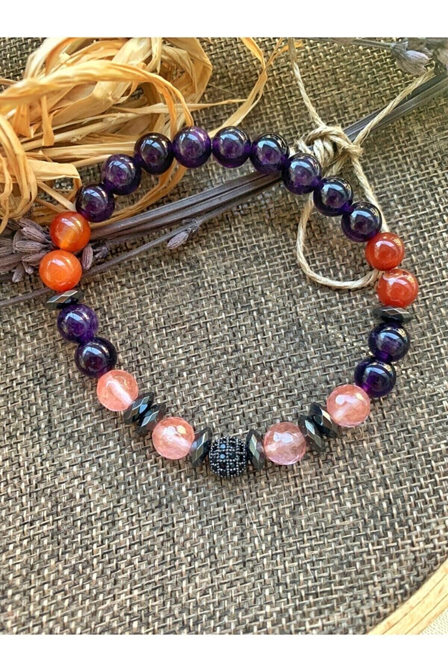 Ürünlerimiz doğal taş ile hazırlanmaktadır. ; Bilekliklerimiz standart 17/18 cm olarak hazırlanıp, yedek taş ve lastikli misina ile gönderim yapılmaktadır. ; Tane eni: 8 mm Tane boyu:8 mm Tane kesimi: Küre, düz kesim akik ve ametist ve fasetli kesim pembe kuvars Ara mazleme: Markazit işlemeli ara malzeme;
