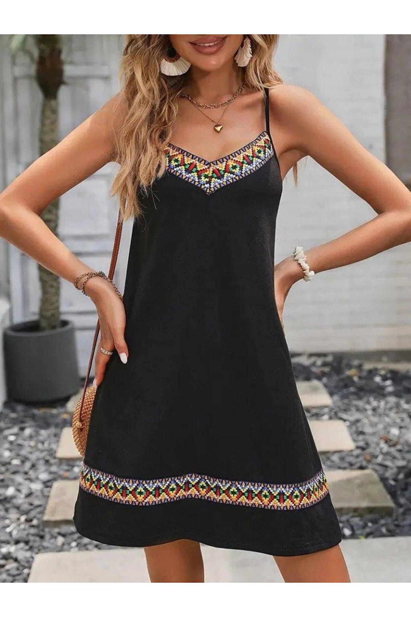 babatr.com Kadın Ip Askılı V Yakalı Etnik Desenli Detaylı Elbise