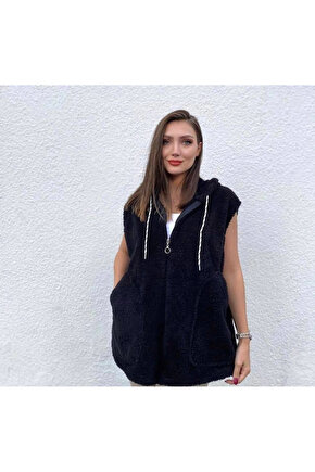 Kadın Kapüşon Ve Fermuar Detay Welsoft Kolsuz Yelek