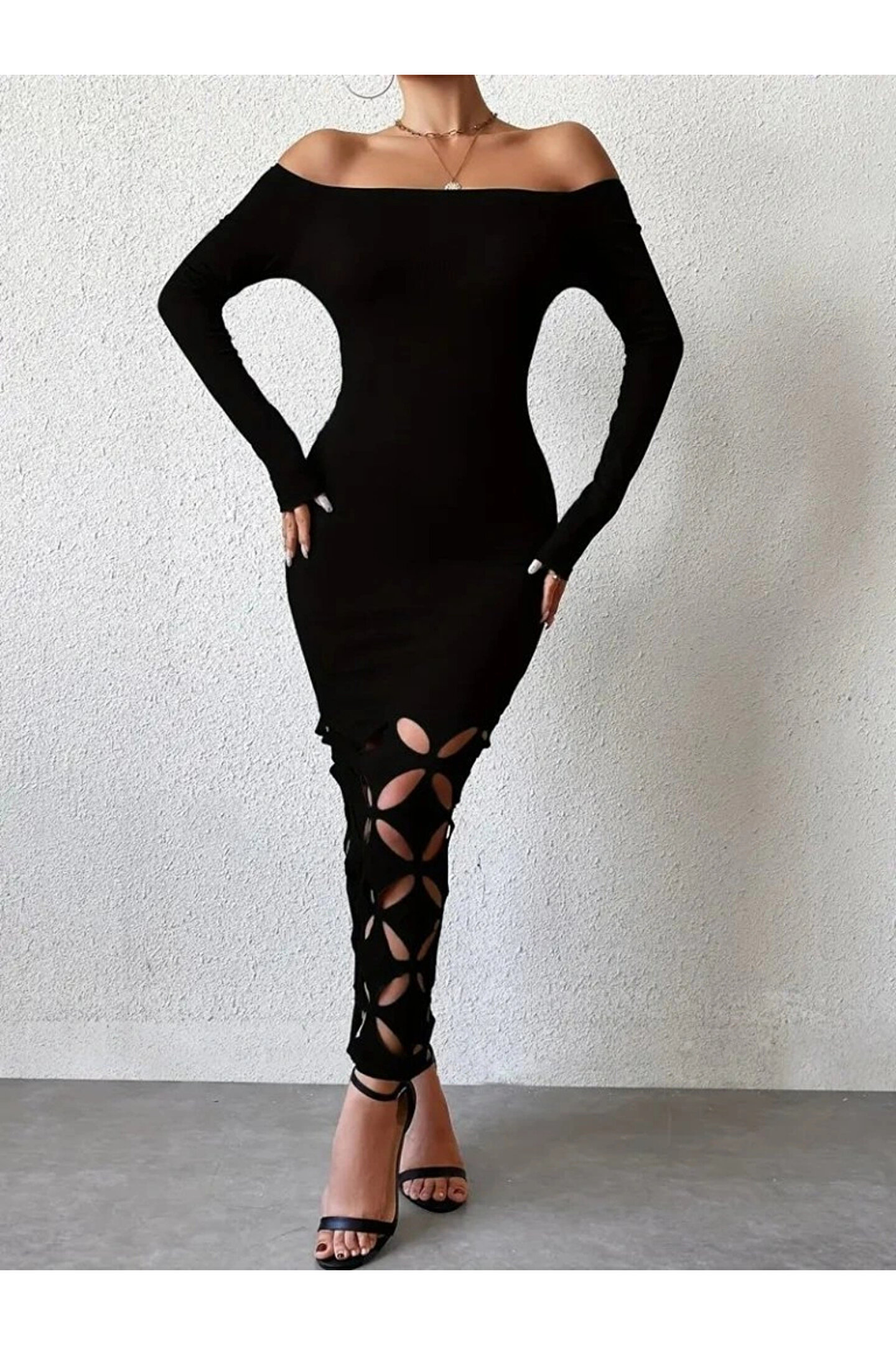 Kadın Madonna Yaka Uzun Kollu Lazer çiçek Kesim Detaylı Uzun Ithal Krep Elbise