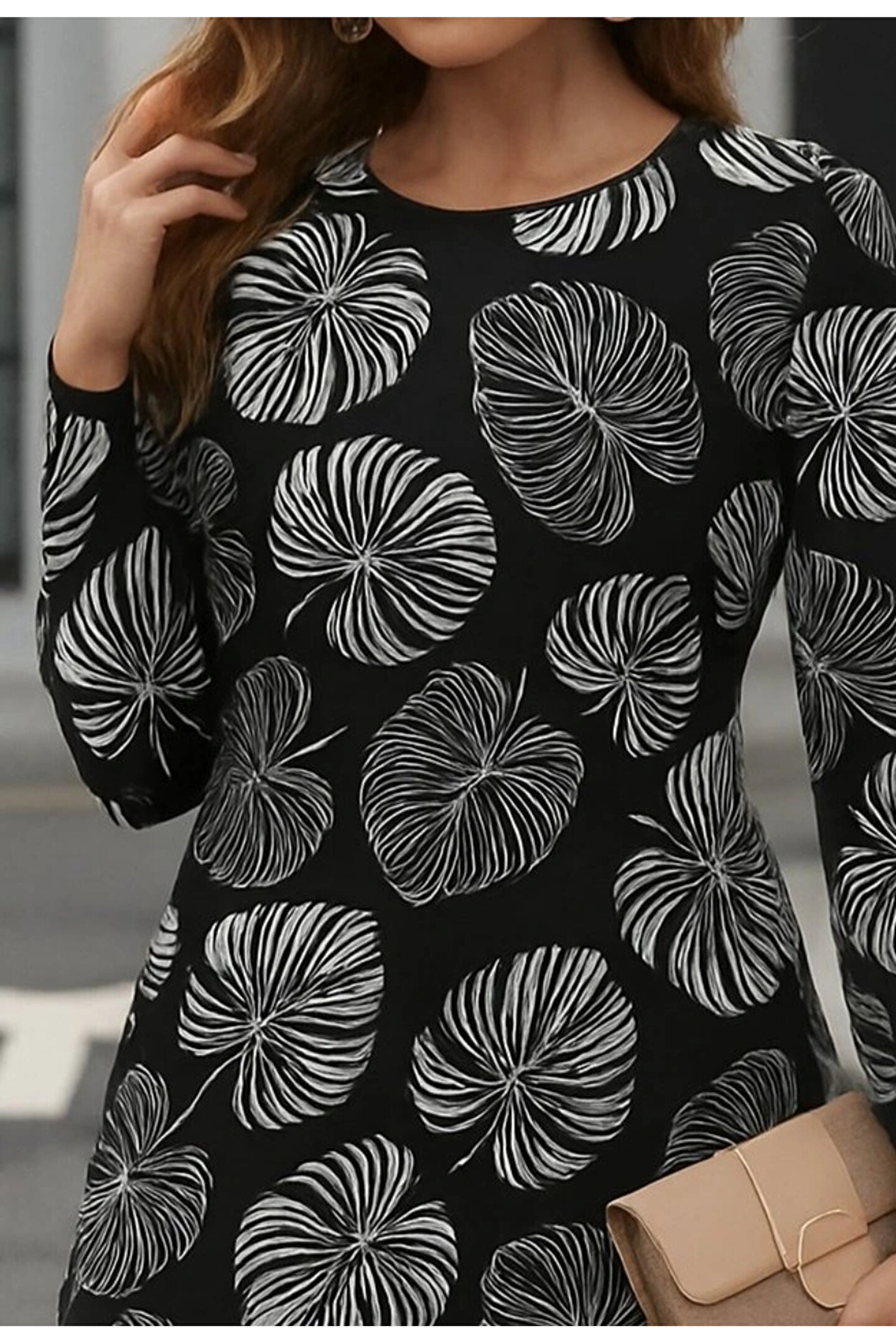 Kadın Uzun Kollu Bisiklet Yaka Desenli Kısa Krep Elbise