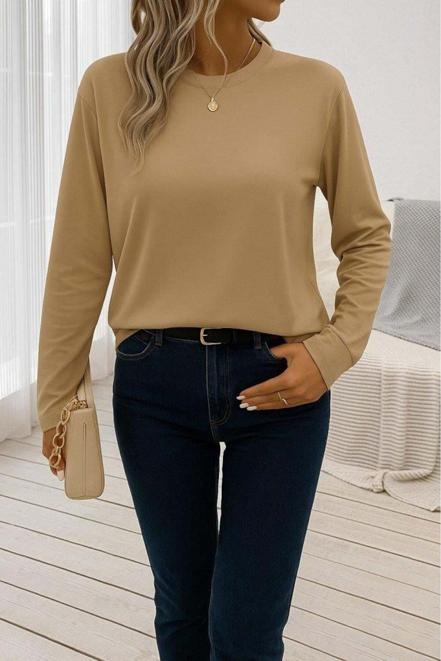 babatr.com Kadın Uzun Kollu Bisiklet Yaka Viskon Bluz