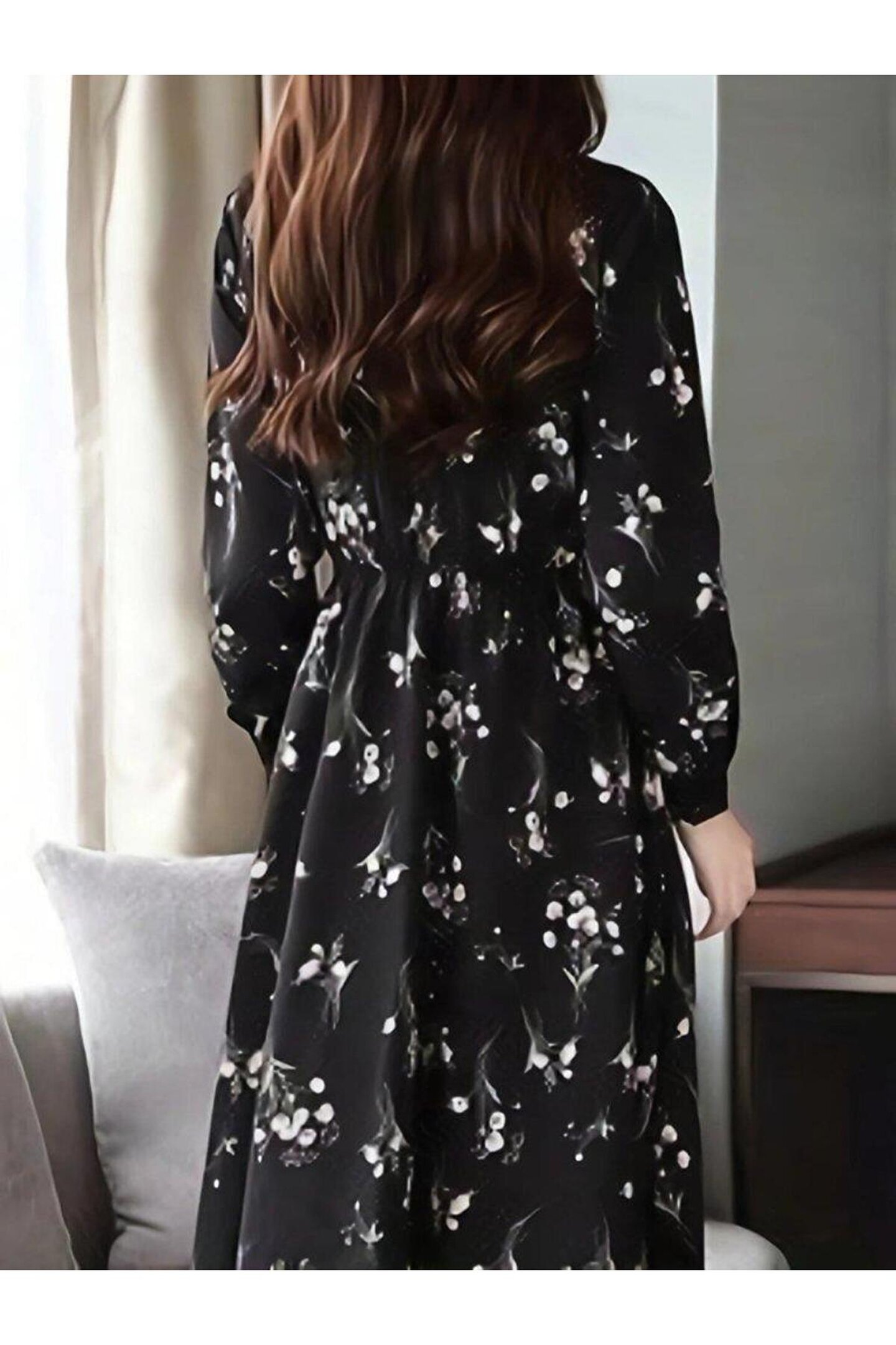babatr.com Kadın Uzun Kollu Hakim Yakalı Düğmeli Kuşaklı Desenli Maxi Mikro Süprem Elbise