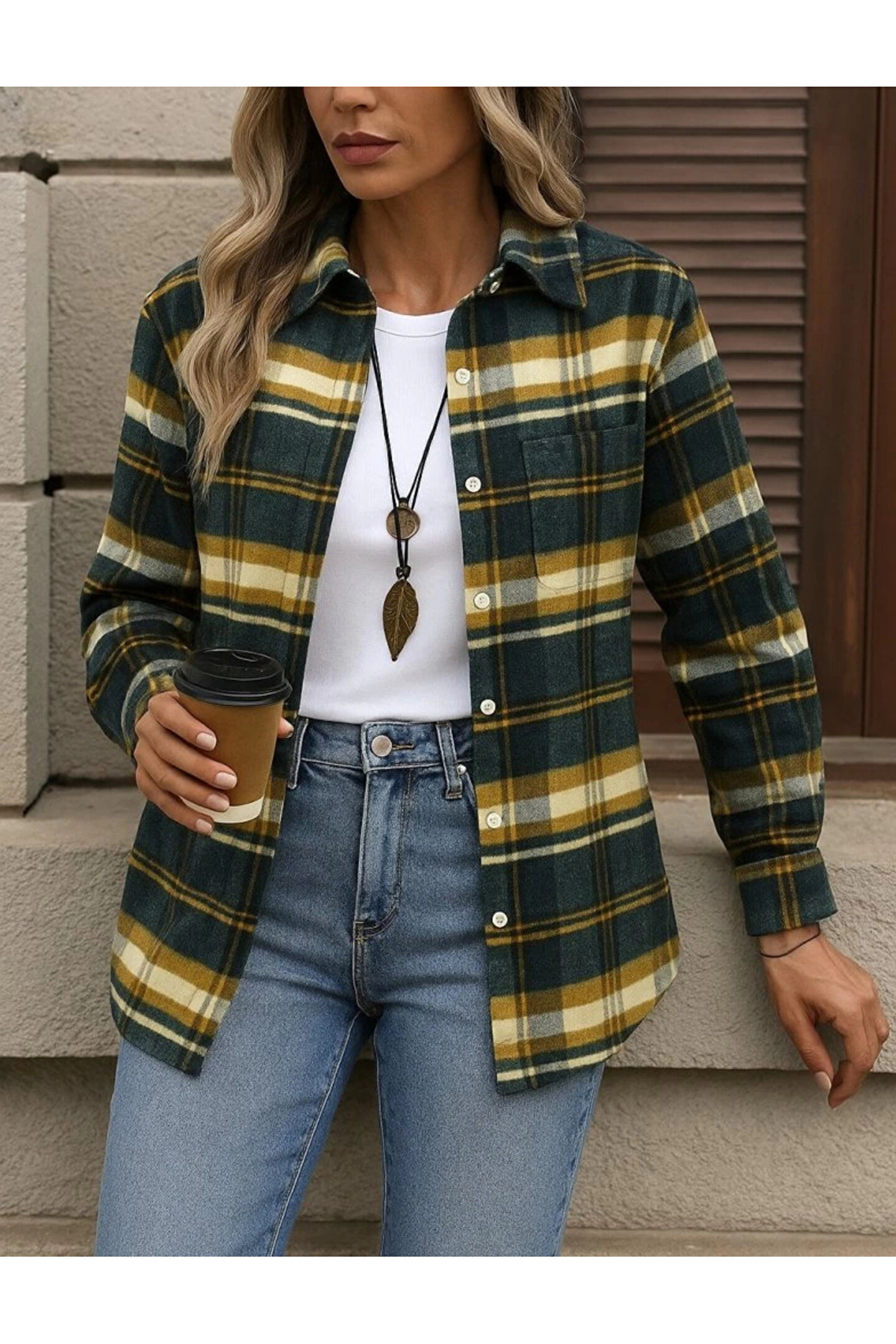 Kadın Uzun Kollu Kare Desenli önden Düğmeli Dokuma Gömlek