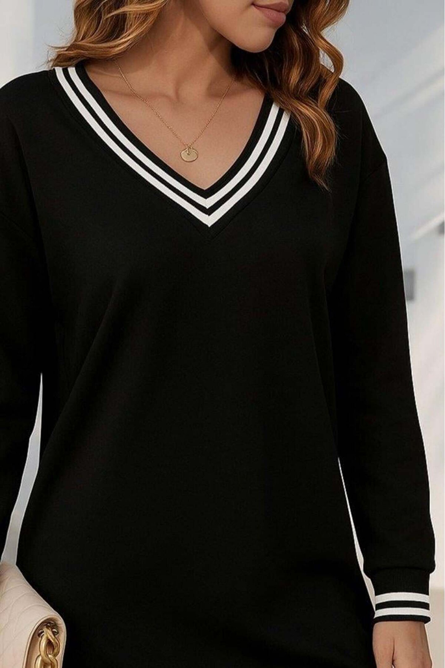babatr.com Kadın Uzun Kollu V Yakalı şerit Detaylı Kısa Viskon Iki Iplik Elbise