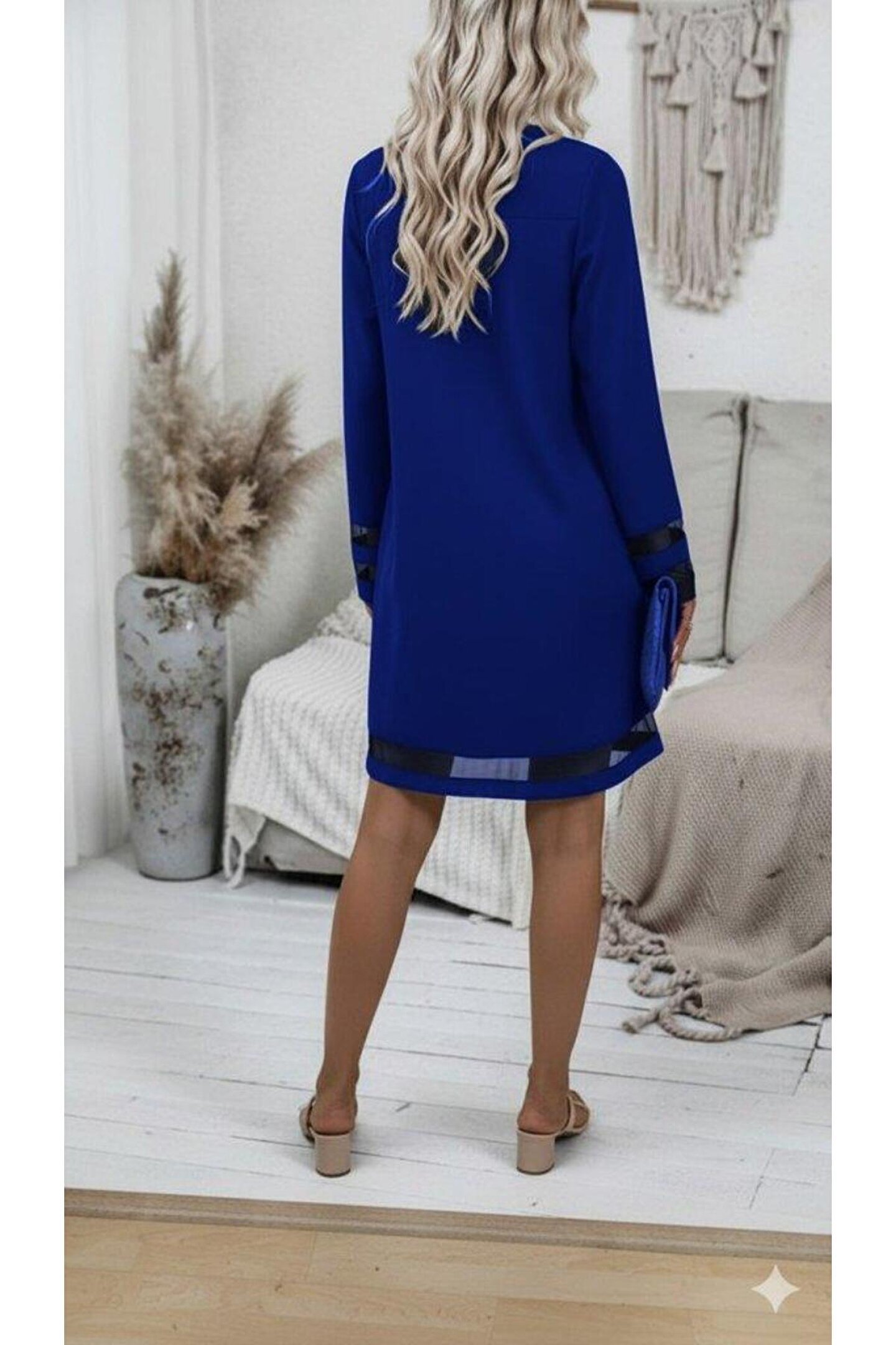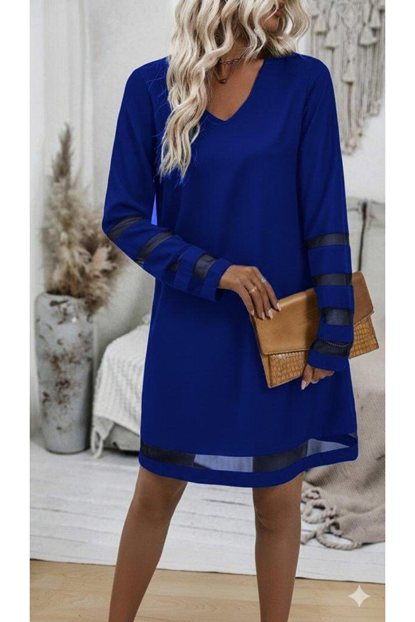 Kadın Uzun Kollu V Yakalı Tül şerit Detaylı Mini Krep Elbise