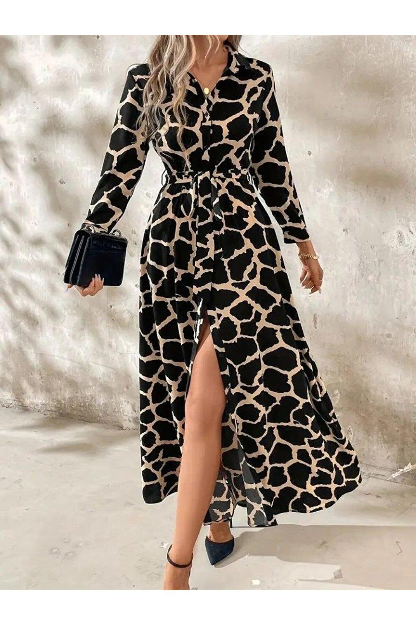 babatr.com Kadın Uzun Kollu Yakalı önü Düğmeli Desenli Belden Kuşaklı Uzun Süprem Elbise