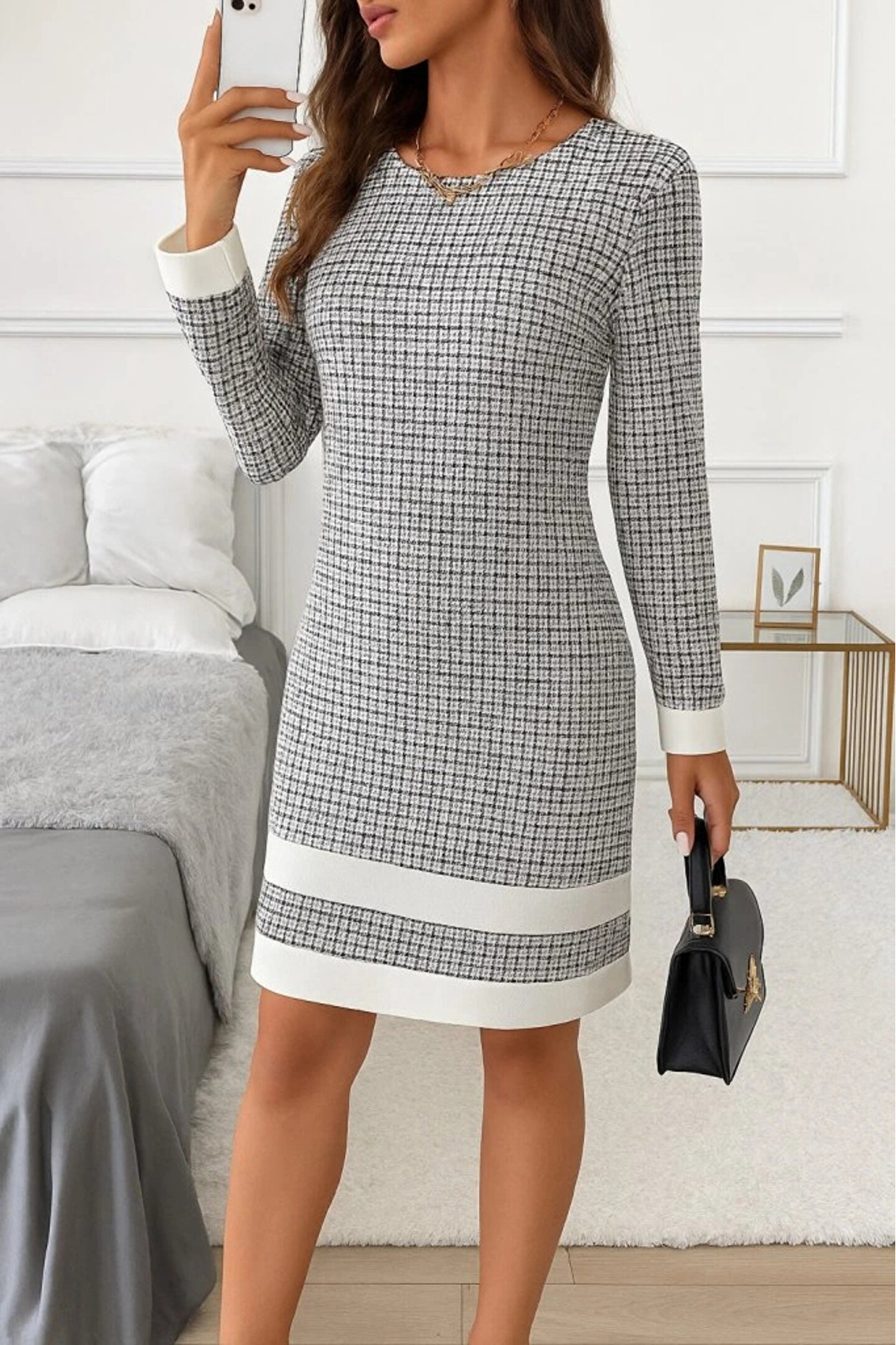 Kadın Uzun Kollu Yuvarlak Yaka Etek Ucu şerit Detaylı Mini Dokuma Elbise