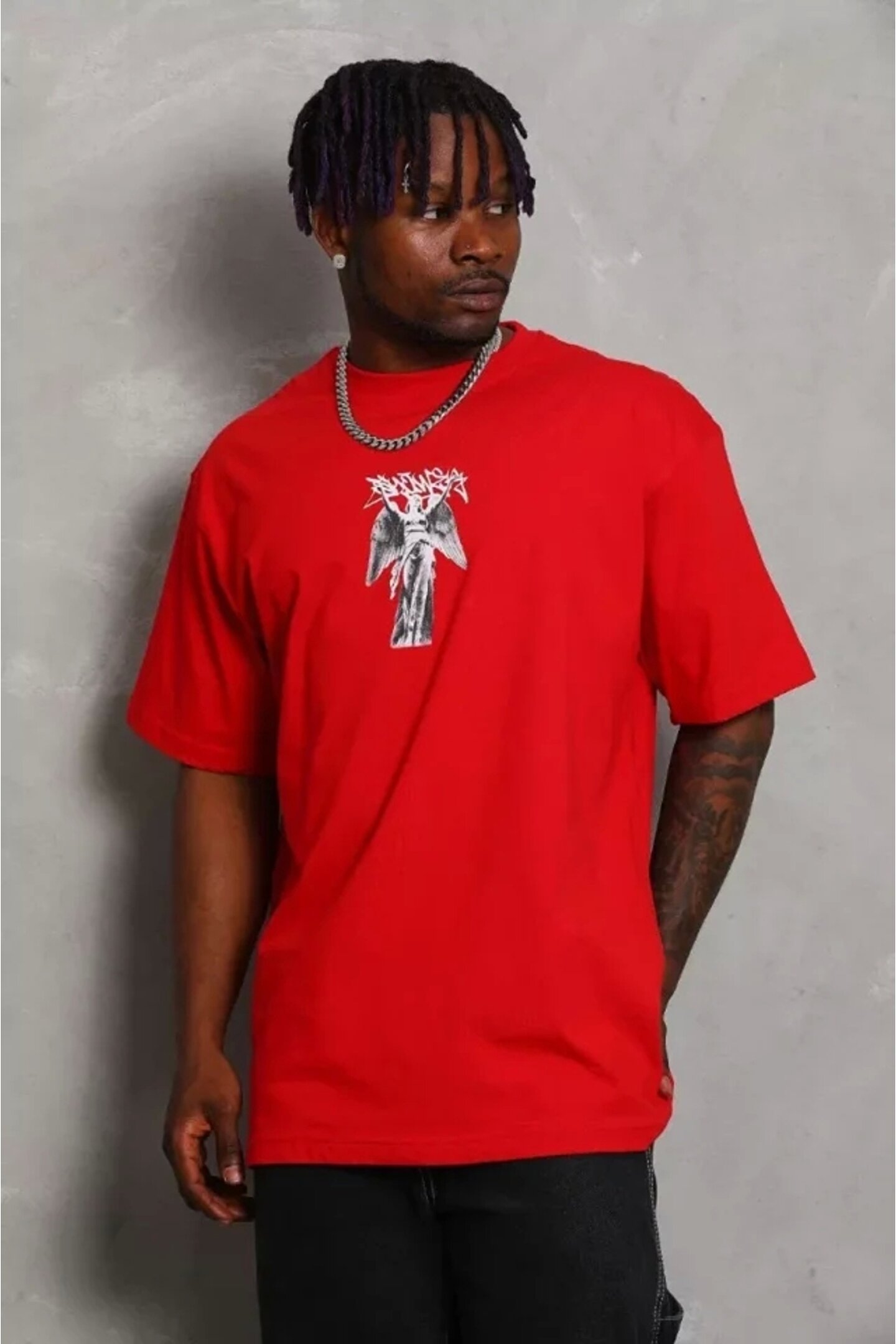 babatr.com Unisex Oversize Baskılı Bisiklet Yaka T-Shirt - Kırmızı
