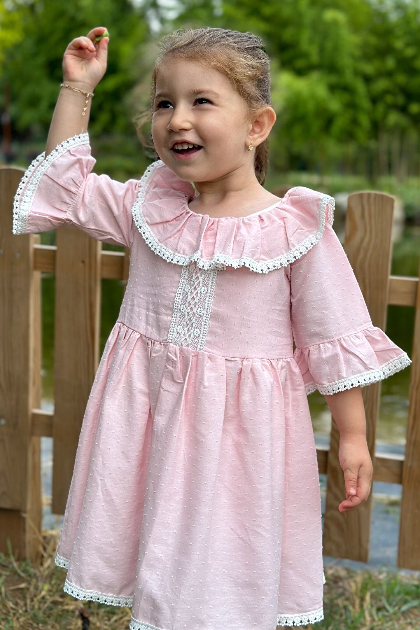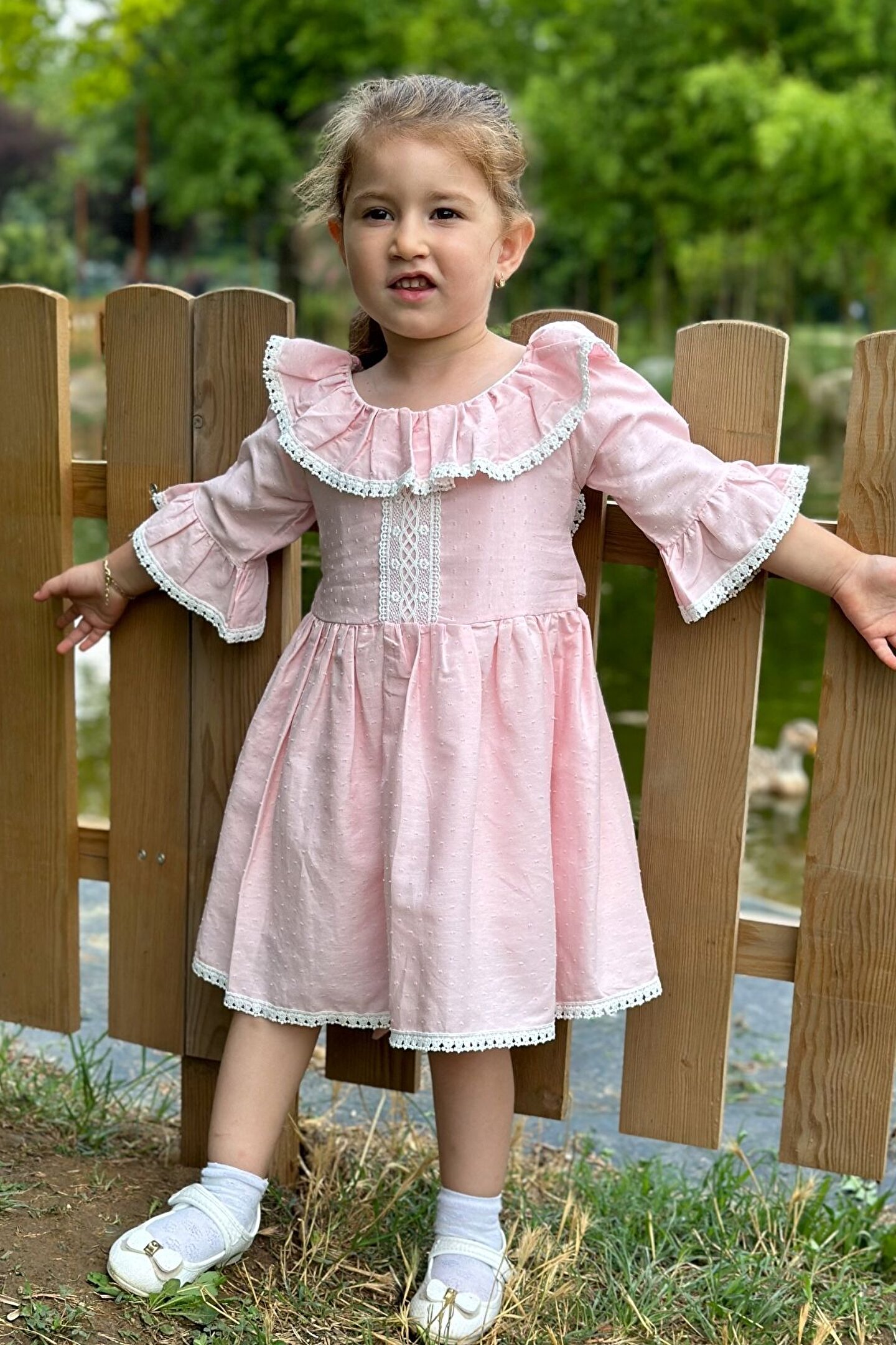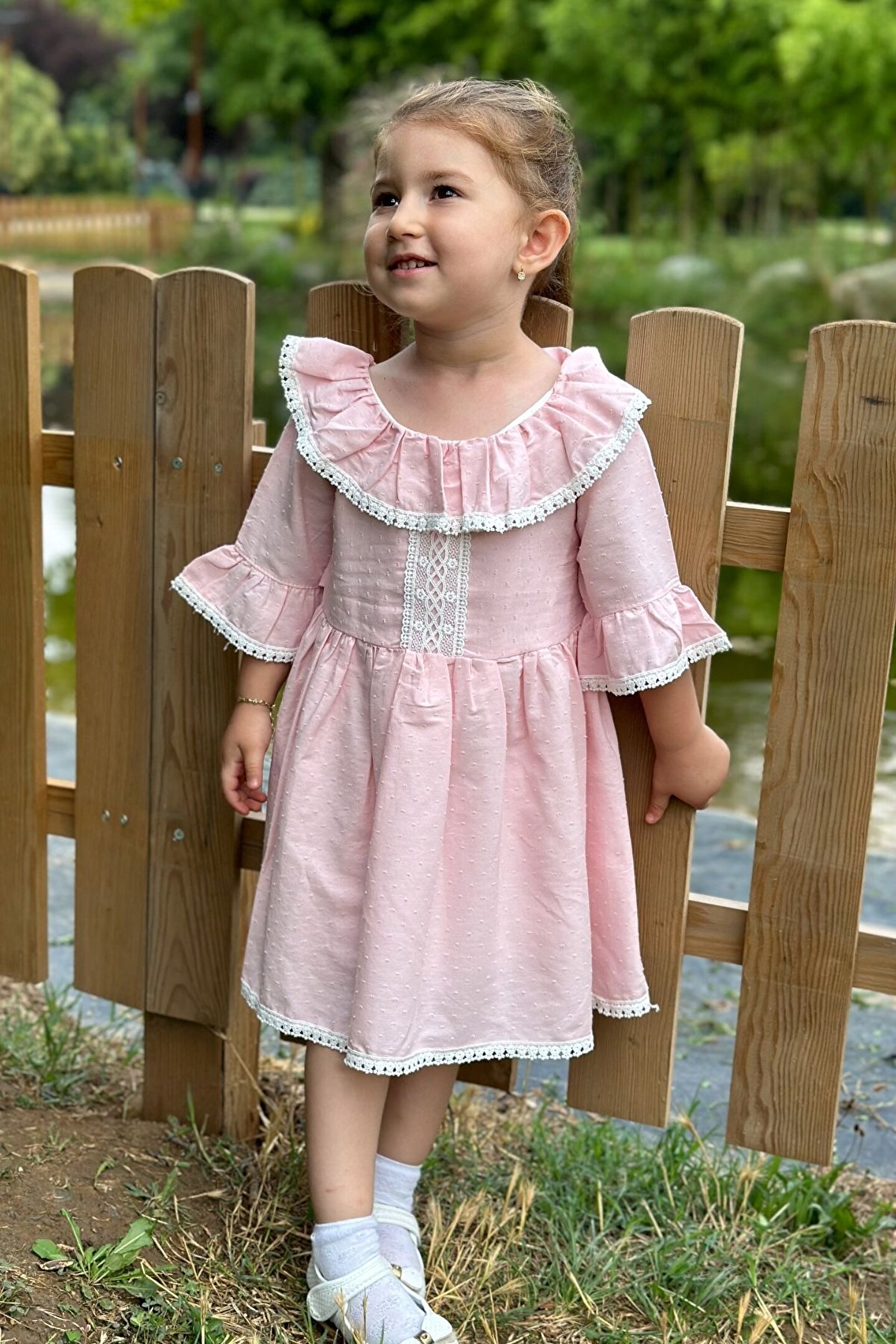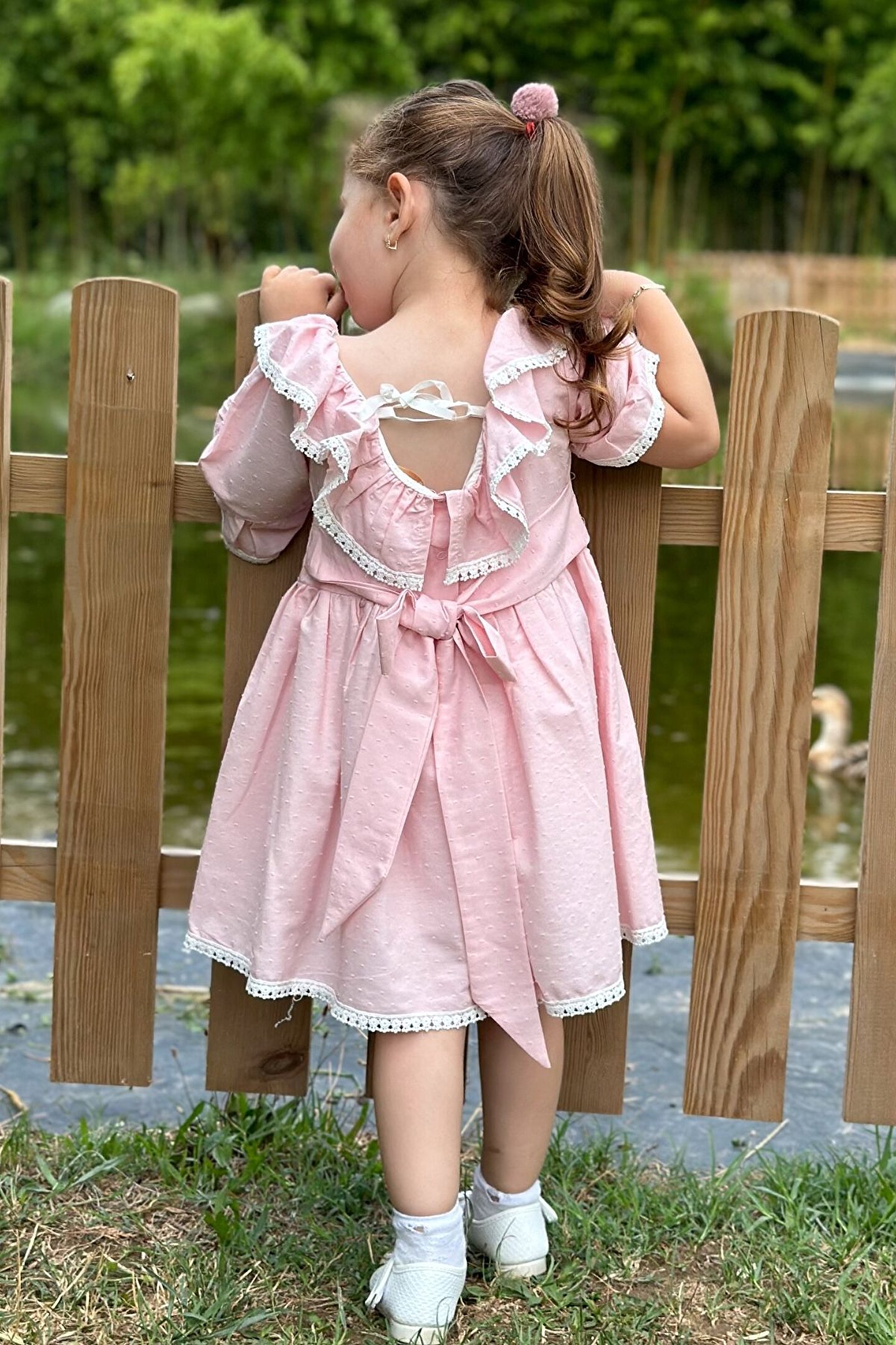 Yazlık Kısa Kollu Dantel Detaylı Kız Çocuk Elbisesi: Küçük prensesinizin yaz mevsiminde özel günlerde zarafetini ve şıklığını ön plana çıkaracak bu elbise, önünde bulunan fiyonk detayı ve dantel işlemeleriyle tasarlanmıştır.; Ayrıca etek kısmında bulunan yırtmaç detayı, hareket özgürlüğü sağlarken bebeğinizin zarif bir görünüm sergilemesini sağlar.; Özellikler: Dantel Detaylar: Elbisenin ön kısmında ve kollarda bulunan dantel detaylar, zarafet ve incelik katarken, küçük prensesinizin görünümünü daha etkileyici hale getirir.; Önünde Fiyonk Detayı: Elbisenin ön kısmında bulunan fiyonk detayı, sevimliliği ve şıklığı artırır.; Küçük prensesinizin görünümüne hoş bir dokunuş ekler.; Yırtmaç Detayı: Etek kısmında bulunan yırtmaç detayı, hareket özgürlüğü sağlarken, elbisenin tasarımına dinamizm katar.; Kısa Kollu Tasarım: Sıcak yaz günlerinde rahatlıkla giyilebilecek kısa kollu tasarım, bebeğinizin serin kalmasını sağlar ve özgürce hareket etmesine olanak tanır.; Yazlık Kullanıma Uygun: Hafif yapısı ve nefes alabilen kumaşıyla yaz aylarında rahatlıkla giyilebilir.; Özel Günler İçin Uygun: Özel günlerde tercih edilebilecek şık tasarımıyla bebeğinizin her anında göz kamaştırmasını sağlar.; Bu yırtmaçlı, önü fiyonklu ve dantel detaylı kısa kollu kız çocuk elbisesi, küçük prensesinizin yazın serin ve şık kalmasını sağlarken, aynı zamanda özel günlerde de zarafetini tamamlar.; Zarif detaylarıyla bezenmiş bu elbise, bebeğinizin tarzını ve güzelliğini ön plana çıkarır.