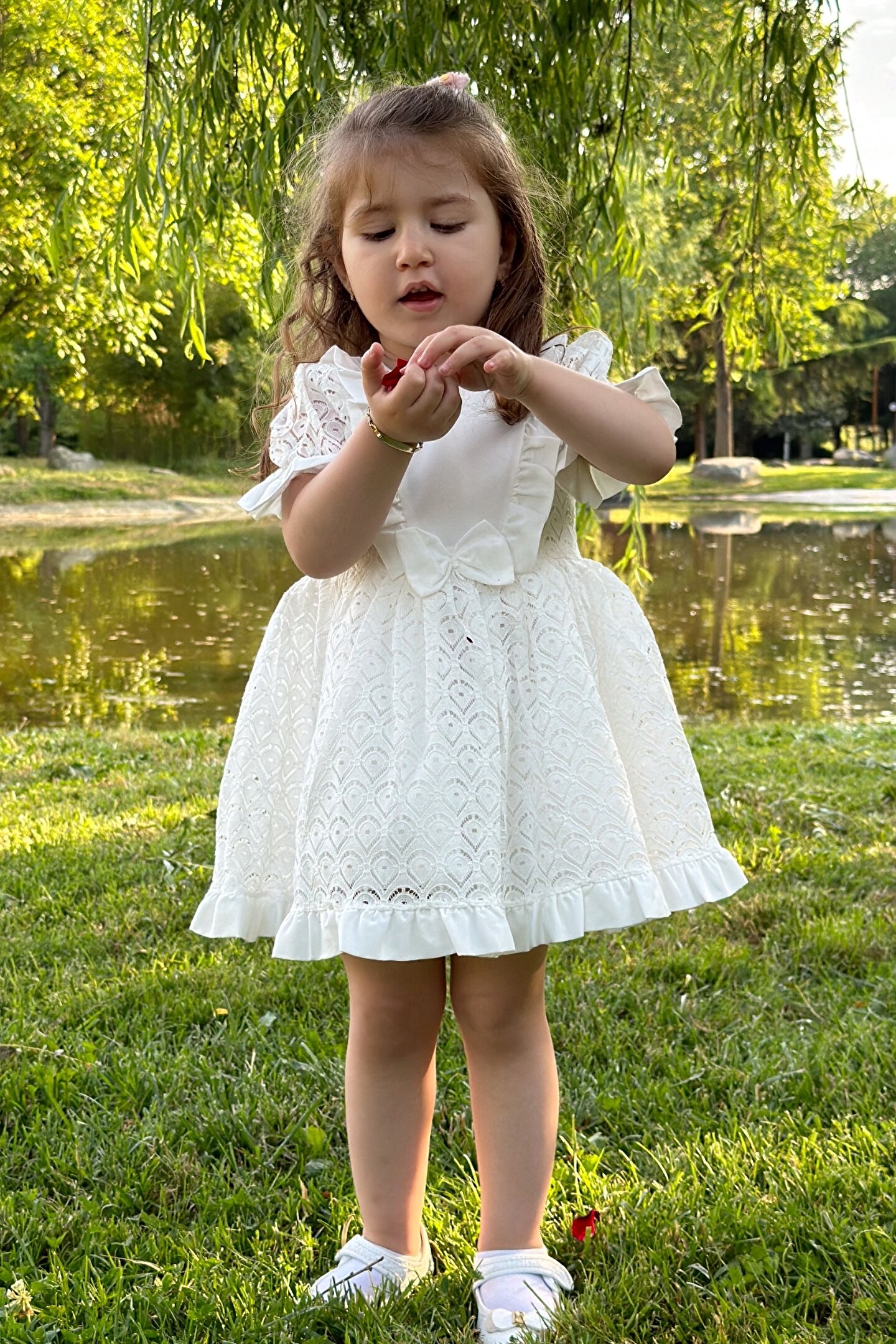 Yazlık Kısa Kollu Dantel Detaylı Kız Çocuk Elbisesi: Küçük prensesinizin yaz mevsiminde özel günlerde zarafetini ve şıklığını ön plana çıkaracak bu elbise, önünde bulunan fiyonk detayı ve dantel işlemeleriyle tasarlanmıştır. ; Ayrıca etek kısmında bulunan yırtmaç detayı, hareket özgürlüğü sağlarken bebeğinizin zarif bir görünüm sergilemesini sağlar. ; Özellikler: Dantel Detaylar: Elbisenin ön kısmında ve kollarda bulunan dantel detaylar, zarafet ve incelik katarken, küçük prensesinizin görünümünü daha etkileyici hale getirir. ; Önünde Fiyonk Detayı: Elbisenin ön kısmında bulunan fiyonk detayı, sevimliliği ve şıklığı artırır. ; Küçük prensesinizin görünümüne hoş bir dokunuş ekler. ; Yırtmaç Detayı: Etek kısmında bulunan yırtmaç detayı, hareket özgürlüğü sağlarken, elbisenin tasarımına dinamizm katar. ; Kısa Kollu Tasarım: Sıcak yaz günlerinde rahatlıkla giyilebilecek kısa kollu tasarım, bebeğinizin serin kalmasını sağlar ve özgürce hareket etmesine olanak tanır. ; Yazlık Kullanıma Uygun: Hafif yapısı ve nefes alabilen kumaşıyla yaz aylarında rahatlıkla giyilebilir. ; Özel Günler İçin Uygun: Özel günlerde tercih edilebilecek şık tasarımıyla bebeğinizin her anında göz kamaştırmasını sağlar. ; Bu yırtmaçlı, önü fiyonklu ve dantel detaylı kısa kollu kız çocuk elbisesi, küçük prensesinizin yazın serin ve şık kalmasını sağlarken, aynı zamanda özel günlerde de zarafetini tamamlar. ; Zarif detaylarıyla bezenmiş bu elbise, bebeğinizin tarzını ve güzelliğini ön plana çıkarır.;