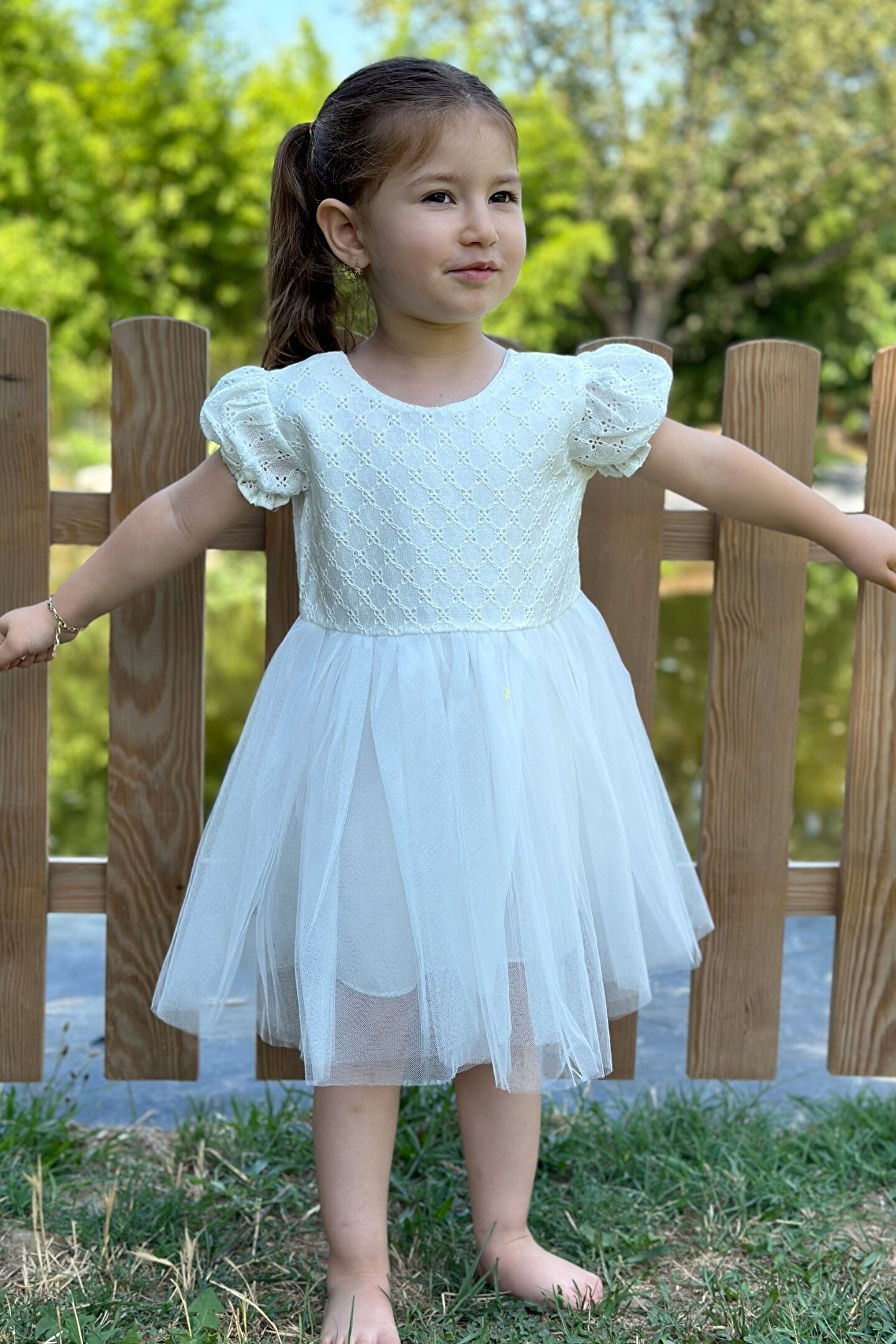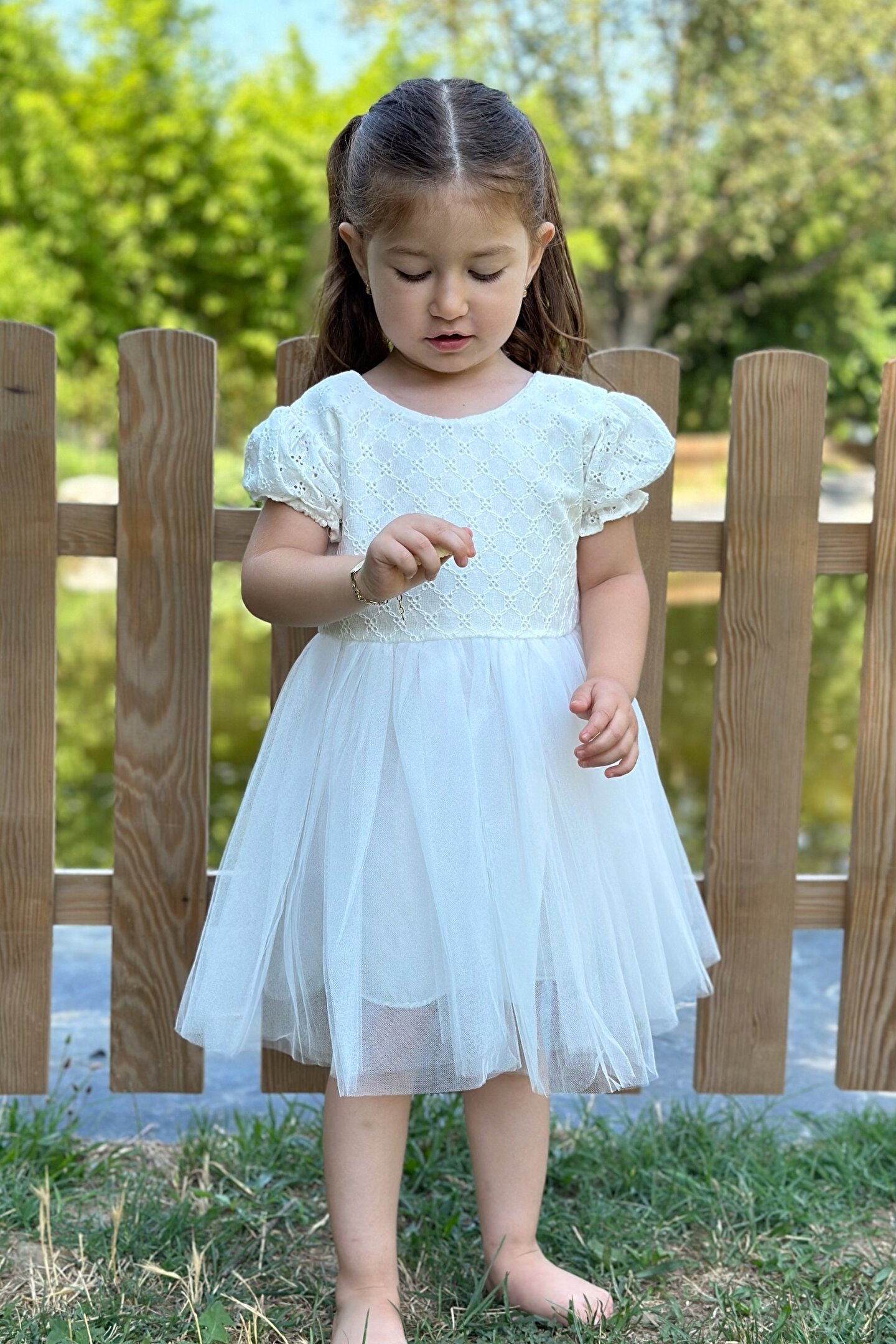 Yazlık Kısa Kollu Dantel Detaylı Kız Çocuk Elbisesi: Küçük prensesinizin yaz mevsiminde özel günlerde zarafetini ve şıklığını ön plana çıkaracak bu elbise, önünde bulunan fiyonk detayı ve dantel işlemeleriyle tasarlanmıştır.; Ayrıca etek kısmında bulunan yırtmaç detayı, hareket özgürlüğü sağlarken bebeğinizin zarif bir görünüm sergilemesini sağlar.; Özellikler: Dantel Detaylar: Elbisenin ön kısmında ve kollarda bulunan dantel detaylar, zarafet ve incelik katarken, küçük prensesinizin görünümünü daha etkileyici hale getirir.; Önünde Fiyonk Detayı: Elbisenin ön kısmında bulunan fiyonk detayı, sevimliliği ve şıklığı artırır.; Küçük prensesinizin görünümüne hoş bir dokunuş ekler.; Yırtmaç Detayı: Etek kısmında bulunan yırtmaç detayı, hareket özgürlüğü sağlarken, elbisenin tasarımına dinamizm katar.; Kısa Kollu Tasarım: Sıcak yaz günlerinde rahatlıkla giyilebilecek kısa kollu tasarım, bebeğinizin serin kalmasını sağlar ve özgürce hareket etmesine olanak tanır.; Yazlık Kullanıma Uygun: Hafif yapısı ve nefes alabilen kumaşıyla yaz aylarında rahatlıkla giyilebilir.; Özel Günler İçin Uygun: Özel günlerde tercih edilebilecek şık tasarımıyla bebeğinizin her anında göz kamaştırmasını sağlar.; Bu yırtmaçlı, önü fiyonklu ve dantel detaylı kısa kollu kız çocuk elbisesi, küçük prensesinizin yazın serin ve şık kalmasını sağlarken, aynı zamanda özel günlerde de zarafetini tamamlar.; Zarif detaylarıyla bezenmiş bu elbise, bebeğinizin tarzını ve güzelliğini ön plana çıkarır.