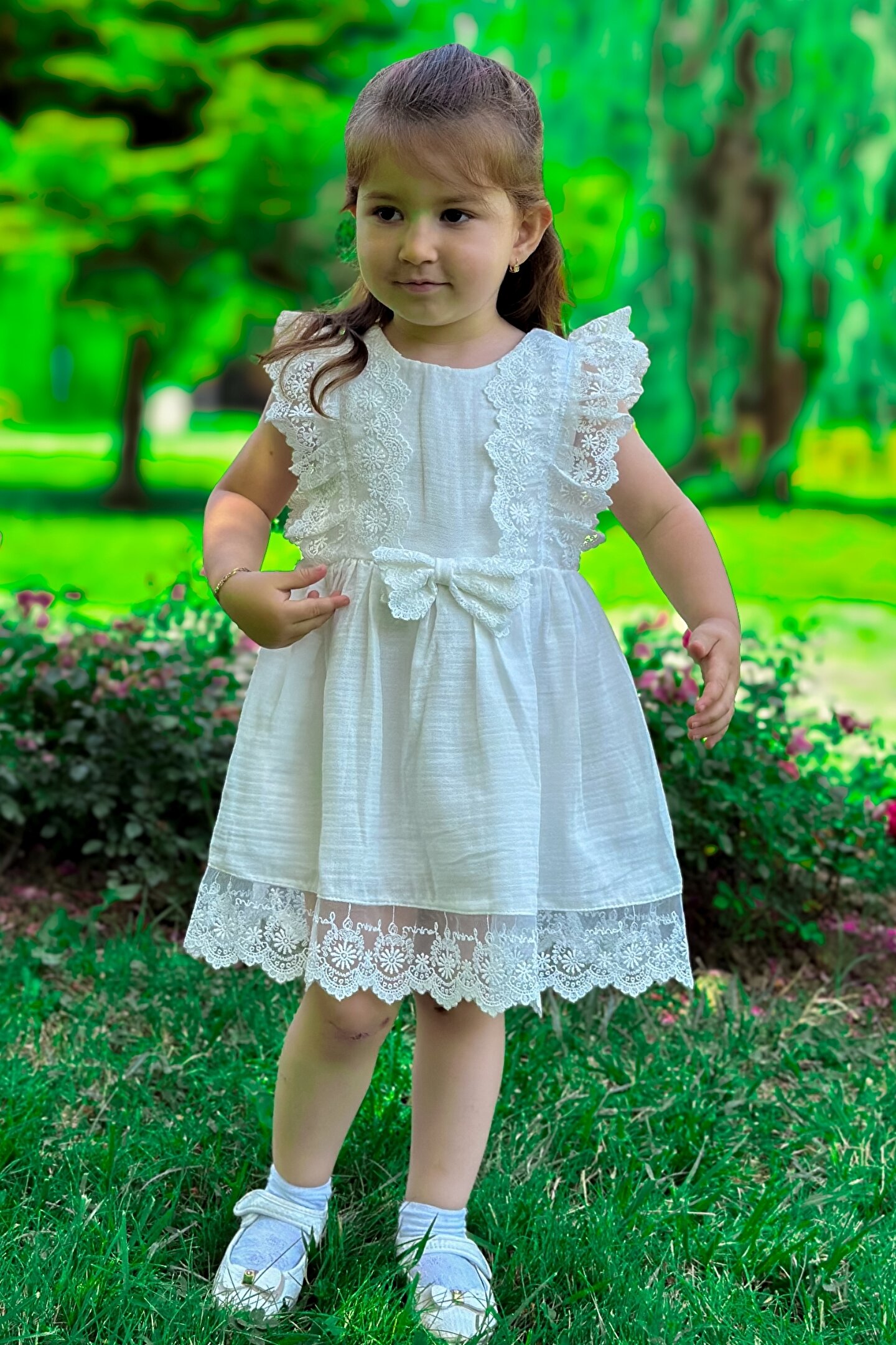 Yazlık Kısa Kollu Dantel Detaylı Kız Çocuk Elbisesi: Küçük prensesinizin yaz mevsiminde özel günlerde zarafetini ve şıklığını ön plana çıkaracak bu elbise, önünde bulunan fiyonk detayı ve dantel işlemeleriyle tasarlanmıştır. ; Ayrıca etek kısmında bulunan yırtmaç detayı, hareket özgürlüğü sağlarken bebeğinizin zarif bir görünüm sergilemesini sağlar. ; Özellikler: Dantel Detaylar: Elbisenin ön kısmında ve kollarda bulunan dantel detaylar, zarafet ve incelik katarken, küçük prensesinizin görünümünü daha etkileyici hale getirir. ; Önünde Fiyonk Detayı: Elbisenin ön kısmında bulunan fiyonk detayı, sevimliliği ve şıklığı artırır. ; Küçük prensesinizin görünümüne hoş bir dokunuş ekler. ; Yırtmaç Detayı: Etek kısmında bulunan yırtmaç detayı, hareket özgürlüğü sağlarken, elbisenin tasarımına dinamizm katar. ; Kısa Kollu Tasarım: Sıcak yaz günlerinde rahatlıkla giyilebilecek kısa kollu tasarım, bebeğinizin serin kalmasını sağlar ve özgürce hareket etmesine olanak tanır. ; Yazlık Kullanıma Uygun: Hafif yapısı ve nefes alabilen kumaşıyla yaz aylarında rahatlıkla giyilebilir. ; Özel Günler İçin Uygun: Özel günlerde tercih edilebilecek şık tasarımıyla bebeğinizin her anında göz kamaştırmasını sağlar. ; Bu yırtmaçlı, önü fiyonklu ve dantel detaylı kısa kollu kız çocuk elbisesi, küçük prensesinizin yazın serin ve şık kalmasını sağlarken, aynı zamanda özel günlerde de zarafetini tamamlar. ; Zarif detaylarıyla bezenmiş bu elbise, bebeğinizin tarzını ve güzelliğini ön plana çıkarır.;