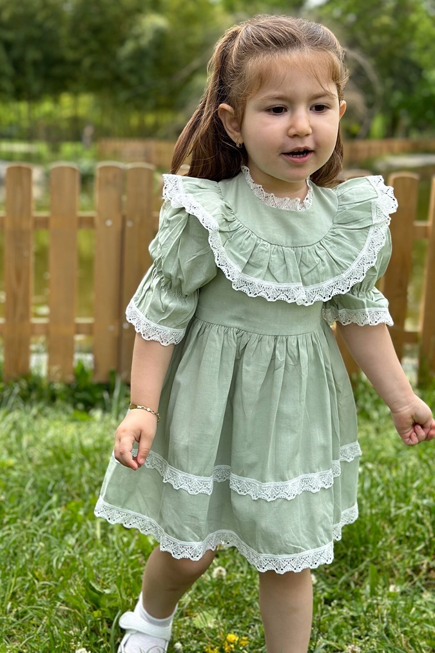 "Yazlık Kısa Kollu Dantel Detaylı Kız Çocuk Elbisesi: Küçük prensesinizin yaz mevsiminde özel günlerde zarafetini ve şıklığını ön plana çıkaracak bu elbise, önünde bulunan fiyonk detayı ve dantel işlemeleriyle tasarlanmıştır. ; Ayrıca etek kısmında bulunan yırtmaç detayı, hareket özgürlüğü sağlarken bebeğinizin zarif bir görünüm sergilemesini sağlar. ; Özellikler: Dantel Detaylar: Elbisenin ön kısmında ve kollarda bulunan dantel detaylar, zarafet ve incelik katarken, küçük prensesinizin görünümünü daha etkileyici hale getirir. ; Önünde Fiyonk Detayı: Elbisenin ön kısmında bulunan fiyonk detayı, sevimliliği ve şıklığı artırır. ; Küçük prensesinizin görünümüne hoş bir dokunuş ekler. ; Yırtmaç Detayı: Etek kısmında bulunan yırtmaç detayı, hareket özgürlüğü sağlarken, elbisenin tasarımına dinamizm katar. ; Kısa Kollu Tasarım: Sıcak yaz günlerinde rahatlıkla giyilebilecek kısa kollu tasarım, bebeğinizin serin kalmasını sağlar ve özgürce hareket etmesine olanak tanır. ; Yazlık Kullanıma Uygun: Hafif yapısı ve nefes alabilen kumaşıyla yaz aylarında rahatlıkla giyilebilir. ; Özel Günler İçin Uygun: Özel günlerde tercih edilebilecek şık tasarımıyla bebeğinizin her anında göz kamaştırmasını sağlar. ; Bu yırtmaçlı, önü fiyonklu ve dantel detaylı kısa kollu kız çocuk elbisesi, küçük prensesinizin yazın serin ve şık kalmasını sağlarken, aynı zamanda özel günlerde de zarafetini tamamlar. ; Zarif detaylarıyla bezenmiş bu elbise, bebeğinizin tarzını ve güzelliğini ön plana çıkarır.";