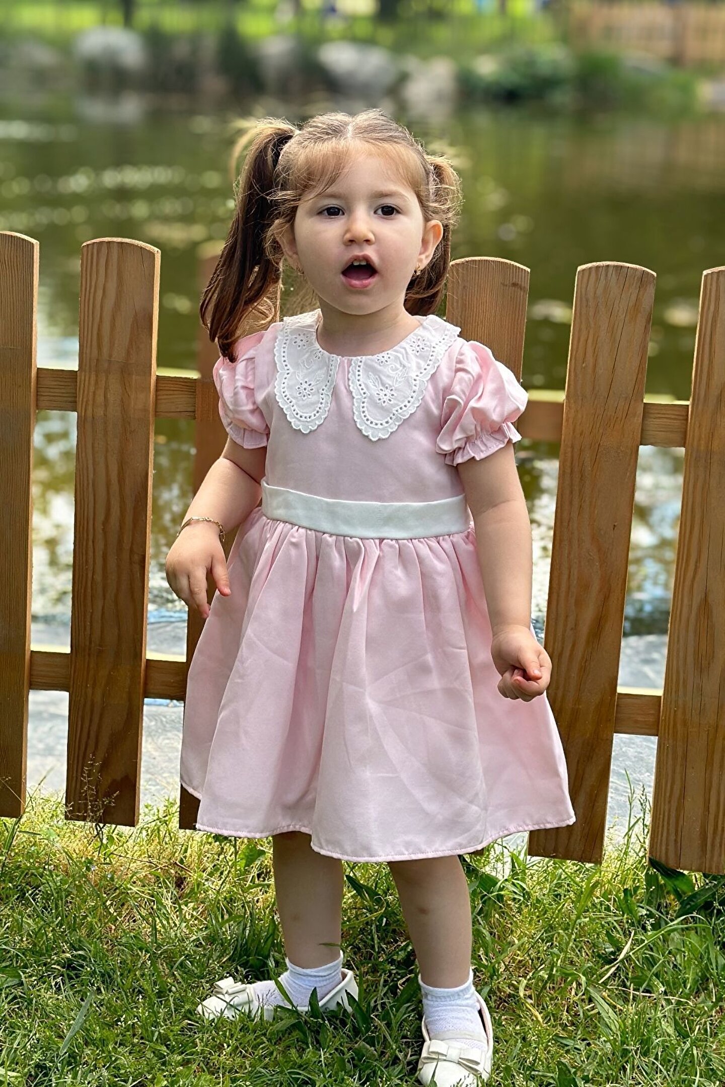 "Yazlık Kısa Kollu Dantel Detaylı Kız Çocuk Elbisesi: Küçük prensesinizin yaz mevsiminde özel günlerde zarafetini ve şıklığını ön plana çıkaracak bu elbise, önünde bulunan fiyonk detayı ve dantel işlemeleriyle tasarlanmıştır. ; Ayrıca etek kısmında bulunan yırtmaç detayı, hareket özgürlüğü sağlarken bebeğinizin zarif bir görünüm sergilemesini sağlar. ; Özellikler: Dantel Detaylar: Elbisenin ön kısmında ve kollarda bulunan dantel detaylar, zarafet ve incelik katarken, küçük prensesinizin görünümünü daha etkileyici hale getirir. ; Önünde Fiyonk Detayı: Elbisenin ön kısmında bulunan fiyonk detayı, sevimliliği ve şıklığı artırır. ; Küçük prensesinizin görünümüne hoş bir dokunuş ekler. ; Yırtmaç Detayı: Etek kısmında bulunan yırtmaç detayı, hareket özgürlüğü sağlarken, elbisenin tasarımına dinamizm katar. ; Kısa Kollu Tasarım: Sıcak yaz günlerinde rahatlıkla giyilebilecek kısa kollu tasarım, bebeğinizin serin kalmasını sağlar ve özgürce hareket etmesine olanak tanır. ; Yazlık Kullanıma Uygun: Hafif yapısı ve nefes alabilen kumaşıyla yaz aylarında rahatlıkla giyilebilir. ; Özel Günler İçin Uygun: Özel günlerde tercih edilebilecek şık tasarımıyla bebeğinizin her anında göz kamaştırmasını sağlar. ; Bu yırtmaçlı, önü fiyonklu ve dantel detaylı kısa kollu kız çocuk elbisesi, küçük prensesinizin yazın serin ve şık kalmasını sağlarken, aynı zamanda özel günlerde de zarafetini tamamlar. ; Zarif detaylarıyla bezenmiş bu elbise, bebeğinizin tarzını ve güzelliğini ön plana çıkarır.";