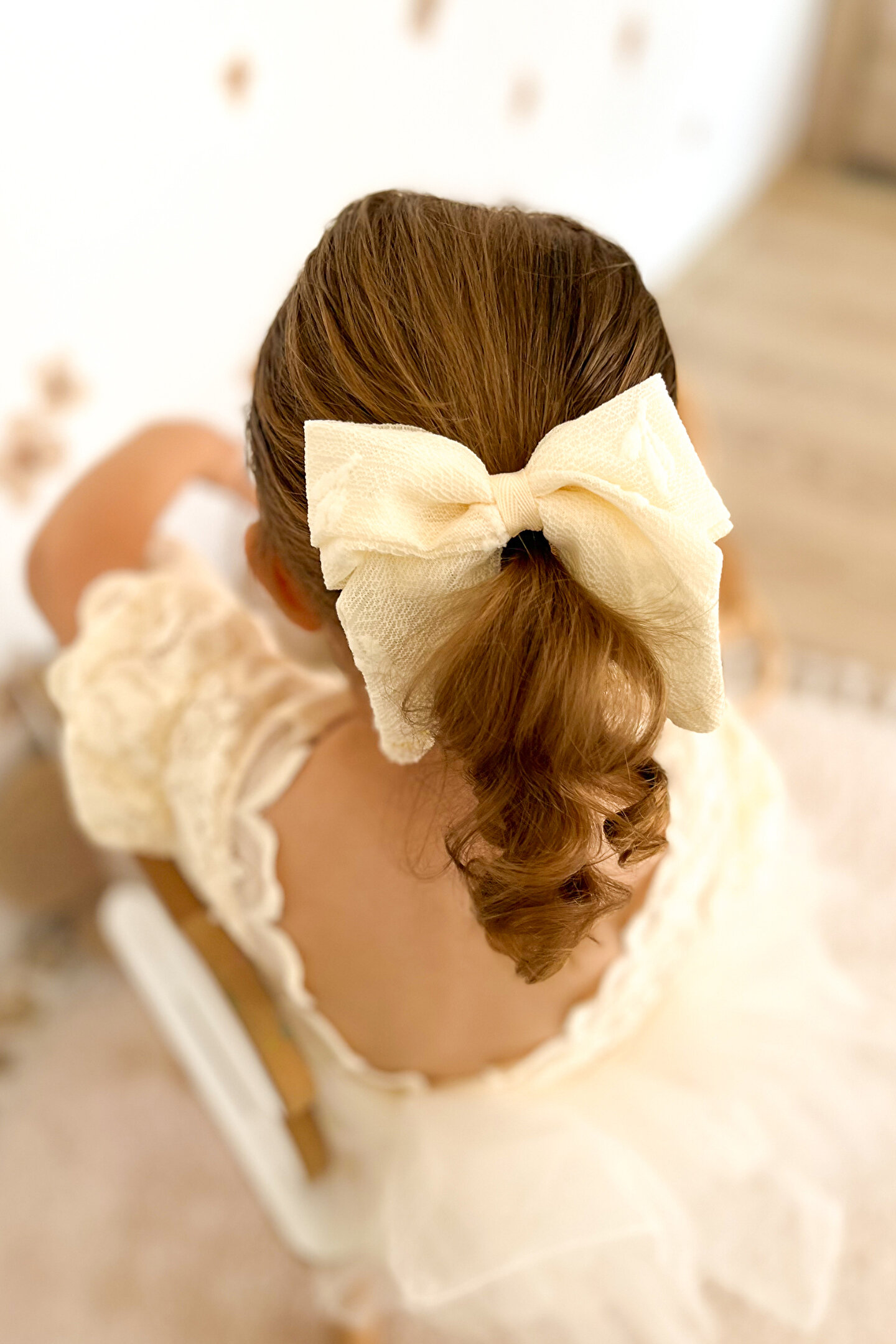 Yazlık Kısa Kollu Dantel Detaylı Kız Çocuk Elbisesi: Küçük prensesinizin yaz mevsiminde özel günlerde zarafetini ve şıklığını ön plana çıkaracak bu elbise, önünde bulunan fiyonk detayı ve dantel işlemeleriyle tasarlanmıştır.; Ayrıca etek kısmında bulunan yırtmaç detayı, hareket özgürlüğü sağlarken bebeğinizin zarif bir görünüm sergilemesini sağlar.; Özellikler: Dantel Detaylar: Elbisenin ön kısmında ve kollarda bulunan dantel detaylar, zarafet ve incelik katarken, küçük prensesinizin görünümünü daha etkileyici hale getirir.; Önünde Fiyonk Detayı: Elbisenin ön kısmında bulunan fiyonk detayı, sevimliliği ve şıklığı artırır.; Küçük prensesinizin görünümüne hoş bir dokunuş ekler.; Yırtmaç Detayı: Etek kısmında bulunan yırtmaç detayı, hareket özgürlüğü sağlarken, elbisenin tasarımına dinamizm katar.; Kısa Kollu Tasarım: Sıcak yaz günlerinde rahatlıkla giyilebilecek kısa kollu tasarım, bebeğinizin serin kalmasını sağlar ve özgürce hareket etmesine olanak tanır.; Yazlık Kullanıma Uygun: Hafif yapısı ve nefes alabilen kumaşıyla yaz aylarında rahatlıkla giyilebilir.; Özel Günler İçin Uygun: Özel günlerde tercih edilebilecek şık tasarımıyla bebeğinizin her anında göz kamaştırmasını sağlar.; Bu yırtmaçlı, önü fiyonklu ve dantel detaylı kısa kollu kız çocuk elbisesi, küçük prensesinizin yazın serin ve şık kalmasını sağlarken, aynı zamanda özel günlerde de zarafetini tamamlar.; Zarif detaylarıyla bezenmiş bu elbise, bebeğinizin tarzını ve güzelliğini ön plana çıkarır.