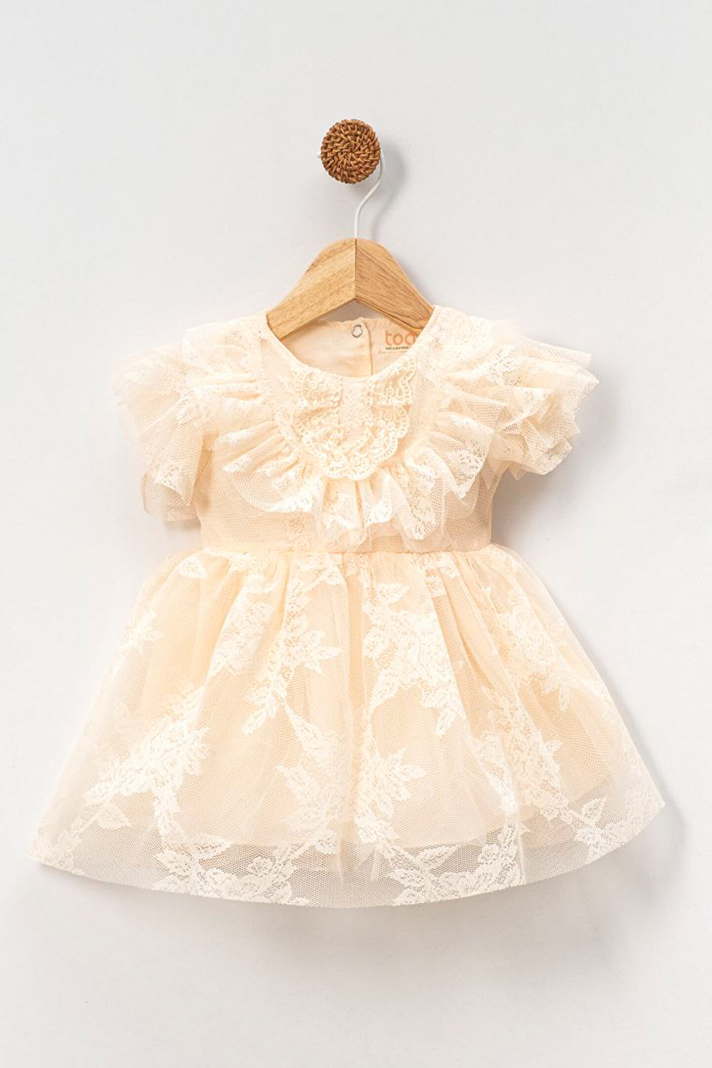 Yazlık Kısa Kollu Kolsuz Askılı Dantel Detaylı Astarlı Kız Çocuk Elbisesi: Küçük prensesinizin yaz mevsiminde özel günlerde zarafetini ve şıklığını ön plana çıkaracak bu elbise, önünde bulunan fiyonk detayı ve dantel işlemeleriyle tasarlanmıştır.; Ayrıca etek kısmında bulunan yırtmaç detayı, hareket özgürlüğü sağlarken bebeğinizin zarif bir görünüm sergilemesini sağlar.; Özellikler: Dantel Detaylar: Elbisenin ön kısmında ve kollarda bulunan dantel detaylar, zarafet ve incelik katarken, küçük prensesinizin görünümünü daha etkileyici hale getirir.; Önünde Fiyonk Detayı: Elbisenin ön kısmında bulunan fiyonk detayı, sevimliliği ve şıklığı artırır.; Küçük prensesinizin görünümüne hoş bir dokunuş ekler.; Yırtmaç Detayı: Etek kısmında bulunan yırtmaç detayı, hareket özgürlüğü sağlarken, elbisenin tasarımına dinamizm katar.; Kısa Kollu Tasarım: Sıcak yaz günlerinde rahatlıkla giyilebilecek kısa kollu tasarım, bebeğinizin serin kalmasını sağlar ve özgürce hareket etmesine olanak tanır.; Yazlık Kullanıma Uygun: Hafif yapısı ve nefes alabilen kumaşıyla yaz aylarında rahatlıkla giyilebilir.; Özel Günler İçin Uygun: Özel günlerde tercih edilebilecek şık tasarımıyla bebeğinizin her anında göz kamaştırmasını sağlar.; Bu yırtmaçlı, önü fiyonklu ve dantel detaylı kısa kollu Kolsuz Askılı kız çocuk elbisesi, küçük prensesinizin yazın serin ve şık kalmasını sağlarken, aynı zamanda özel günlerde de zarafetini tamamlar.; Zarif detaylarıyla bezenmiş bu elbise, bebeğinizin tarzını ve güzelliğini ön plana çıkarır.