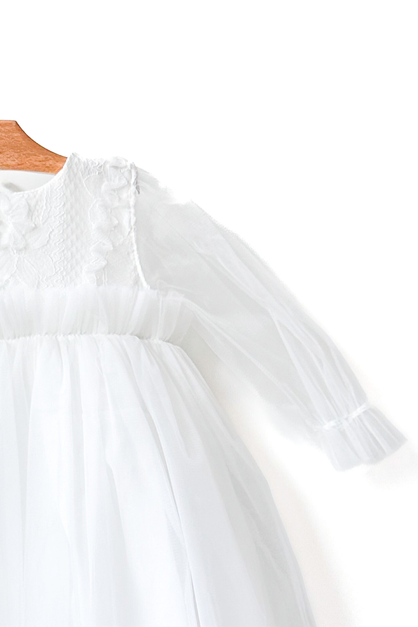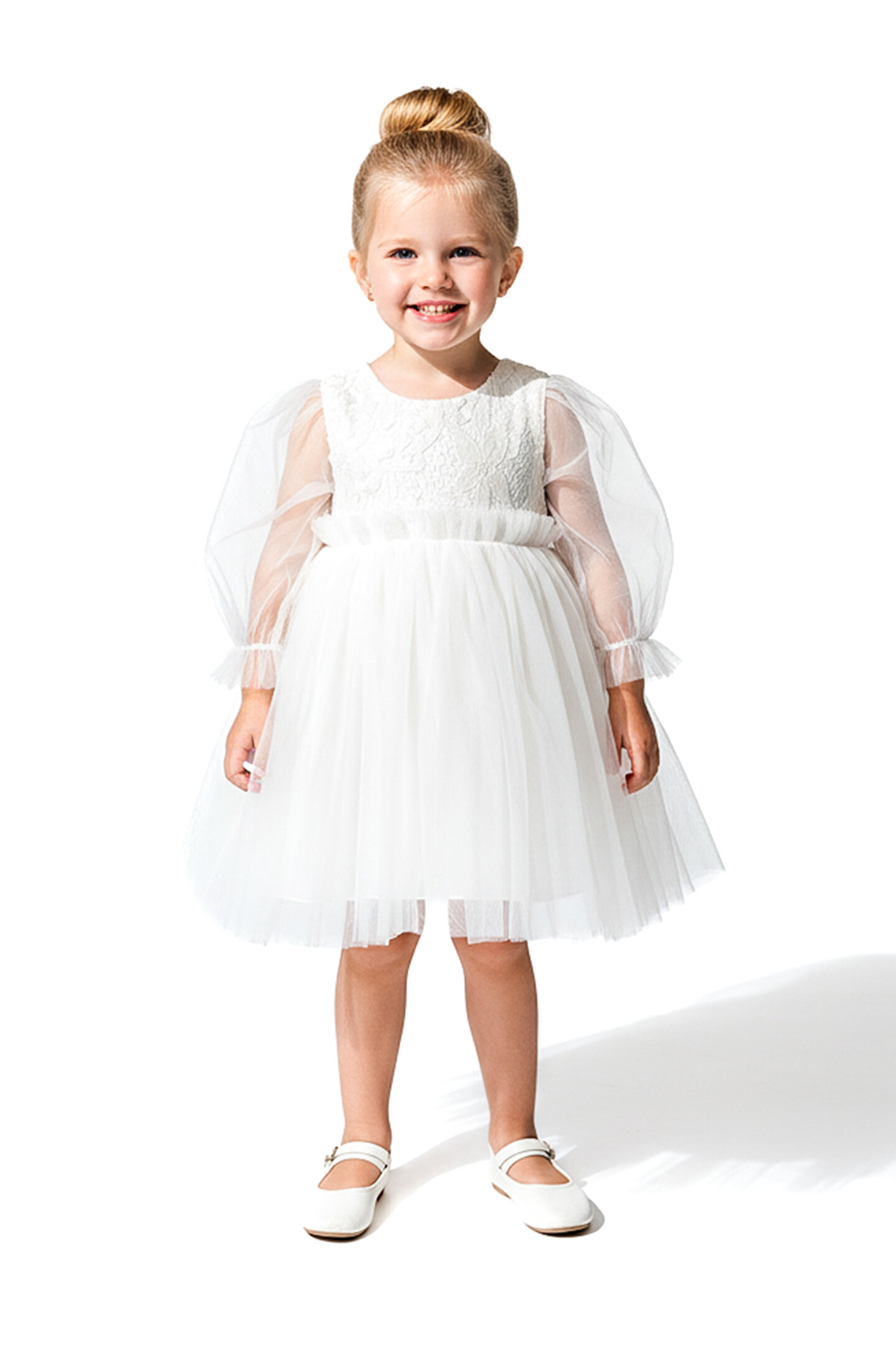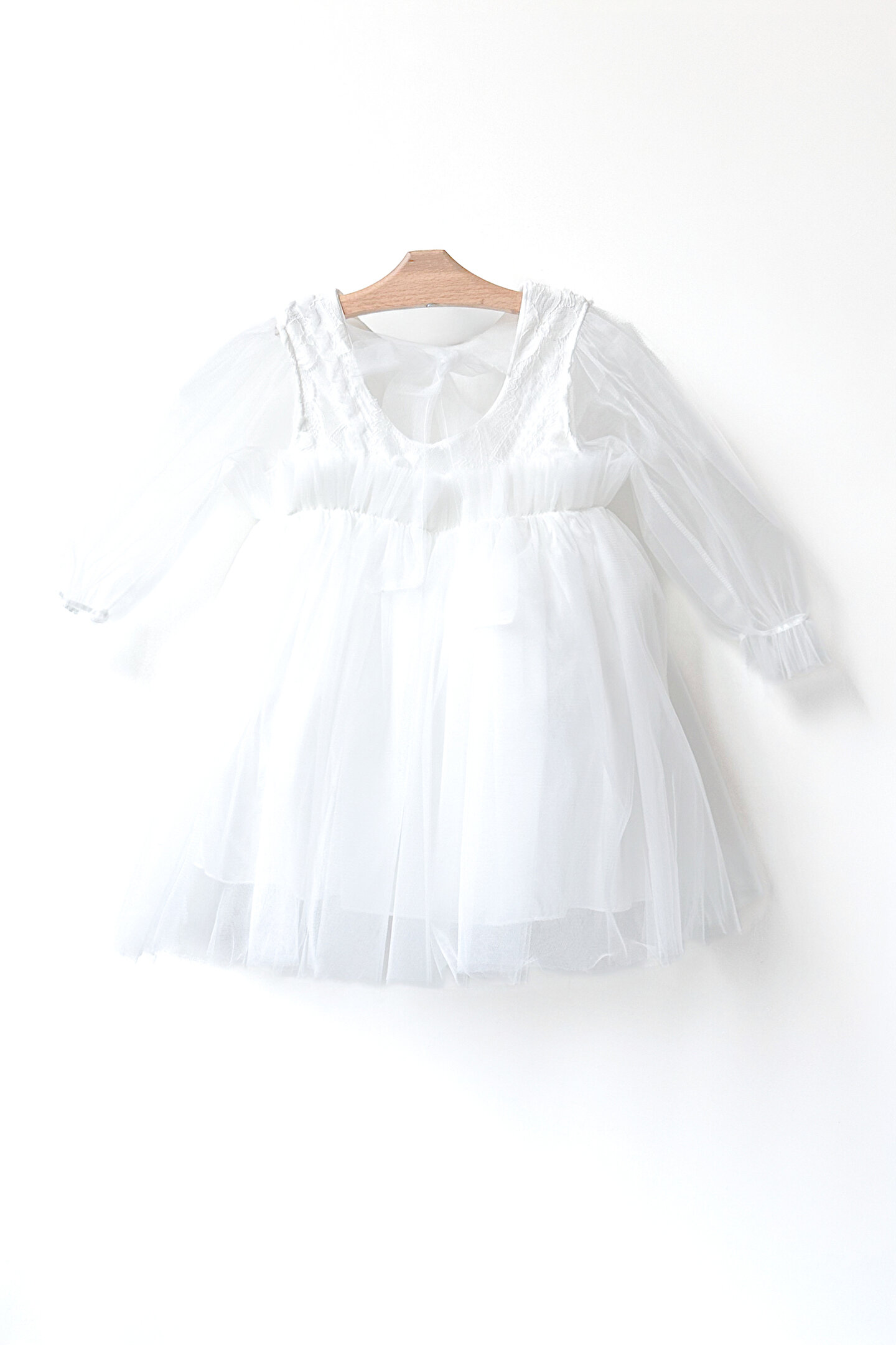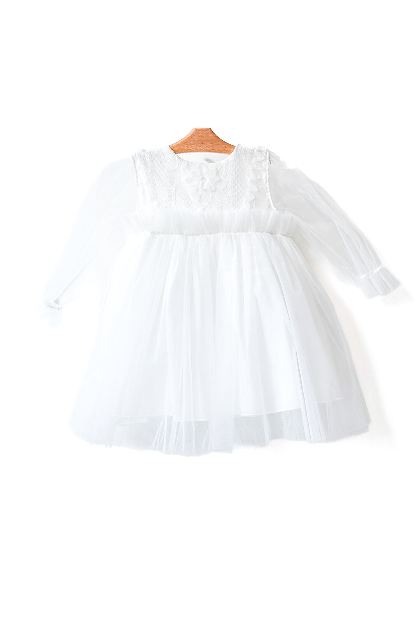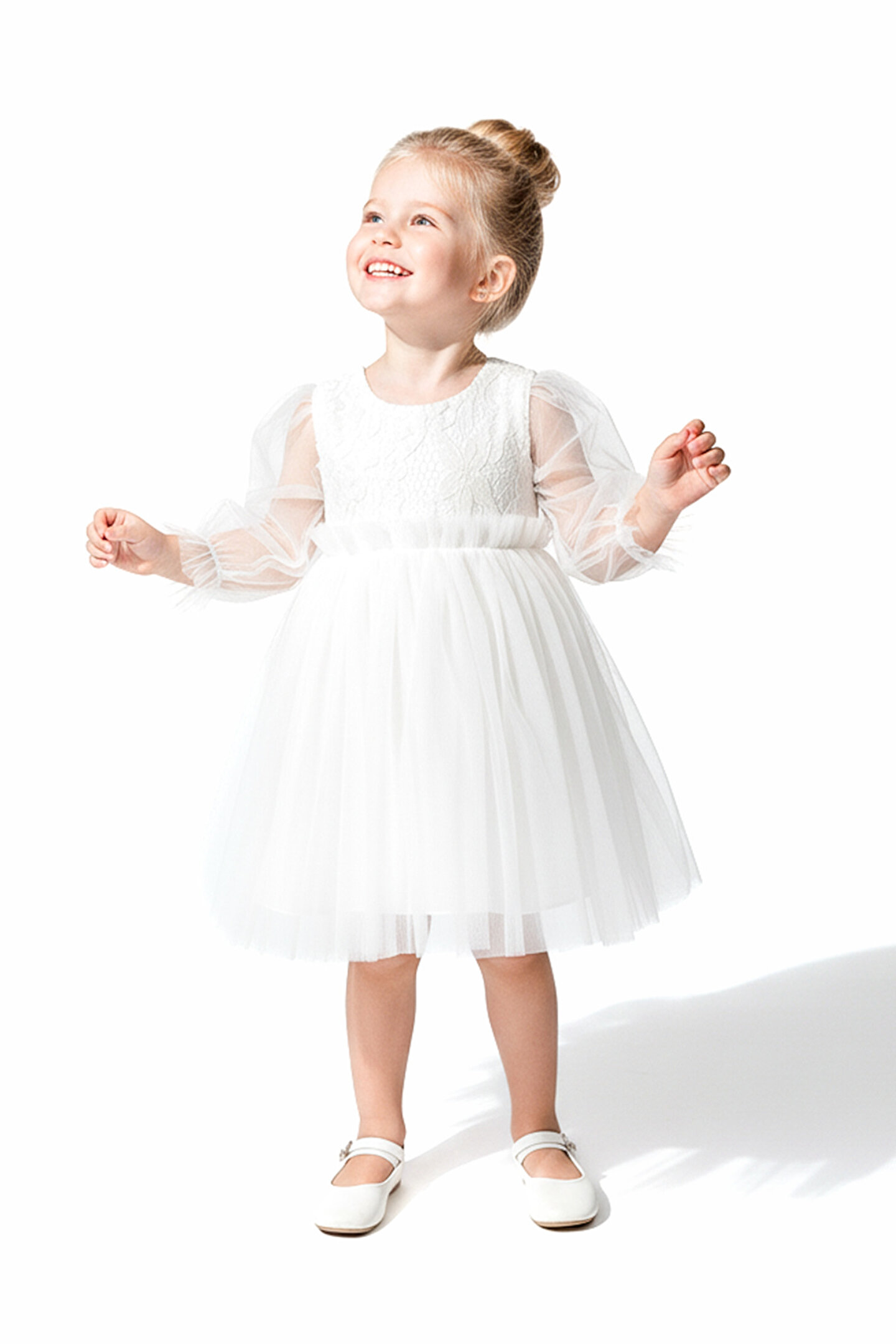 Mevsimlik Uzun Kollu Dantel Detaylı Kız Çocuk Elbisesi: Küçük prensesinizin yaz mevsiminde özel günlerde zarafetini ve şıklığını ön plana çıkaracak bu elbise, önünde bulunan fiyonk detayı ve dantel işlemeleriyle tasarlanmıştır.; Ayrıca etek kısmında bulunan yırtmaç detayı, hareket özgürlüğü sağlarken bebeğinizin zarif bir görünüm sergilemesini sağlar.; Özellikler: Dantel Detaylar: Elbisenin ön kısmında ve kollarda bulunan dantel detaylar, zarafet ve incelik katarken, küçük prensesinizin görünümünü daha etkileyici hale getirir.; Önünde Fiyonk Detayı: Elbisenin ön kısmında bulunan fiyonk detayı, sevimliliği ve şıklığı artırır.; Küçük prensesinizin görünümüne hoş bir dokunuş ekler.; Yırtmaç Detayı: Etek kısmında bulunan yırtmaç detayı, hareket özgürlüğü sağlarken, elbisenin tasarımına dinamizm katar.; Uzun Kollu Tasarım:Rahatlıkla giyilebilecek Uzun kollu tasarım, bebeğinizin serin kalmasını sağlar ve özgürce hareket etmesine olanak tanır.; Mevsimlik Kullanıma Uygun: Hafif yapısı ve nefes alabilen kumaşıyla yaz aylarında rahatlıkla giyilebilir.; Özel Günler İçin Uygun: Özel günlerde tercih edilebilecek şık tasarımıyla bebeğinizin her anında göz kamaştırmasını sağlar.; Bu yırtmaçlı, önü fiyonklu ve dantel detaylı Uzun kollu kız çocuk elbisesi, küçük prensesinizin serin ve şık kalmasını sağlarken, aynı zamanda özel günlerde de zarafetini tamamlar.; Zarif detaylarıyla bezenmiş bu elbise, bebeğinizin tarzını ve güzelliğini ön plana çıkarır.