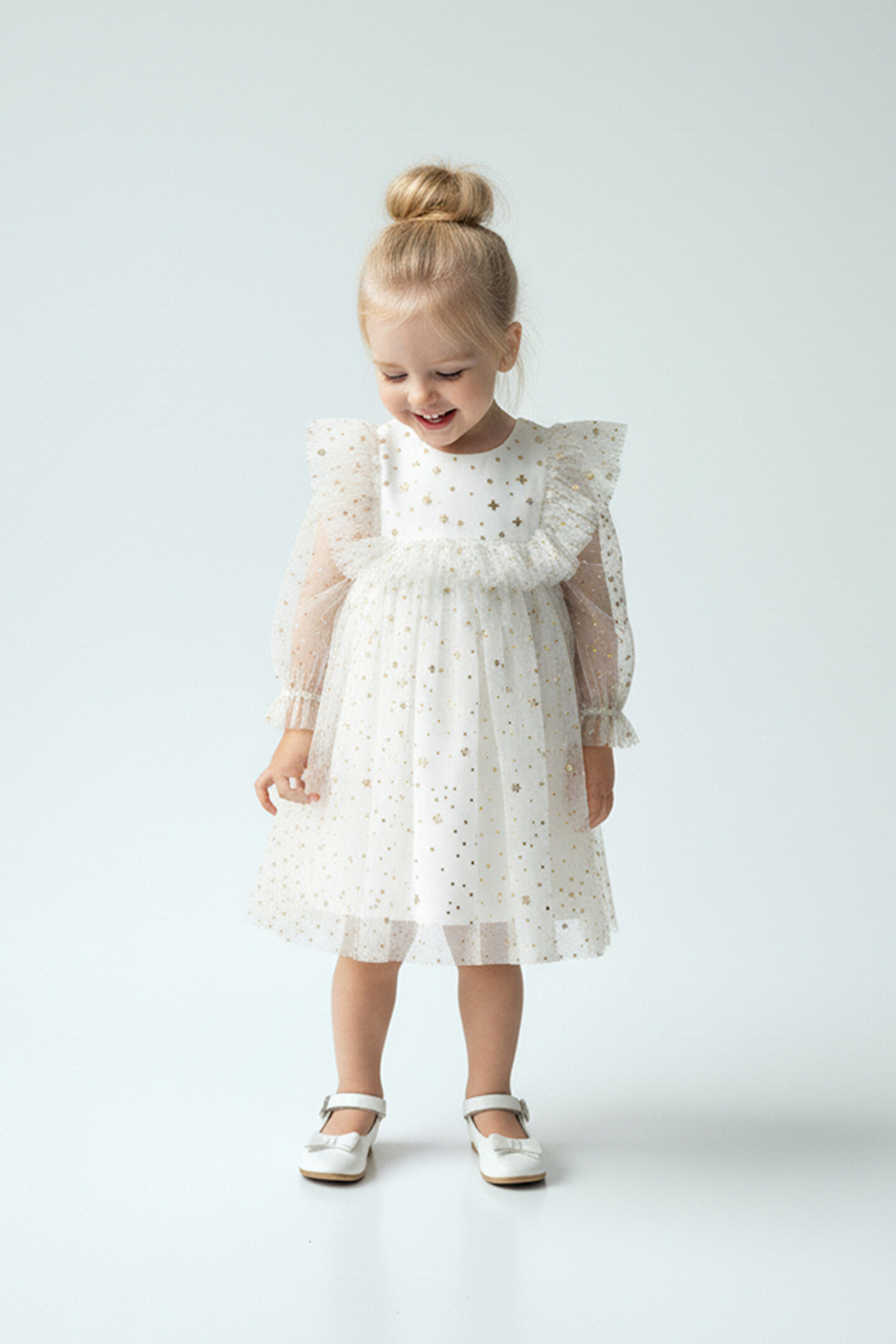 Mevsimlik Uzun Kollu Dantel Detaylı Kız Çocuk Elbisesi: Küçük prensesinizin özel günlerde zarafetini ve şıklığını ön plana çıkaracak bu elbise, yıldız detayıyla tasarlanmıştır.; Ayrıca etek kısmında bulunan yırtmaç detayı, hareket özgürlüğü sağlarken bebeğinizin zarif bir görünüm sergilemesini sağlar.; Özellikler tül Detaylar: Elbisenin ön kısmında ve kollarda bulunan yıldız detayıyla, zarafet ve incelik katarken, küçük prensesinizin görünümünü daha etkileyici hale getirir.; Arkasındaki yıldız detayıyla: Elbisenin ön kısmında bulunan yıldız detayıyla, sevimliliği ve şıklığı artırır.; Küçük prensesinizin görünümüne hoş bir dokunuş ekler.; Yırtmaç Detayı: Etek kısmında bulunan yırtmaç detayı, hareket özgürlüğü sağlarken, elbisenin tasarımına dinamizm katar.; Uzun Kollu Tasarım:Rahatlıkla giyilebilecek Uzun kollu tasarım, bebeğinizin özgürce hareket etmesine olanak tanır.; Mevsimlik Kullanıma Uygun: Hafif yapısı ve nefes alabilen kumaşıyla rahatlıkla giyilebilir.; Özel Günler İçin Uygun: Özel günlerde tercih edilebilecek şık tasarımıyla bebeğinizin her anında göz kamaştırmasını sağlar.; Bu yırtmaçlı,yıldız detayıyla Uzun kollu kız çocuk elbisesi, küçük prensesinizin serin ve şık kalmasını sağlarken, aynı zamanda özel günlerde de zarafetini tamamlar.; Zarif detaylarıyla bezenmiş bu elbise, bebeğinizin tarzını ve güzelliğini ön plana çıkarır.
