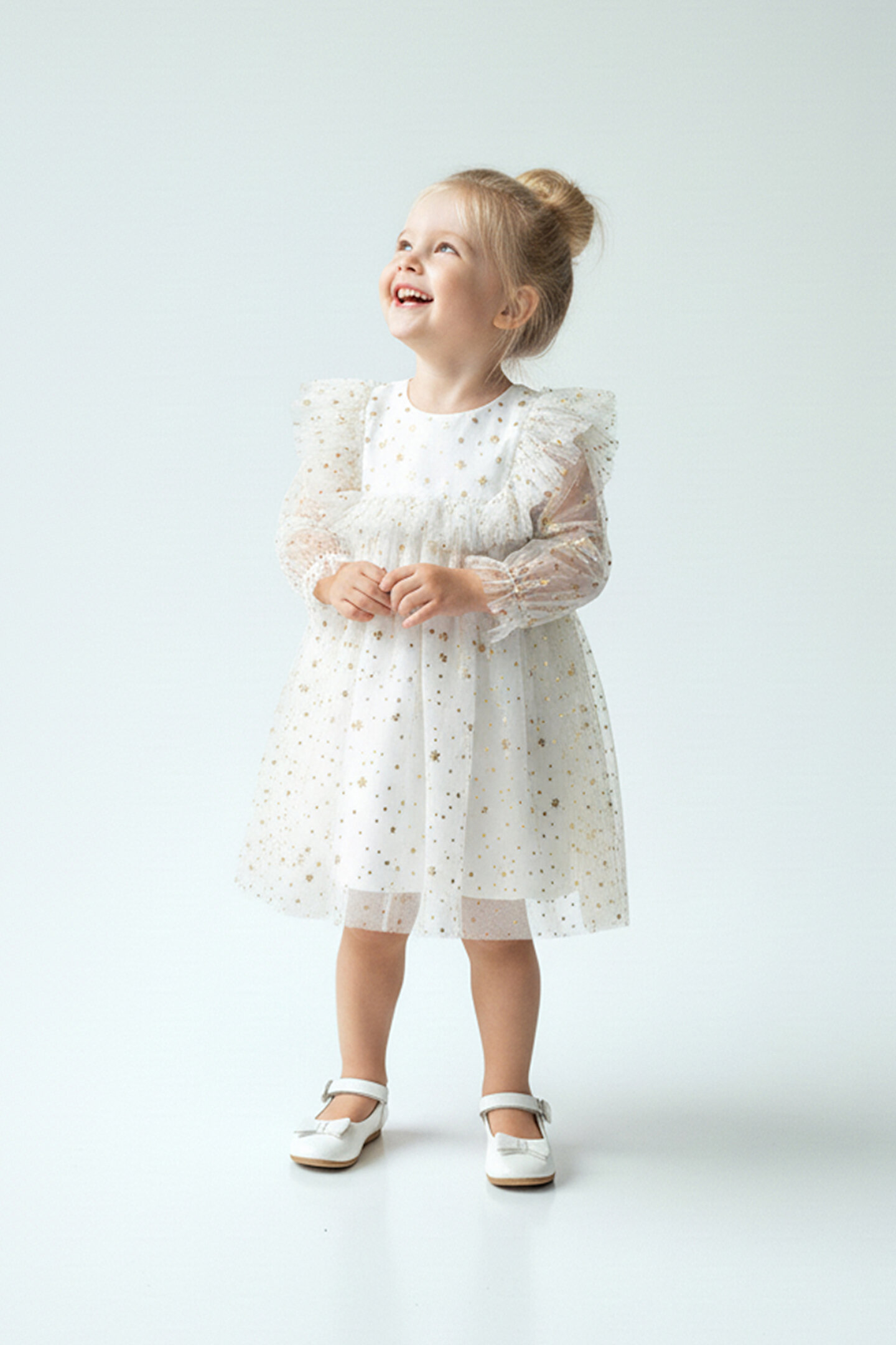 Mevsimlik Uzun Kollu Dantel Detaylı Kız Çocuk Elbisesi: Küçük prensesinizin özel günlerde zarafetini ve şıklığını ön plana çıkaracak bu elbise, yıldız detayıyla tasarlanmıştır.; Ayrıca etek kısmında bulunan yırtmaç detayı, hareket özgürlüğü sağlarken bebeğinizin zarif bir görünüm sergilemesini sağlar.; Özellikler tül Detaylar: Elbisenin ön kısmında ve kollarda bulunan yıldız detayıyla, zarafet ve incelik katarken, küçük prensesinizin görünümünü daha etkileyici hale getirir.; Arkasındaki yıldız detayıyla: Elbisenin ön kısmında bulunan yıldız detayıyla, sevimliliği ve şıklığı artırır.; Küçük prensesinizin görünümüne hoş bir dokunuş ekler.; Yırtmaç Detayı: Etek kısmında bulunan yırtmaç detayı, hareket özgürlüğü sağlarken, elbisenin tasarımına dinamizm katar.; Uzun Kollu Tasarım:Rahatlıkla giyilebilecek Uzun kollu tasarım, bebeğinizin özgürce hareket etmesine olanak tanır.; Mevsimlik Kullanıma Uygun: Hafif yapısı ve nefes alabilen kumaşıyla rahatlıkla giyilebilir.; Özel Günler İçin Uygun: Özel günlerde tercih edilebilecek şık tasarımıyla bebeğinizin her anında göz kamaştırmasını sağlar.; Bu yırtmaçlı,yıldız detayıyla Uzun kollu kız çocuk elbisesi, küçük prensesinizin serin ve şık kalmasını sağlarken, aynı zamanda özel günlerde de zarafetini tamamlar.; Zarif detaylarıyla bezenmiş bu elbise, bebeğinizin tarzını ve güzelliğini ön plana çıkarır.
