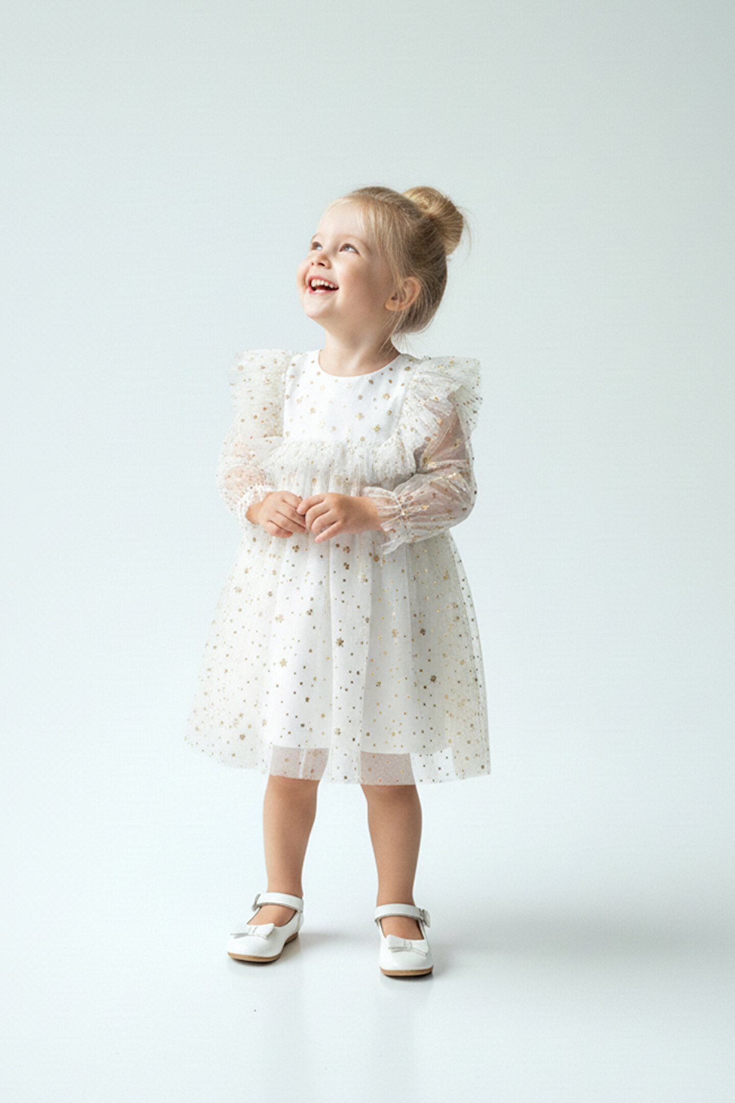 Mevsimlik Uzun Kollu Dantel Detaylı Kız Çocuk Elbisesi: Küçük prensesinizin özel günlerde zarafetini ve şıklığını ön plana çıkaracak bu elbise, yıldız detayıyla tasarlanmıştır.; Ayrıca etek kısmında bulunan yırtmaç detayı, hareket özgürlüğü sağlarken bebeğinizin zarif bir görünüm sergilemesini sağlar.; Özellikler tül Detaylar: Elbisenin ön kısmında ve kollarda bulunan yıldız detayıyla, zarafet ve incelik katarken, küçük prensesinizin görünümünü daha etkileyici hale getirir.; Arkasındaki yıldız detayıyla: Elbisenin ön kısmında bulunan yıldız detayıyla, sevimliliği ve şıklığı artırır.; Küçük prensesinizin görünümüne hoş bir dokunuş ekler.; Yırtmaç Detayı: Etek kısmında bulunan yırtmaç detayı, hareket özgürlüğü sağlarken, elbisenin tasarımına dinamizm katar.; Uzun Kollu Tasarım:Rahatlıkla giyilebilecek Uzun kollu tasarım, bebeğinizin özgürce hareket etmesine olanak tanır.; Mevsimlik Kullanıma Uygun: Hafif yapısı ve nefes alabilen kumaşıyla rahatlıkla giyilebilir.; Özel Günler İçin Uygun: Özel günlerde tercih edilebilecek şık tasarımıyla bebeğinizin her anında göz kamaştırmasını sağlar.; Bu yırtmaçlı,yıldız detayıyla Uzun kollu kız çocuk elbisesi, küçük prensesinizin serin ve şık kalmasını sağlarken, aynı zamanda özel günlerde de zarafetini tamamlar.; Zarif detaylarıyla bezenmiş bu elbise, bebeğinizin tarzını ve güzelliğini ön plana çıkarır.