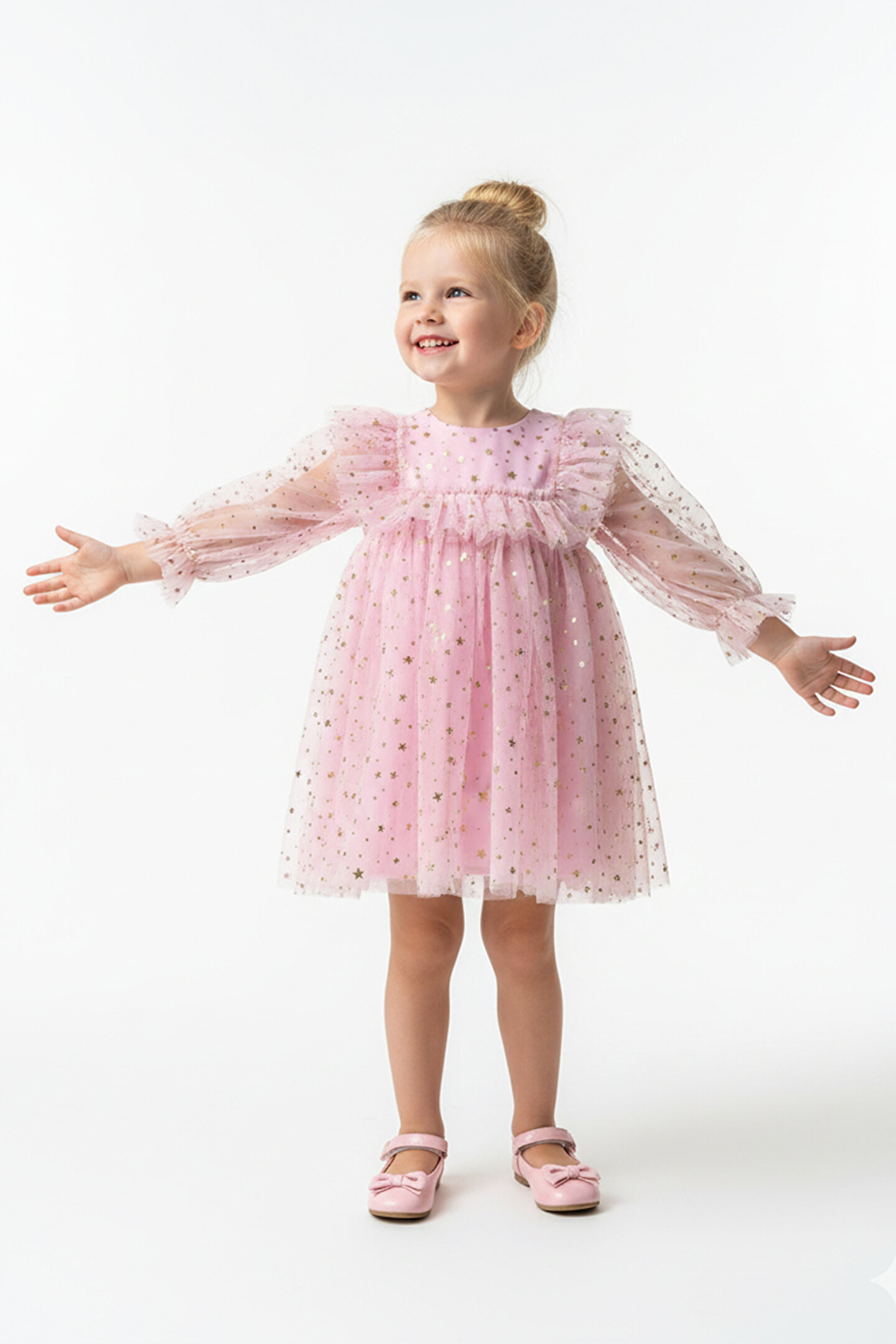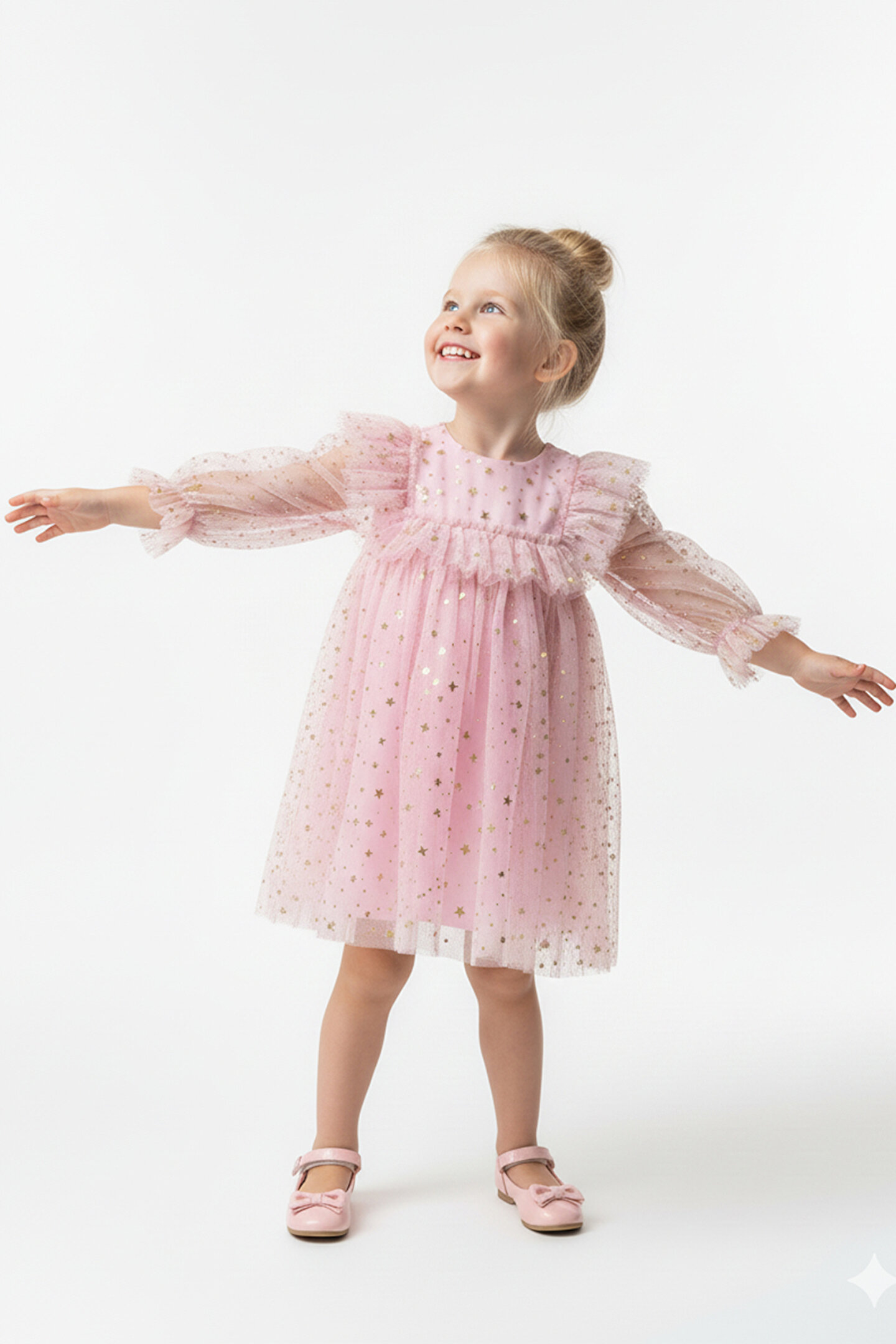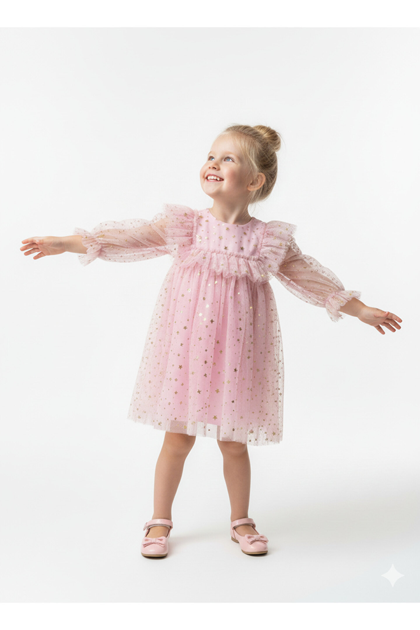 Mevsimlik Uzun Kollu Dantel Detaylı Kız Çocuk Elbisesi: Küçük prensesinizin özel günlerde zarafetini ve şıklığını ön plana çıkaracak bu elbise, yıldız detayıyla tasarlanmıştır.; Ayrıca etek kısmında bulunan yırtmaç detayı, hareket özgürlüğü sağlarken bebeğinizin zarif bir görünüm sergilemesini sağlar.; Özellikler tül Detaylar: Elbisenin ön kısmında ve kollarda bulunan yıldız detayıyla, zarafet ve incelik katarken, küçük prensesinizin görünümünü daha etkileyici hale getirir.; Arkasındaki yıldız detayıyla: Elbisenin ön kısmında bulunan yıldız detayıyla, sevimliliği ve şıklığı artırır.; Küçük prensesinizin görünümüne hoş bir dokunuş ekler.; Yırtmaç Detayı: Etek kısmında bulunan yırtmaç detayı, hareket özgürlüğü sağlarken, elbisenin tasarımına dinamizm katar.; Uzun Kollu Tasarım:Rahatlıkla giyilebilecek Uzun kollu tasarım, bebeğinizin özgürce hareket etmesine olanak tanır.; Mevsimlik Kullanıma Uygun: Hafif yapısı ve nefes alabilen kumaşıyla rahatlıkla giyilebilir.; Özel Günler İçin Uygun: Özel günlerde tercih edilebilecek şık tasarımıyla bebeğinizin her anında göz kamaştırmasını sağlar.; Bu yırtmaçlı,yıldız detayıyla Uzun kollu kız çocuk elbisesi, küçük prensesinizin serin ve şık kalmasını sağlarken, aynı zamanda özel günlerde de zarafetini tamamlar.; Zarif detaylarıyla bezenmiş bu elbise, bebeğinizin tarzını ve güzelliğini ön plana çıkarır.