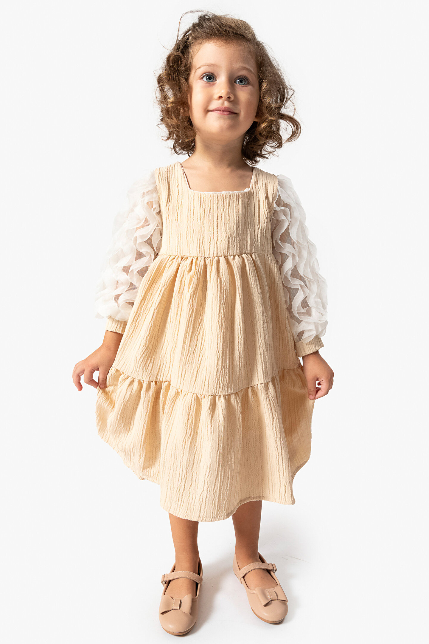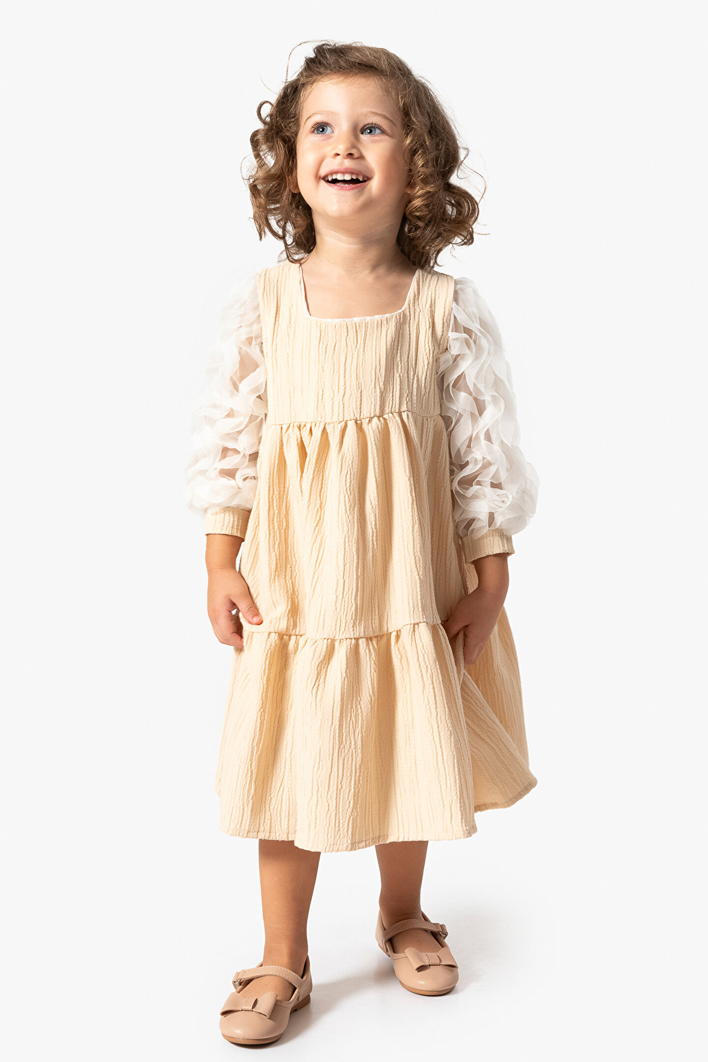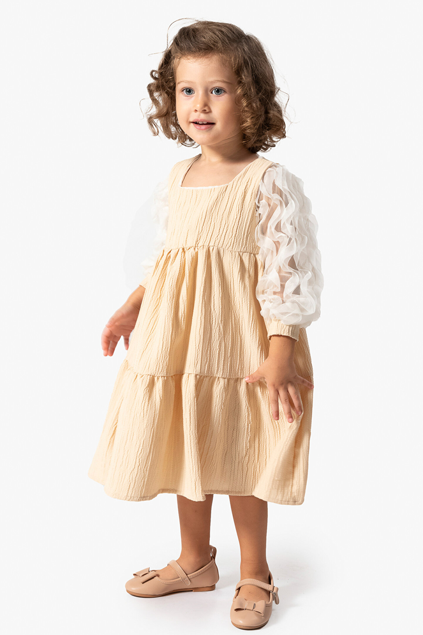 Mevsimlik Uzun Kollu Dantel Detaylı Kız Çocuk Elbisesi: Küçük prensesinizin yaz mevsiminde özel günlerde zarafetini ve şıklığını ön plana çıkaracak bu elbise, önünde bulunan fiyonk detayı ve dantel işlemeleriyle tasarlanmıştır.; Ayrıca etek kısmında bulunan yırtmaç detayı, hareket özgürlüğü sağlarken bebeğinizin zarif bir görünüm sergilemesini sağlar.; Özellikler: Dantel Detaylar: Elbisenin ön kısmında ve kollarda bulunan dantel detaylar, zarafet ve incelik katarken, küçük prensesinizin görünümünü daha etkileyici hale getirir.; Önünde Fiyonk Detayı: Elbisenin ön kısmında bulunan fiyonk detayı, sevimliliği ve şıklığı artırır.; Küçük prensesinizin görünümüne hoş bir dokunuş ekler.; Yırtmaç Detayı: Etek kısmında bulunan yırtmaç detayı, hareket özgürlüğü sağlarken, elbisenin tasarımına dinamizm katar.; Uzun Kollu Tasarım:Rahatlıkla giyilebilecek Uzun kollu tasarım, bebeğinizin serin kalmasını sağlar ve özgürce hareket etmesine olanak tanır.; Mevsimlik Kullanıma Uygun: Hafif yapısı ve nefes alabilen kumaşıyla yaz aylarında rahatlıkla giyilebilir.; Özel Günler İçin Uygun: Özel günlerde tercih edilebilecek şık tasarımıyla bebeğinizin her anında göz kamaştırmasını sağlar.; Bu yırtmaçlı, önü fiyonklu ve dantel detaylı Uzun kollu kız çocuk elbisesi, küçük prensesinizin serin ve şık kalmasını sağlarken, aynı zamanda özel günlerde de zarafetini tamamlar.; Zarif detaylarıyla bezenmiş bu elbise, bebeğinizin tarzını ve güzelliğini ön plana çıkarır.