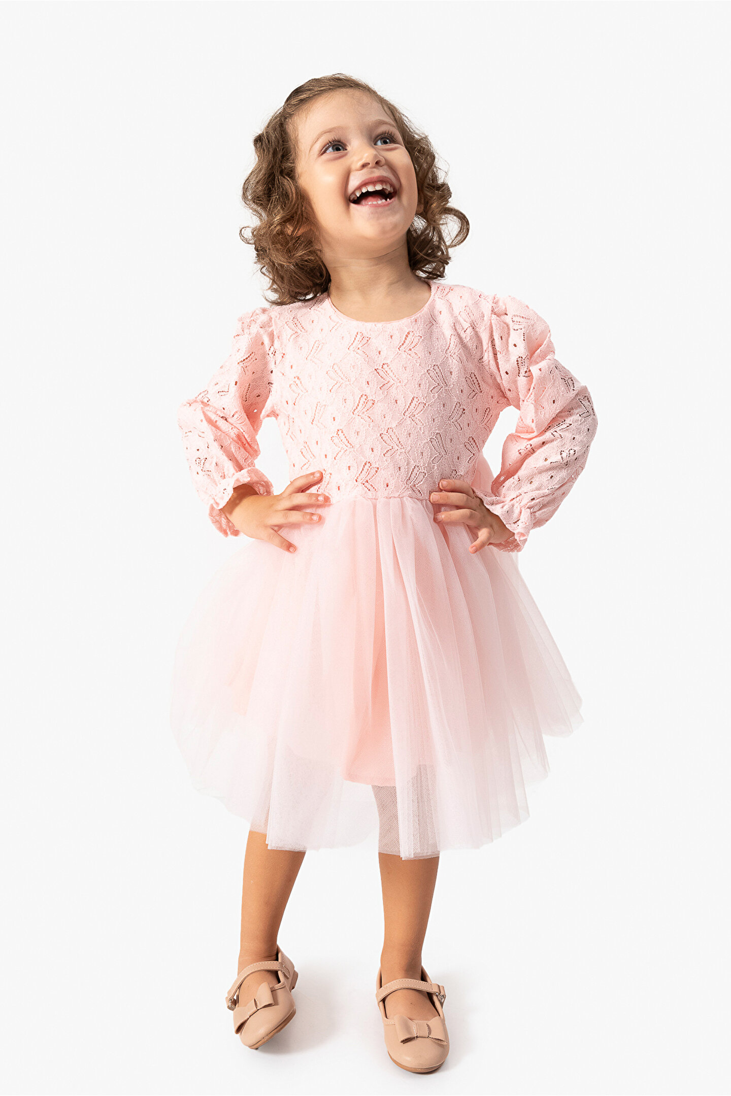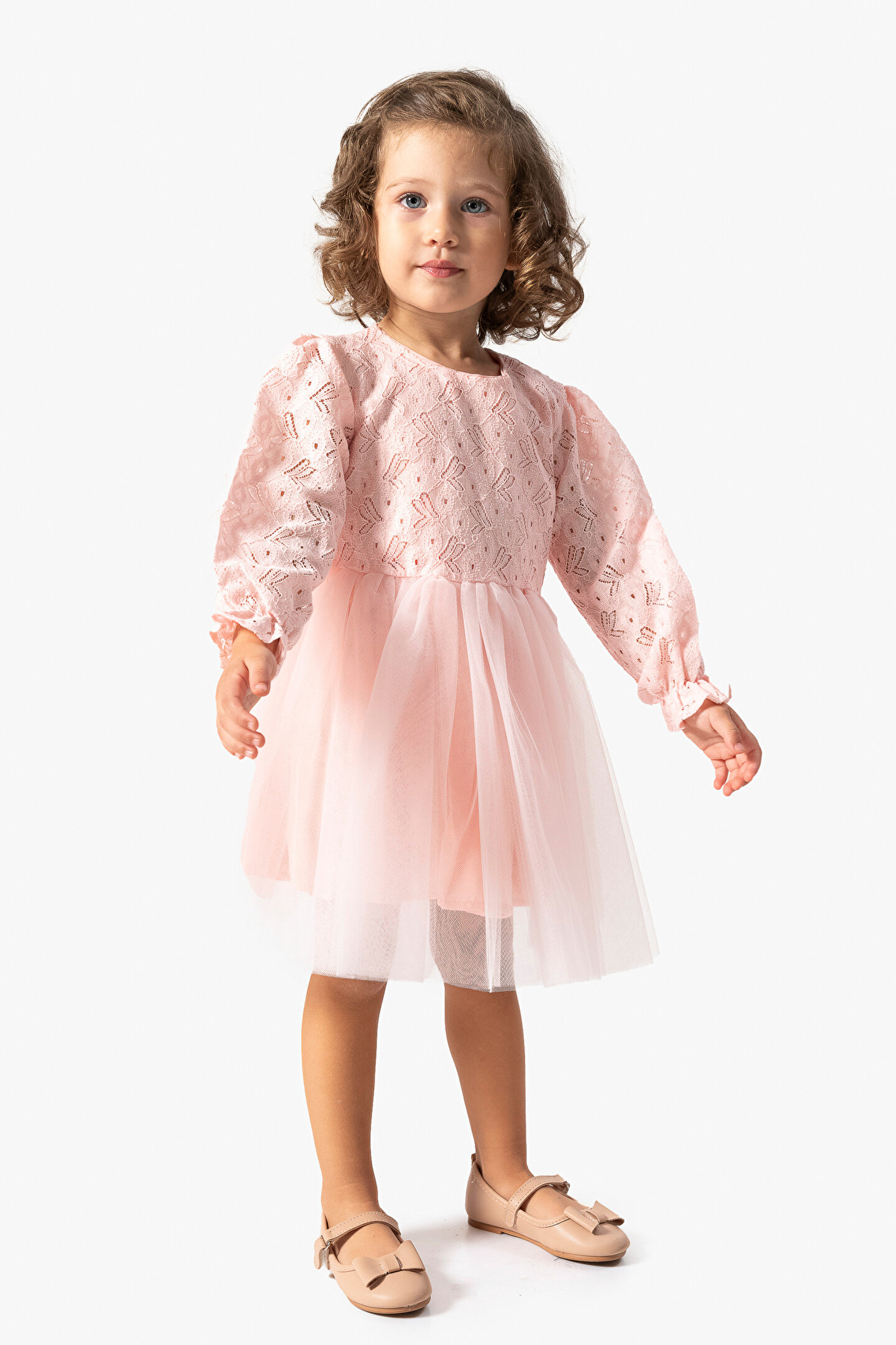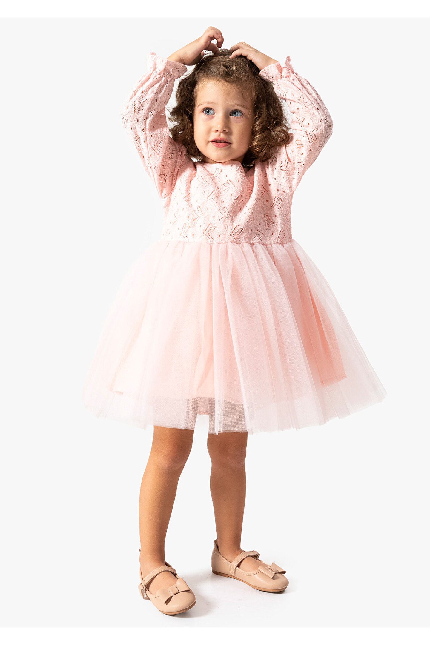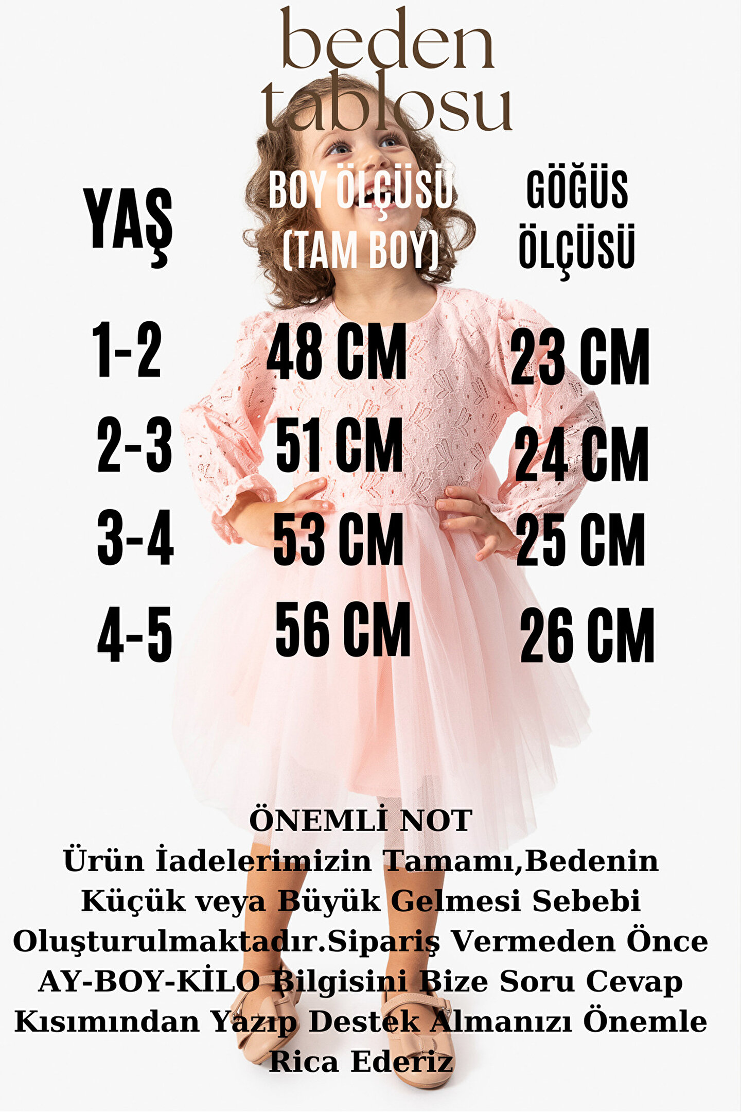 Mevsimlik Uzun Kollu Dantel Detaylı Kız Çocuk Elbisesi: Küçük prensesinizin yaz mevsiminde özel günlerde zarafetini ve şıklığını ön plana çıkaracak bu elbise, önünde bulunan fiyonk detayı ve dantel işlemeleriyle tasarlanmıştır.; Ayrıca etek kısmında bulunan yırtmaç detayı, hareket özgürlüğü sağlarken bebeğinizin zarif bir görünüm sergilemesini sağlar.; Özellikler: Dantel Detaylar: Elbisenin ön kısmında ve kollarda bulunan dantel detaylar, zarafet ve incelik katarken, küçük prensesinizin görünümünü daha etkileyici hale getirir.; Önünde Fiyonk Detayı: Elbisenin ön kısmında bulunan fiyonk detayı, sevimliliği ve şıklığı artırır.; Küçük prensesinizin görünümüne hoş bir dokunuş ekler.; Yırtmaç Detayı: Etek kısmında bulunan yırtmaç detayı, hareket özgürlüğü sağlarken, elbisenin tasarımına dinamizm katar.; Uzun Kollu Tasarım:Rahatlıkla giyilebilecek Uzun kollu tasarım, bebeğinizin serin kalmasını sağlar ve özgürce hareket etmesine olanak tanır.; Mevsimlik Kullanıma Uygun: Hafif yapısı ve nefes alabilen kumaşıyla yaz aylarında rahatlıkla giyilebilir.; Özel Günler İçin Uygun: Özel günlerde tercih edilebilecek şık tasarımıyla bebeğinizin her anında göz kamaştırmasını sağlar.; Bu yırtmaçlı, önü fiyonklu ve dantel detaylı Uzun kollu kız çocuk elbisesi, küçük prensesinizin serin ve şık kalmasını sağlarken, aynı zamanda özel günlerde de zarafetini tamamlar.; Zarif detaylarıyla bezenmiş bu elbise, bebeğinizin tarzını ve güzelliğini ön plana çıkarır.