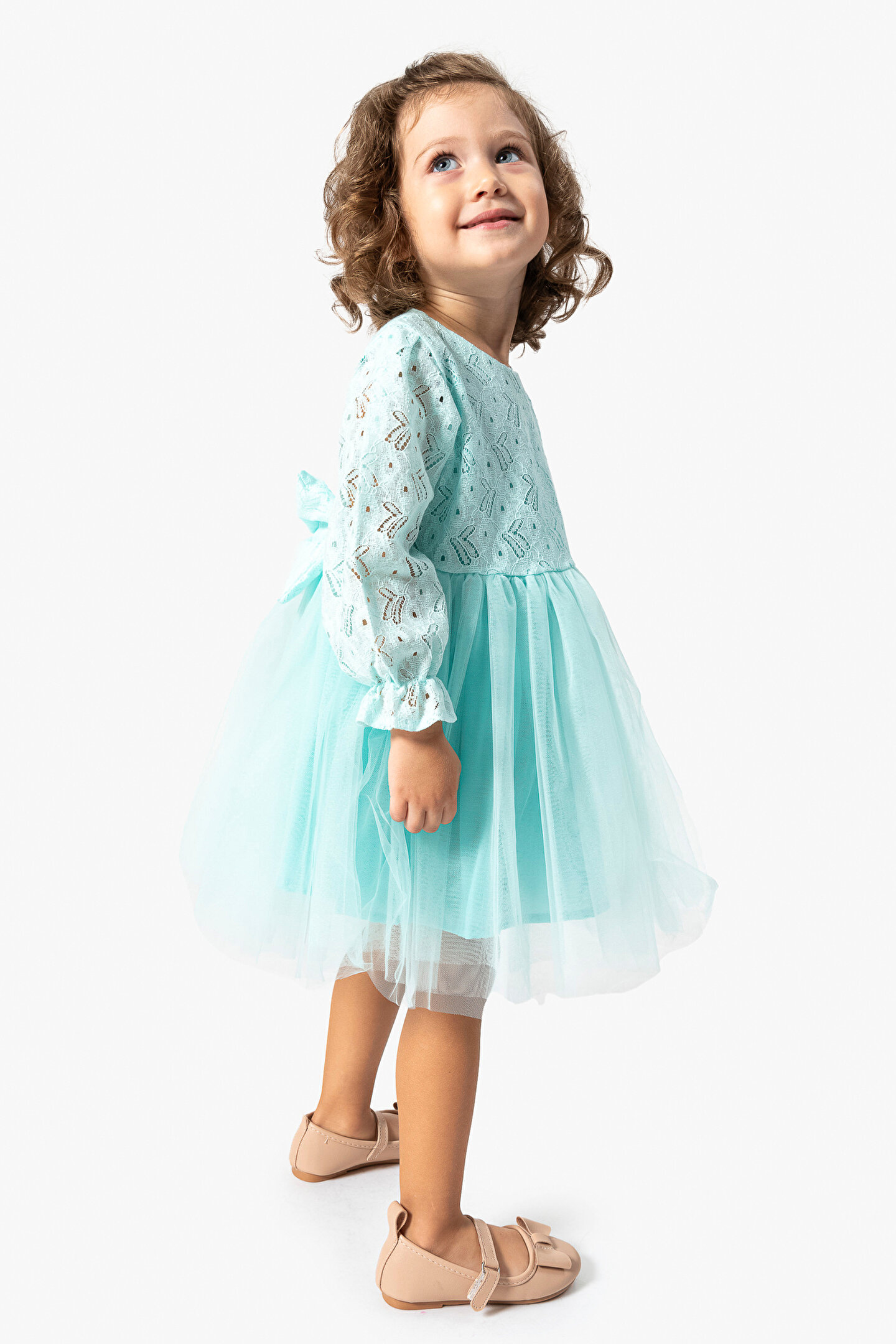 Mevsimlik Uzun Kollu Dantel Detaylı Kız Çocuk Elbisesi: Küçük prensesinizin yaz mevsiminde özel günlerde zarafetini ve şıklığını ön plana çıkaracak bu elbise, önünde bulunan fiyonk detayı ve dantel işlemeleriyle tasarlanmıştır.; Ayrıca etek kısmında bulunan yırtmaç detayı, hareket özgürlüğü sağlarken bebeğinizin zarif bir görünüm sergilemesini sağlar.; Özellikler: Dantel Detaylar: Elbisenin ön kısmında ve kollarda bulunan dantel detaylar, zarafet ve incelik katarken, küçük prensesinizin görünümünü daha etkileyici hale getirir.; Önünde Fiyonk Detayı: Elbisenin ön kısmında bulunan fiyonk detayı, sevimliliği ve şıklığı artırır.; Küçük prensesinizin görünümüne hoş bir dokunuş ekler.; Yırtmaç Detayı: Etek kısmında bulunan yırtmaç detayı, hareket özgürlüğü sağlarken, elbisenin tasarımına dinamizm katar.; Uzun Kollu Tasarım:Rahatlıkla giyilebilecek Uzun kollu tasarım, bebeğinizin serin kalmasını sağlar ve özgürce hareket etmesine olanak tanır.; Mevsimlik Kullanıma Uygun: Hafif yapısı ve nefes alabilen kumaşıyla yaz aylarında rahatlıkla giyilebilir.; Özel Günler İçin Uygun: Özel günlerde tercih edilebilecek şık tasarımıyla bebeğinizin her anında göz kamaştırmasını sağlar.; Bu yırtmaçlı, önü fiyonklu ve dantel detaylı Uzun kollu kız çocuk elbisesi, küçük prensesinizin serin ve şık kalmasını sağlarken, aynı zamanda özel günlerde de zarafetini tamamlar.; Zarif detaylarıyla bezenmiş bu elbise, bebeğinizin tarzını ve güzelliğini ön plana çıkarır.