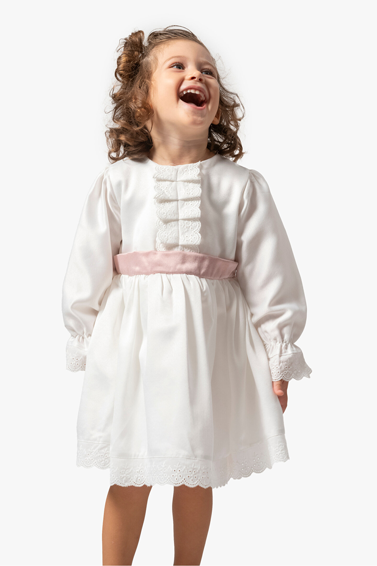 Mevsimlik Uzun Kollu Dantel Detaylı Kız Çocuk Elbisesi: Küçük prensesinizin yaz mevsiminde özel günlerde zarafetini ve şıklığını ön plana çıkaracak bu elbise, önünde bulunan fiyonk detayı ve dantel işlemeleriyle tasarlanmıştır.; Ayrıca etek kısmında bulunan yırtmaç detayı, hareket özgürlüğü sağlarken bebeğinizin zarif bir görünüm sergilemesini sağlar.; Özellikler: Dantel Detaylar: Elbisenin ön kısmında ve kollarda bulunan dantel detaylar, zarafet ve incelik katarken, küçük prensesinizin görünümünü daha etkileyici hale getirir.; Önünde Fiyonk Detayı: Elbisenin ön kısmında bulunan fiyonk detayı, sevimliliği ve şıklığı artırır.; Küçük prensesinizin görünümüne hoş bir dokunuş ekler.; Yırtmaç Detayı: Etek kısmında bulunan yırtmaç detayı, hareket özgürlüğü sağlarken, elbisenin tasarımına dinamizm katar.; Uzun Kollu Tasarım:Rahatlıkla giyilebilecek Uzun kollu tasarım, bebeğinizin serin kalmasını sağlar ve özgürce hareket etmesine olanak tanır.; Mevsimlik Kullanıma Uygun: Hafif yapısı ve nefes alabilen kumaşıyla yaz aylarında rahatlıkla giyilebilir.; Özel Günler İçin Uygun: Özel günlerde tercih edilebilecek şık tasarımıyla bebeğinizin her anında göz kamaştırmasını sağlar.; Bu yırtmaçlı, önü fiyonklu ve dantel detaylı Uzun kollu kız çocuk elbisesi, küçük prensesinizin serin ve şık kalmasını sağlarken, aynı zamanda özel günlerde de zarafetini tamamlar.; Zarif detaylarıyla bezenmiş bu elbise, bebeğinizin tarzını ve güzelliğini ön plana çıkarır.