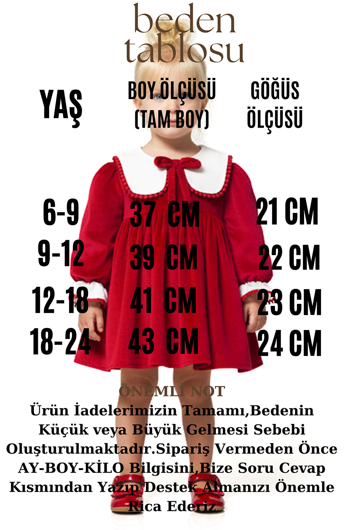 Mevsimlik Uzun Kollu Dantel Detaylı Kız Çocuk Elbisesi: Küçük prensesinizin özel günlerde zarafetini ve şıklığını ön plana çıkaracak bu elbise, önünde bulunan Yakalı fiyonk detayı ve dantel işlemeleriyle tasarlanmıştır.; Özellikler: Dantel Detaylar: Elbisenin ön kısmında ve kollarda bulunan dantel detaylar, zarafet ve incelik katarken, küçük prensesinizin görünümünü daha etkileyici hale getirir.; Önünde Yakalı Fiyonk Detayı: Elbisenin ön kısmında bulunan fiyonk detayı, sevimliliği ve şıklığı artırır.; Küçük prensesinizin görünümüne hoş bir dokunuş ekler.; Uzun Kollu Tasarım:Rahatlıkla giyilebilecek Uzun kollu tasarım, bebeğinizin serin kalmasını sağlar ve özgürce hareket etmesine olanak tanır.; Mevsimlik Kullanıma Uygun: Hafif yapısı ve nefes alabilen kumaşıyla rahatlıkla giyilebilir.; Özel Günler İçin Uygun: Özel günlerde tercih edilebilecek şık tasarımıyla bebeğinizin her anında göz kamaştırmasını sağlar.; Bu önü Yakalı fiyonklu ve dantel detaylı Uzun kollu kız çocuk elbisesi, küçük prensesinizin şık kalmasını sağlarken, aynı zamanda özel günlerde de zarafetini tamamlar.; Zarif detaylarıyla bezenmiş bu elbise, bebeğinizin tarzını ve güzelliğini ön plana çıkarır.