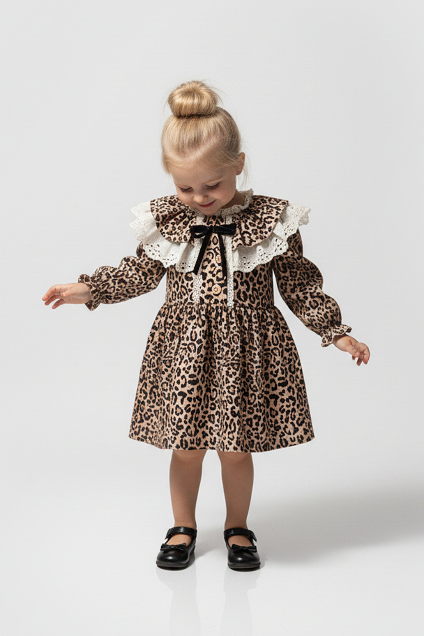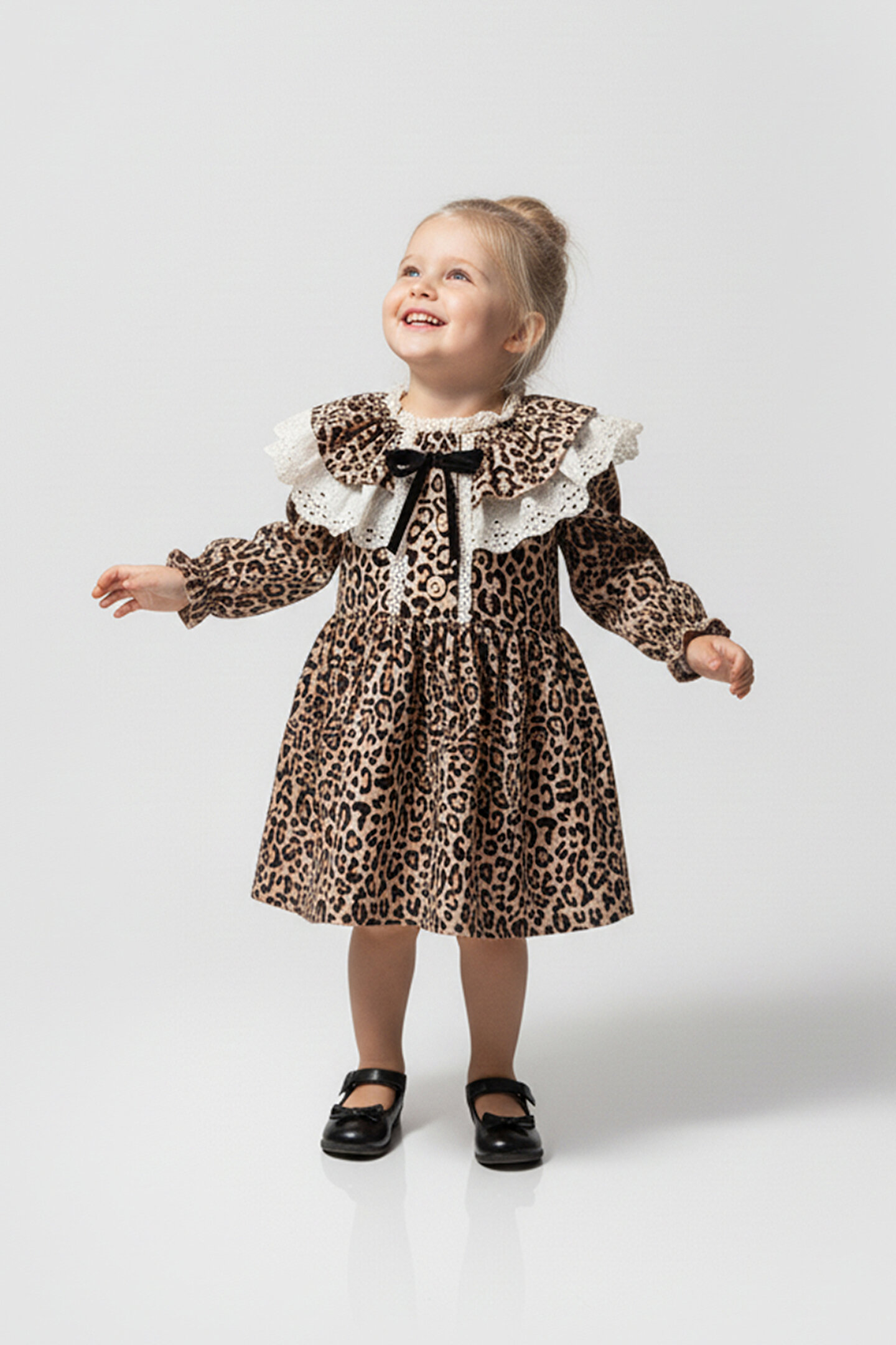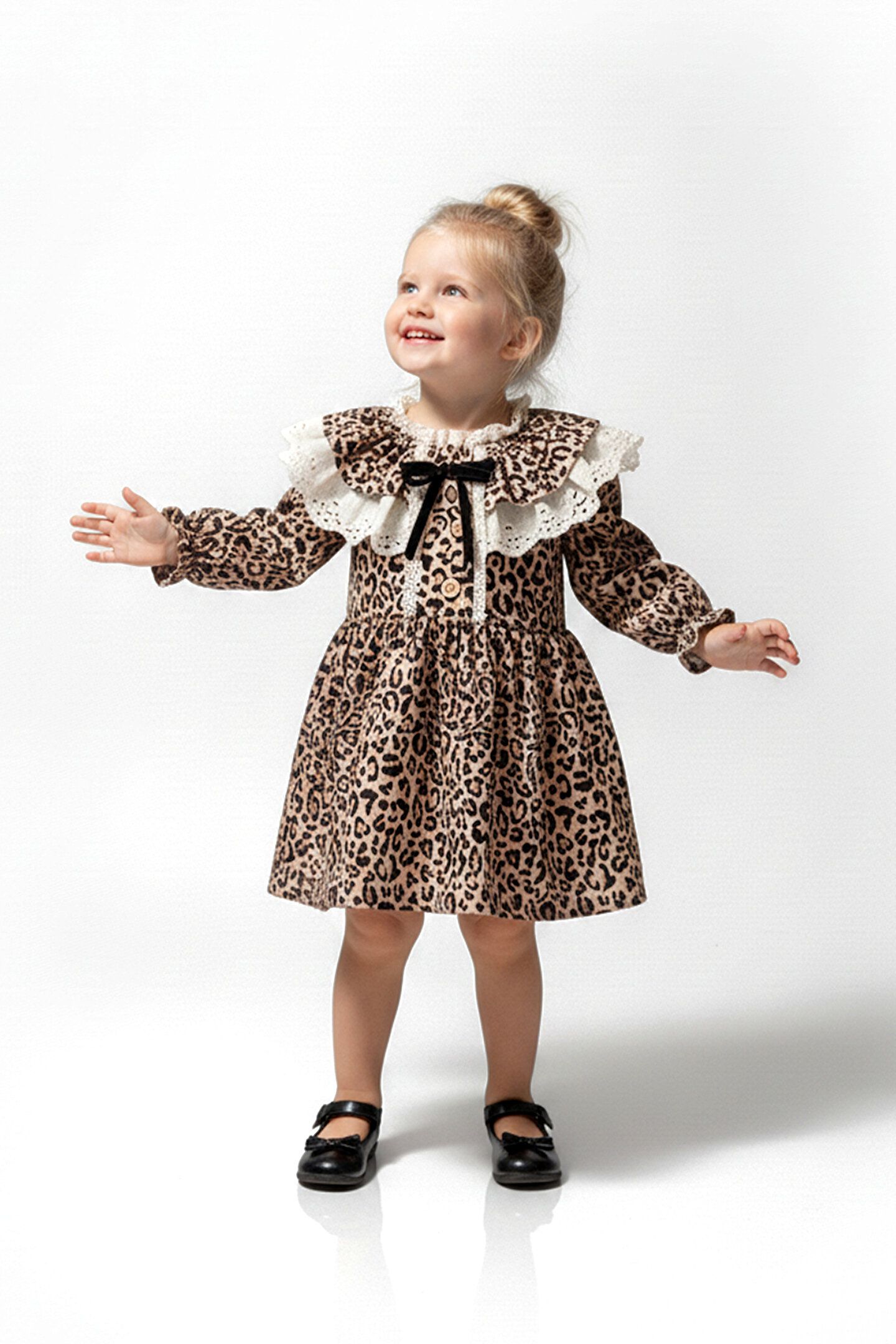 Mevsimlik Uzun Kollu Leopar Dantel Detaylı Kız Çocuk Elbisesi: Küçük prensesinizin özel günlerde zarafetini ve şıklığını ön plana çıkaracak bu elbise, önünde bulunan Leopar fiyonk detayı ve dantel işlemeleriyle tasarlanmıştır.; Özellikler: Dantel Detaylar: Elbisenin ön kısmında ve kollarda bulunan dantel detaylar, zarafet ve incelik katarken, küçük prensesinizin görünümünü daha etkileyici hale getirir.; Önünde Leopar Fiyonk Detayı: Elbisenin ön kısmında bulunan fiyonk detayı, sevimliliği ve şıklığı artırır.; Küçük prensesinizin görünümüne hoş bir dokunuş ekler.; Uzun Kollu Tasarım:Rahatlıkla giyilebilecek Uzun kollu tasarım, bebeğinizin serin kalmasını sağlar ve özgürce hareket etmesine olanak tanır.; Mevsimlik Kullanıma Uygun: Hafif yapısı ve nefes alabilen kumaşıyla rahatlıkla giyilebilir.; Özel Günler İçin Uygun: Özel günlerde tercih edilebilecek şık tasarımıyla bebeğinizin her anında göz kamaştırmasını sağlar.; Bu önü fiyonklu ve dantel detaylı Uzun kollu kız çocuk elbisesi, küçük prensesinizin şık kalmasını sağlarken, aynı zamanda özel günlerde de zarafetini tamamlar.; Zarif detaylarıyla bezenmiş bu elbise, bebeğinizin tarzını ve güzelliğini ön plana çıkarır.