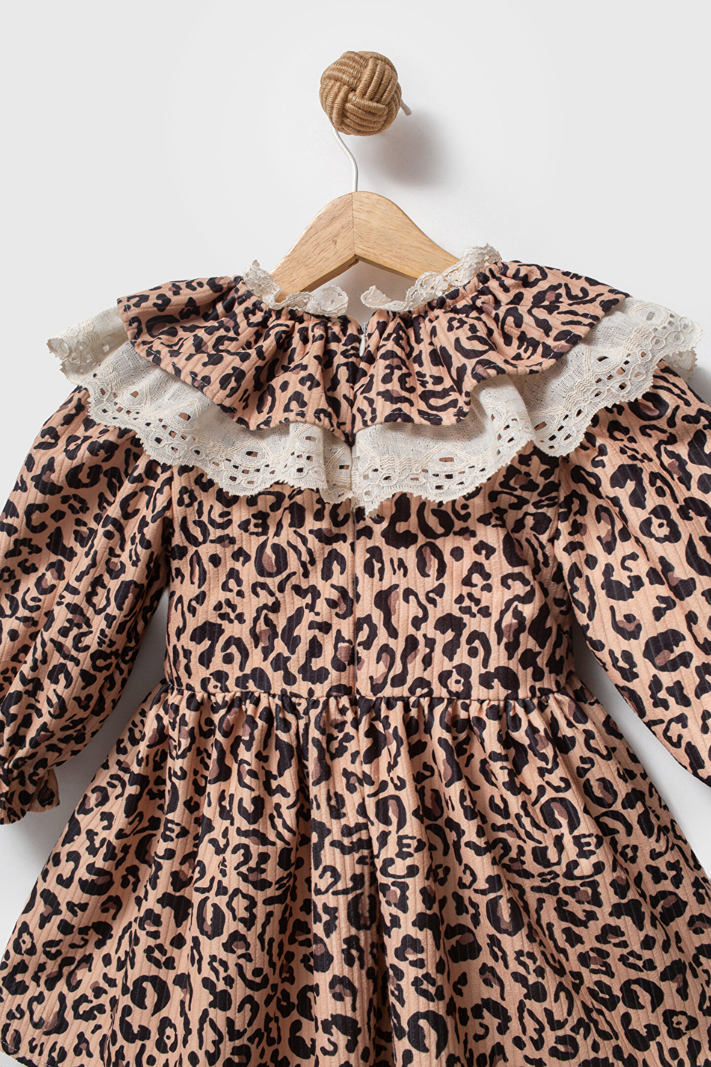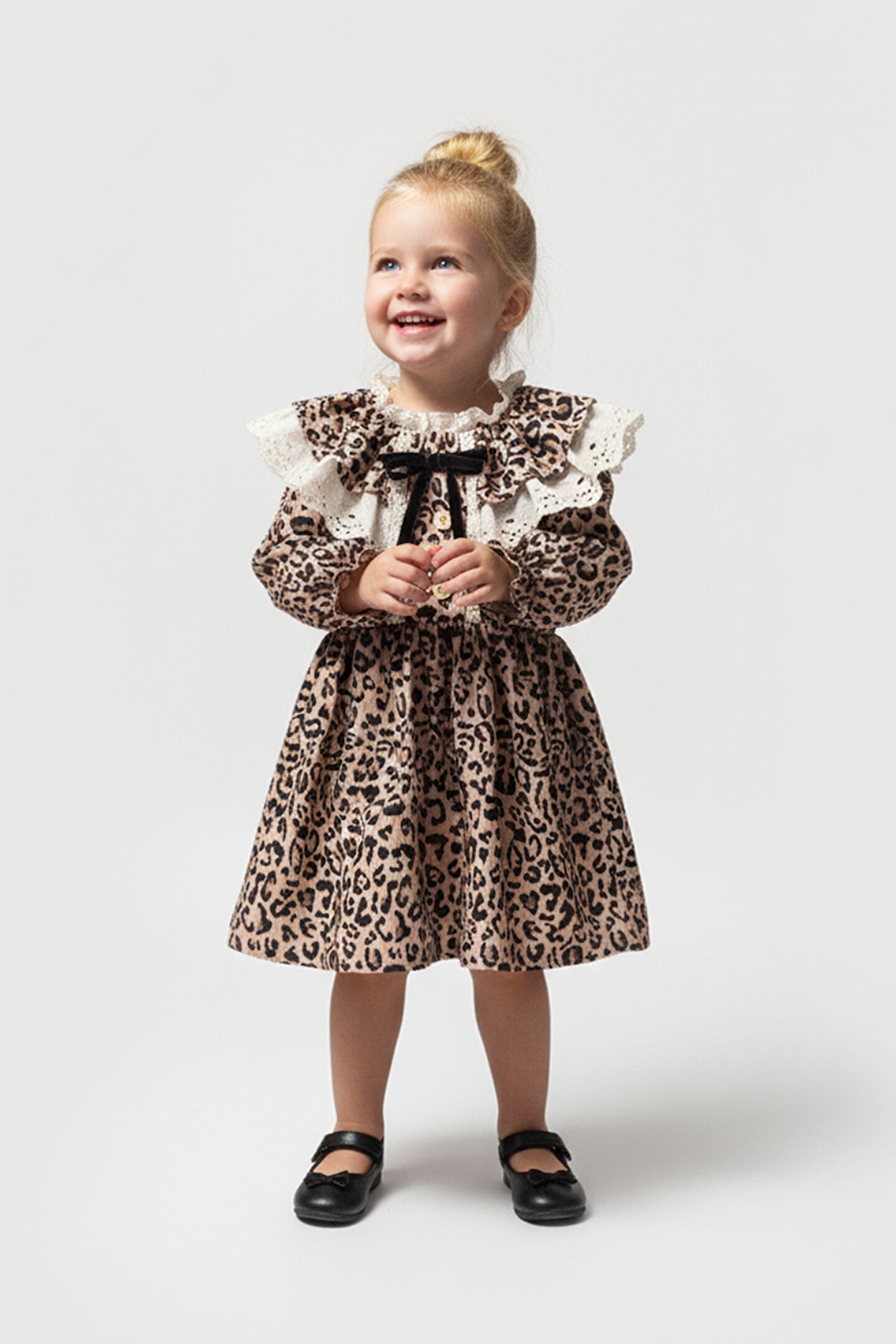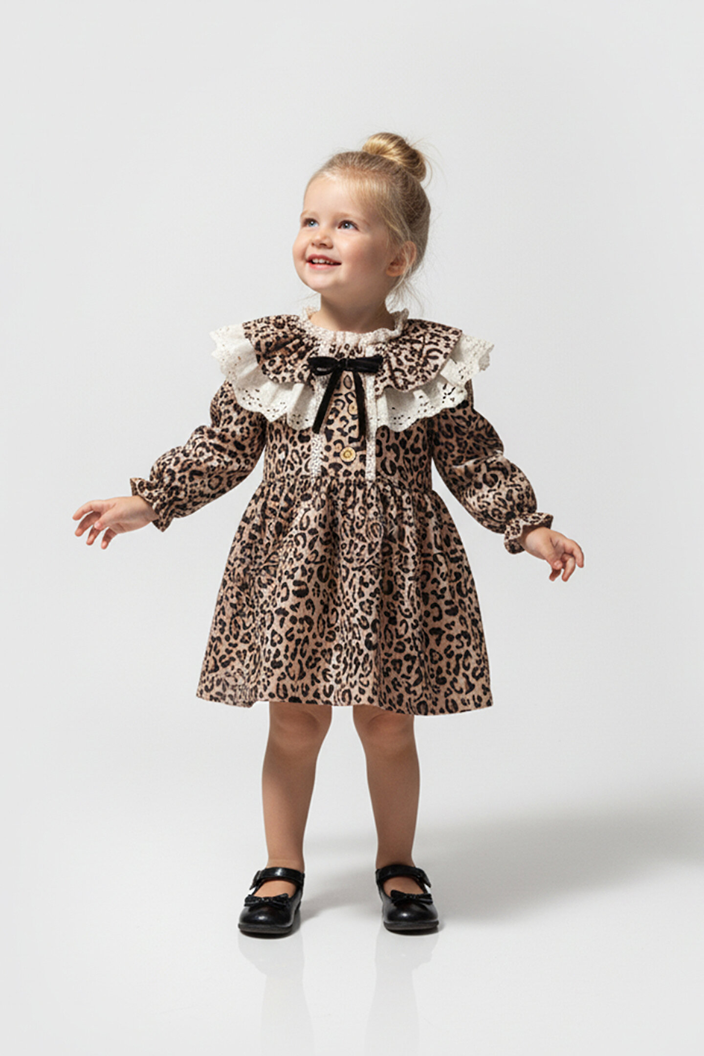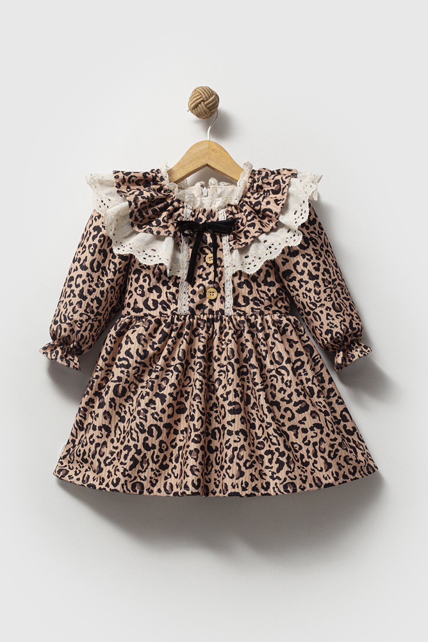 Mevsimlik Uzun Kollu Leopar Dantel Detaylı Kız Çocuk Elbisesi: Küçük prensesinizin özel günlerde zarafetini ve şıklığını ön plana çıkaracak bu elbise, önünde bulunan Leopar fiyonk detayı ve dantel işlemeleriyle tasarlanmıştır.; Özellikler: Dantel Detaylar: Elbisenin ön kısmında ve kollarda bulunan dantel detaylar, zarafet ve incelik katarken, küçük prensesinizin görünümünü daha etkileyici hale getirir.; Önünde Leopar Fiyonk Detayı: Elbisenin ön kısmında bulunan fiyonk detayı, sevimliliği ve şıklığı artırır.; Küçük prensesinizin görünümüne hoş bir dokunuş ekler.; Uzun Kollu Tasarım:Rahatlıkla giyilebilecek Uzun kollu tasarım, bebeğinizin serin kalmasını sağlar ve özgürce hareket etmesine olanak tanır.; Mevsimlik Kullanıma Uygun: Hafif yapısı ve nefes alabilen kumaşıyla rahatlıkla giyilebilir.; Özel Günler İçin Uygun: Özel günlerde tercih edilebilecek şık tasarımıyla bebeğinizin her anında göz kamaştırmasını sağlar.; Bu önü fiyonklu ve dantel detaylı Uzun kollu kız çocuk elbisesi, küçük prensesinizin şık kalmasını sağlarken, aynı zamanda özel günlerde de zarafetini tamamlar.; Zarif detaylarıyla bezenmiş bu elbise, bebeğinizin tarzını ve güzelliğini ön plana çıkarır.