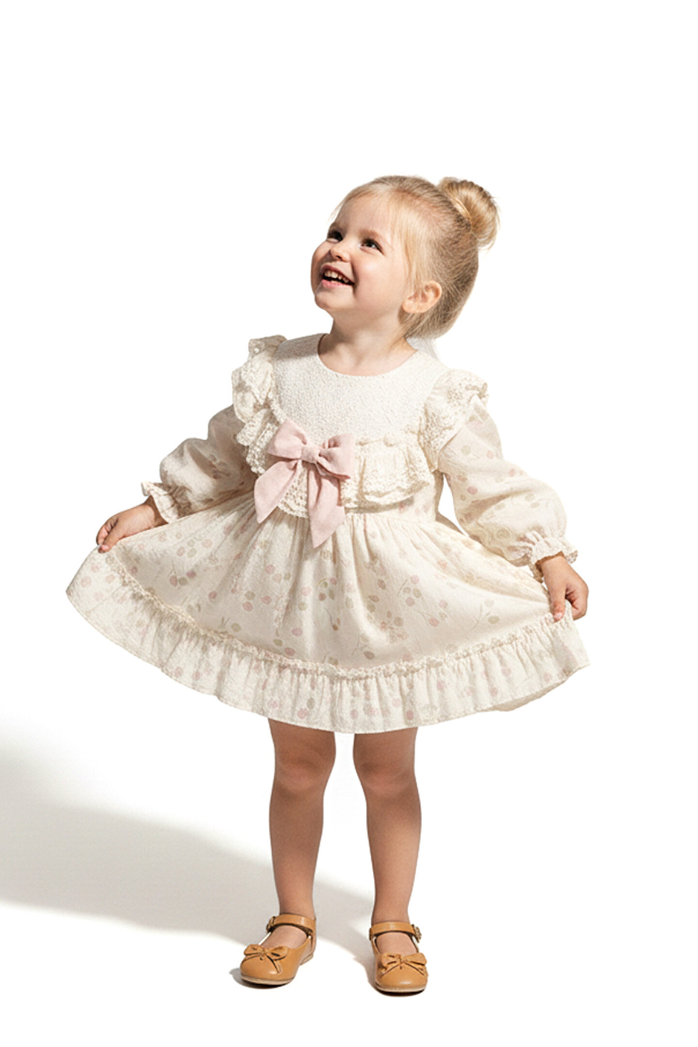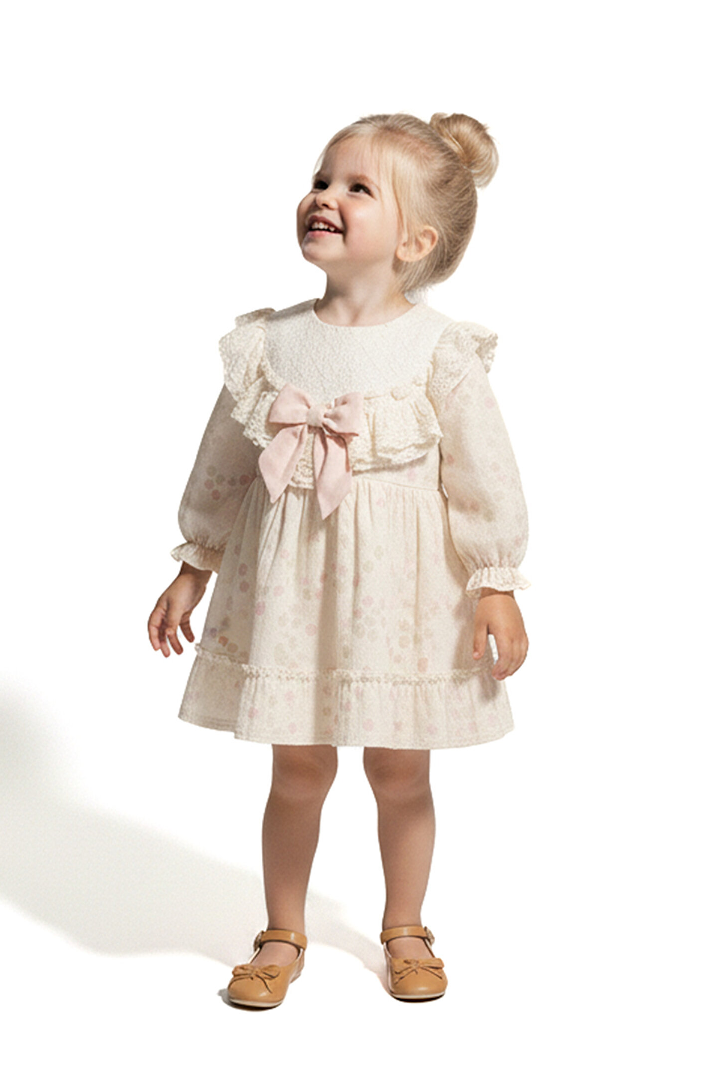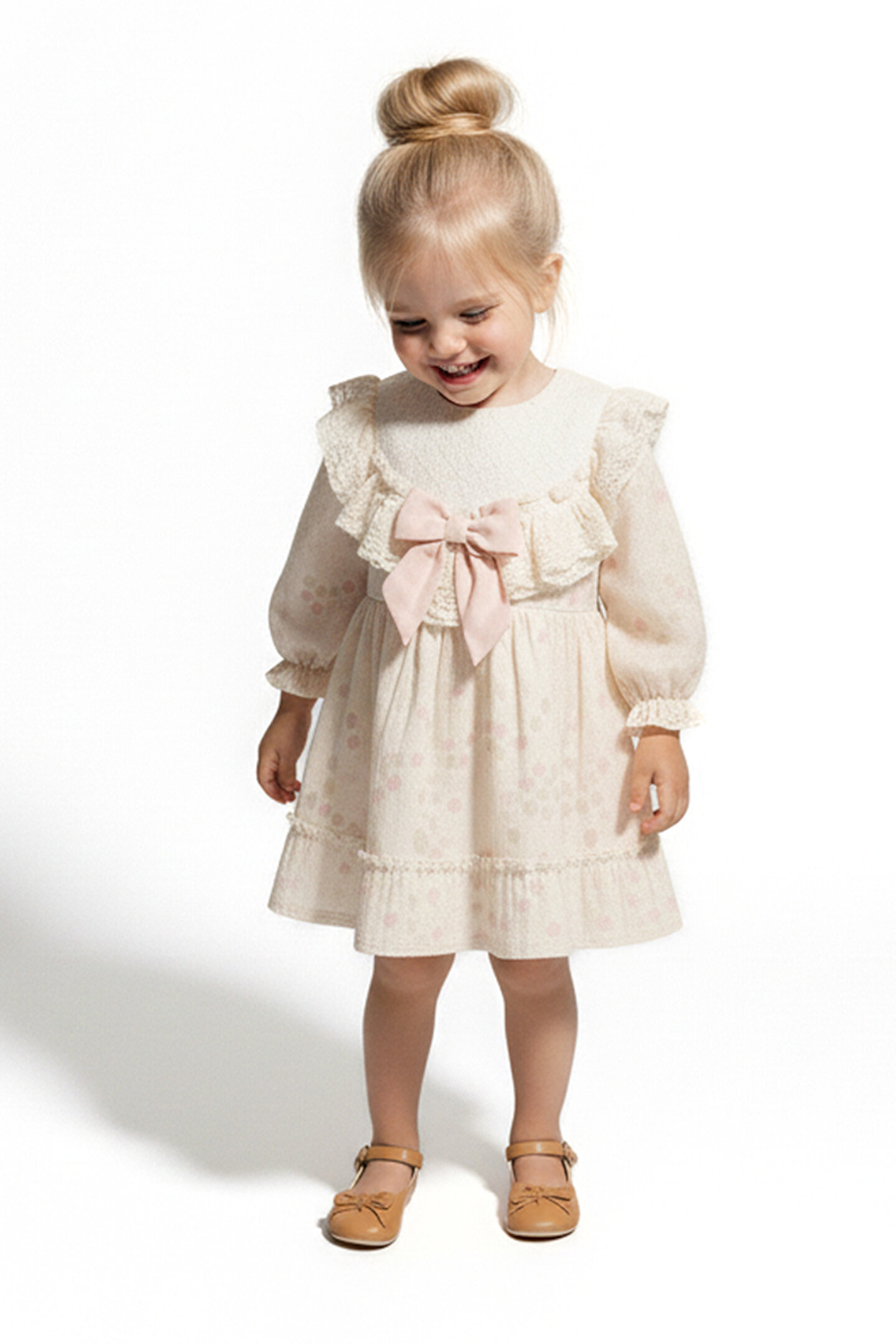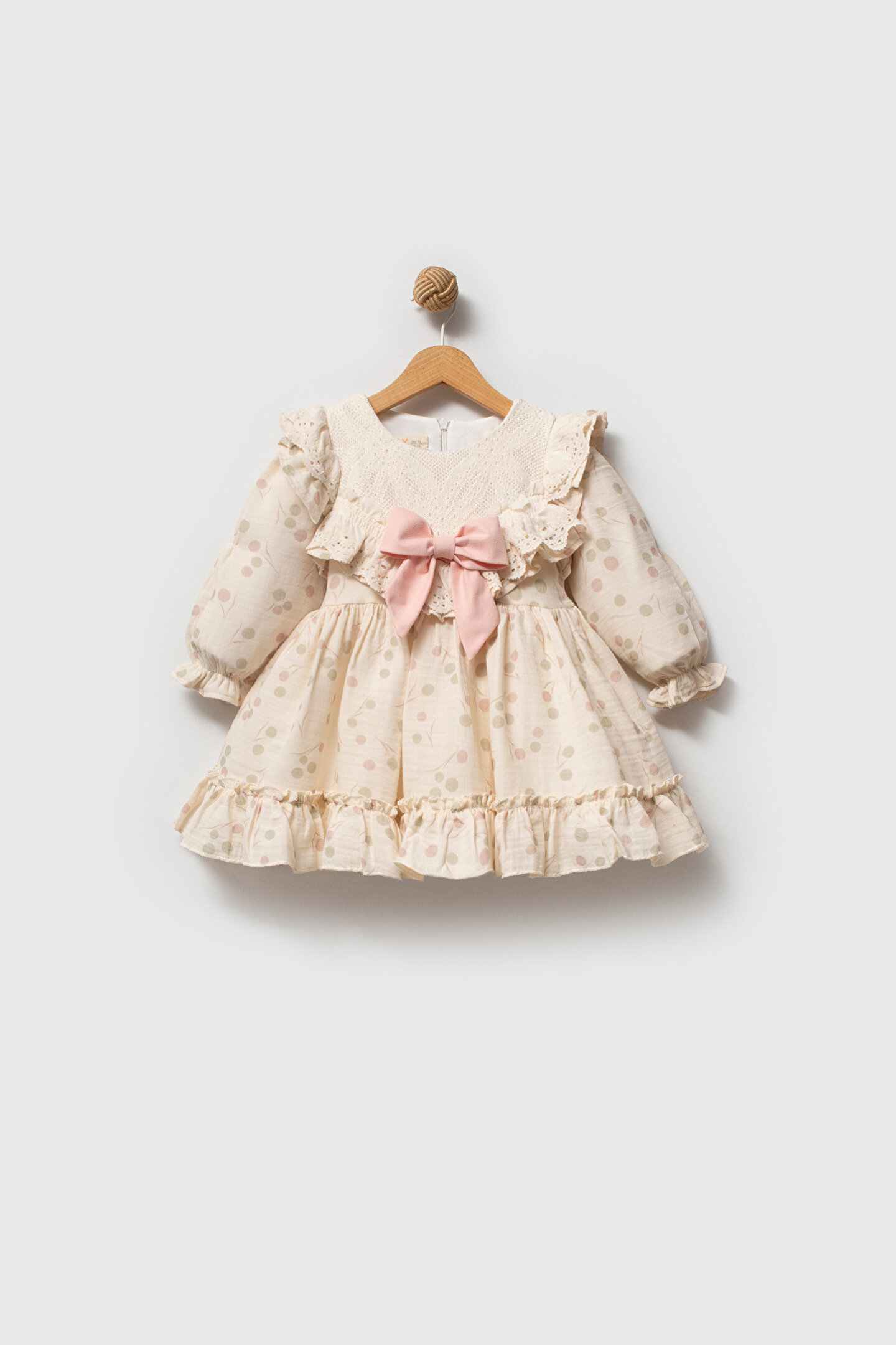 Mevsimlik Uzun Kollu Dantel Detaylı Kız Çocuk Elbisesi: Küçük prensesinizin özel günlerde zarafetini ve şıklığını ön plana çıkaracak bu elbise, önünde bulunan Yakalı fiyonk detayı ve dantel işlemeleriyle tasarlanmıştır.; Özellikler: Dantel Detaylar: Elbisenin ön kısmında ve kollarda bulunan dantel detaylar, zarafet ve incelik katarken, küçük prensesinizin görünümünü daha etkileyici hale getirir.; Önünde Yakalı Fiyonk Detayı: Elbisenin ön kısmında bulunan fiyonk detayı, sevimliliği ve şıklığı artırır.; Küçük prensesinizin görünümüne hoş bir dokunuş ekler.; Uzun Kollu Tasarım:Rahatlıkla giyilebilecek Uzun kollu tasarım, bebeğinizin serin kalmasını sağlar ve özgürce hareket etmesine olanak tanır.; Mevsimlik Kullanıma Uygun: Hafif yapısı ve nefes alabilen kumaşıyla rahatlıkla giyilebilir.; Özel Günler İçin Uygun: Özel günlerde tercih edilebilecek şık tasarımıyla bebeğinizin her anında göz kamaştırmasını sağlar.; Bu önü Yakalı fiyonklu ve dantel detaylı Uzun kollu kız çocuk elbisesi, küçük prensesinizin şık kalmasını sağlarken, aynı zamanda özel günlerde de zarafetini tamamlar.; Zarif detaylarıyla bezenmiş bu elbise, bebeğinizin tarzını ve güzelliğini ön plana çıkarır.
