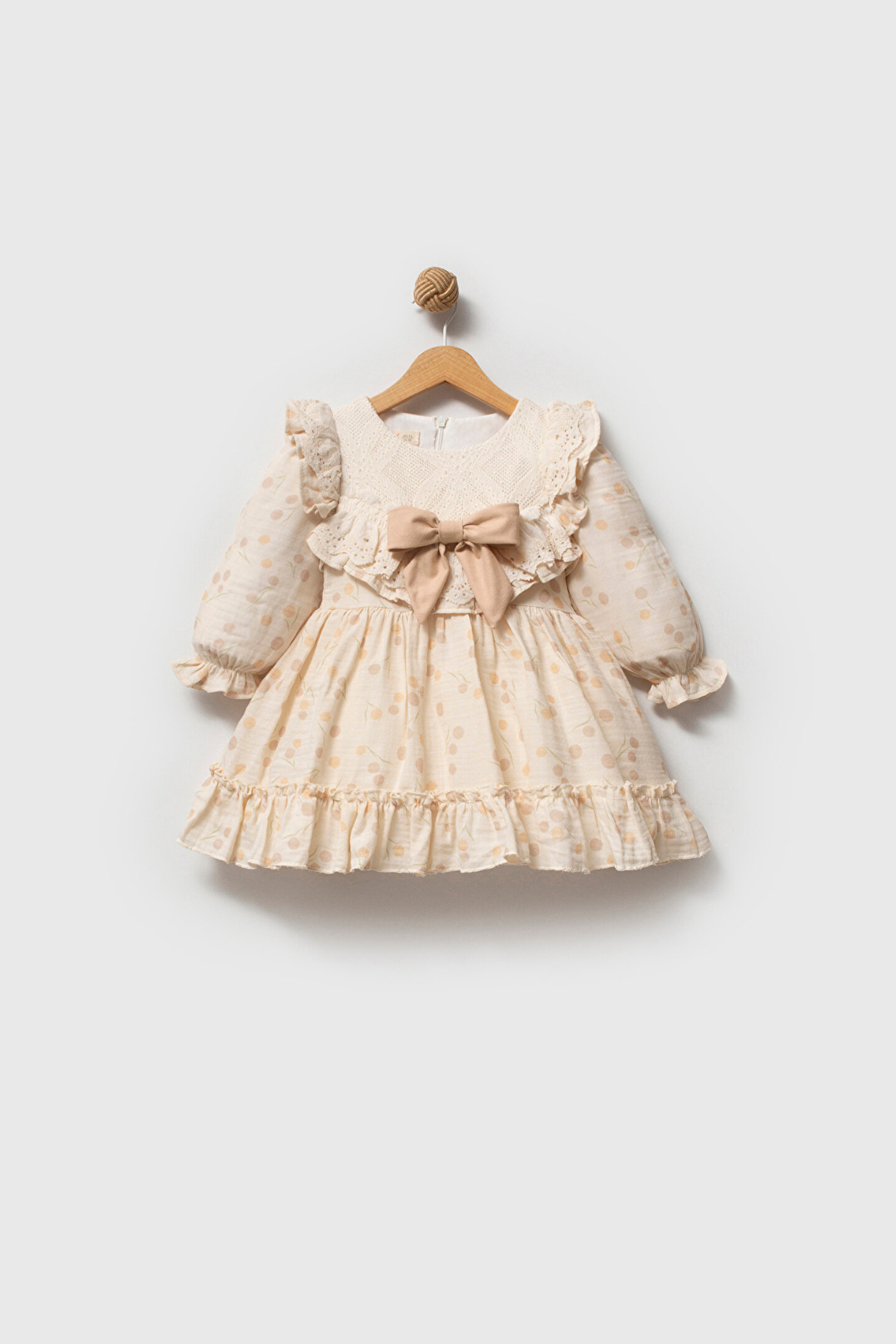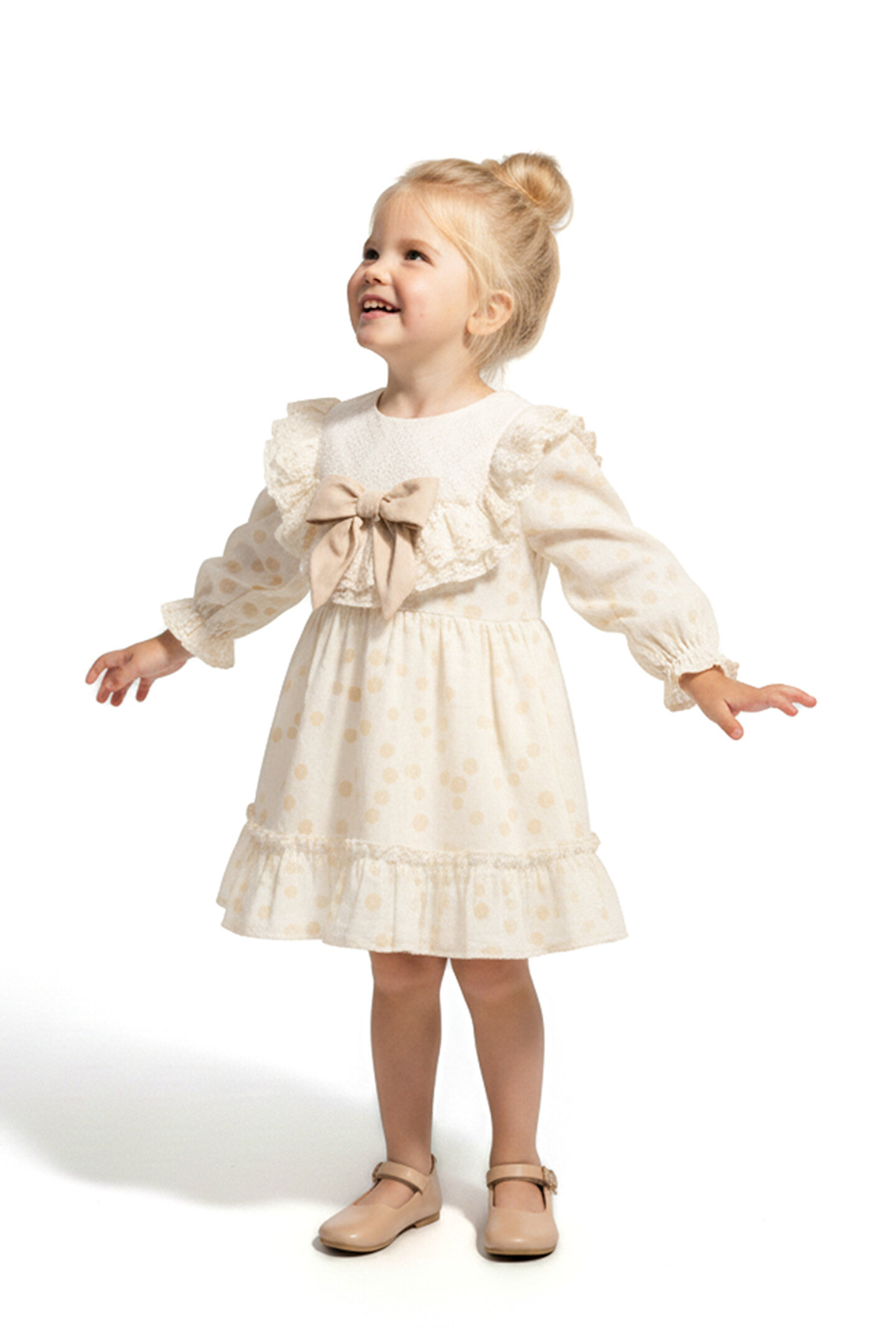 Mevsimlik Uzun Kollu Dantel Detaylı Kız Çocuk Elbisesi: Küçük prensesinizin özel günlerde zarafetini ve şıklığını ön plana çıkaracak bu elbise, önünde bulunan Yakalı fiyonk detayı ve dantel işlemeleriyle tasarlanmıştır.; Özellikler: Dantel Detaylar: Elbisenin ön kısmında ve kollarda bulunan dantel detaylar, zarafet ve incelik katarken, küçük prensesinizin görünümünü daha etkileyici hale getirir.; Önünde Yakalı Fiyonk Detayı: Elbisenin ön kısmında bulunan fiyonk detayı, sevimliliği ve şıklığı artırır.; Küçük prensesinizin görünümüne hoş bir dokunuş ekler.; Uzun Kollu Tasarım:Rahatlıkla giyilebilecek Uzun kollu tasarım, bebeğinizin serin kalmasını sağlar ve özgürce hareket etmesine olanak tanır.; Mevsimlik Kullanıma Uygun: Hafif yapısı ve nefes alabilen kumaşıyla rahatlıkla giyilebilir.; Özel Günler İçin Uygun: Özel günlerde tercih edilebilecek şık tasarımıyla bebeğinizin her anında göz kamaştırmasını sağlar.; Bu önü Yakalı fiyonklu ve dantel detaylı Uzun kollu kız çocuk elbisesi, küçük prensesinizin şık kalmasını sağlarken, aynı zamanda özel günlerde de zarafetini tamamlar.; Zarif detaylarıyla bezenmiş bu elbise, bebeğinizin tarzını ve güzelliğini ön plana çıkarır.