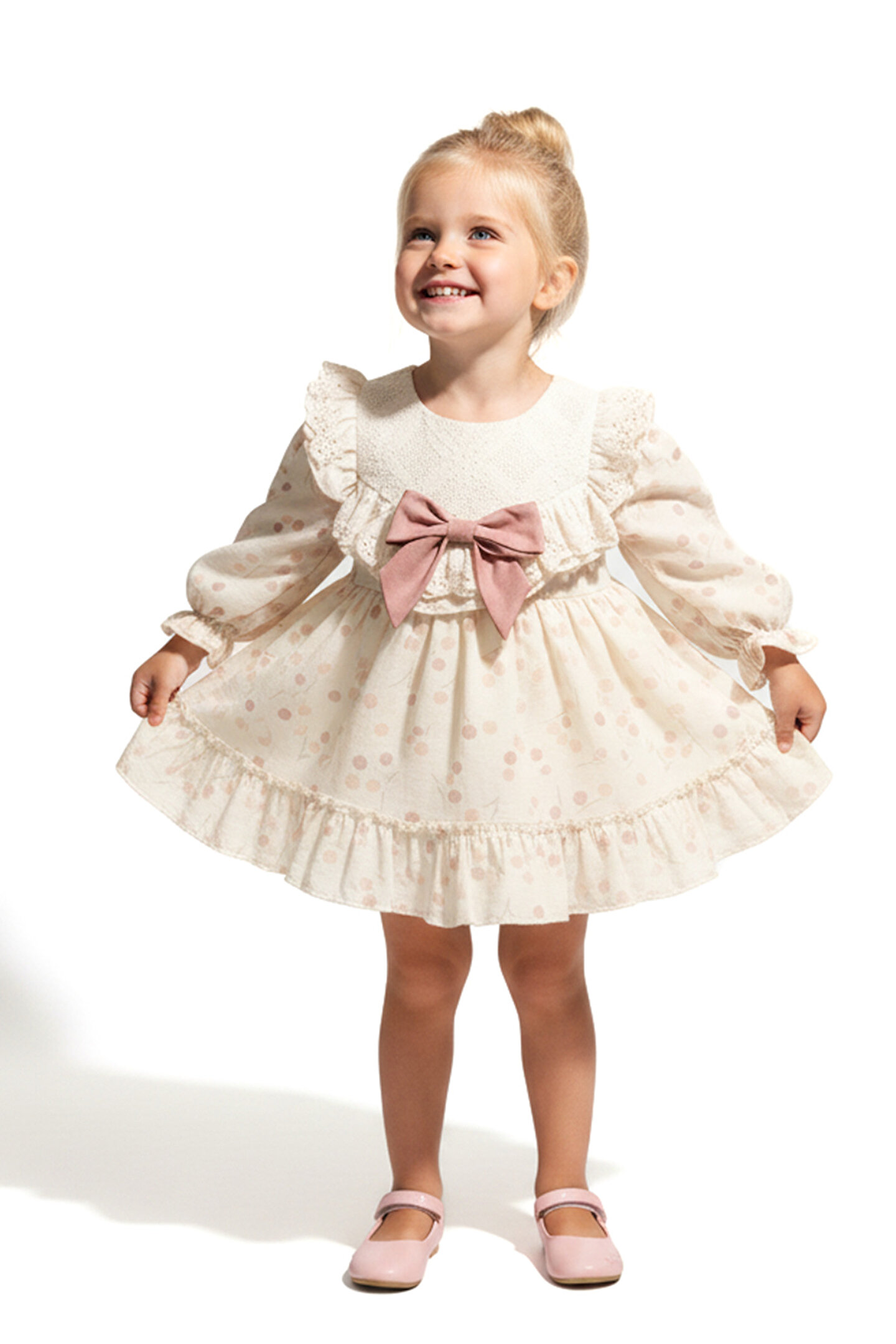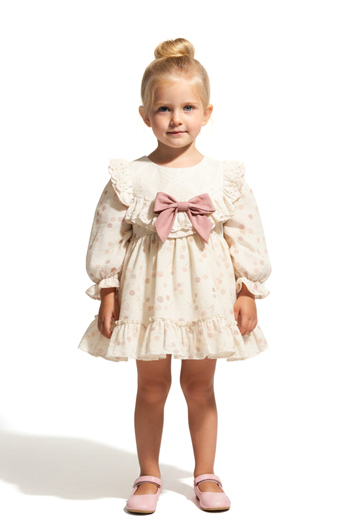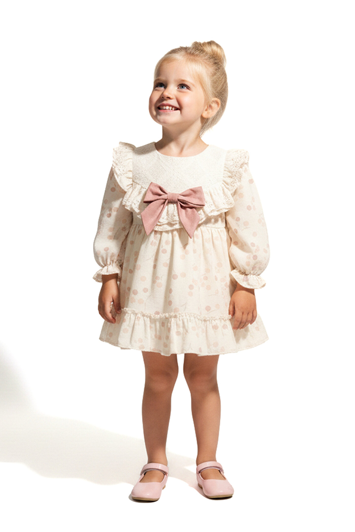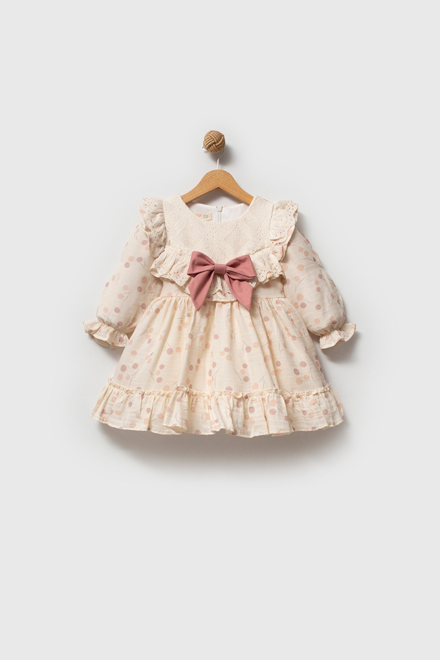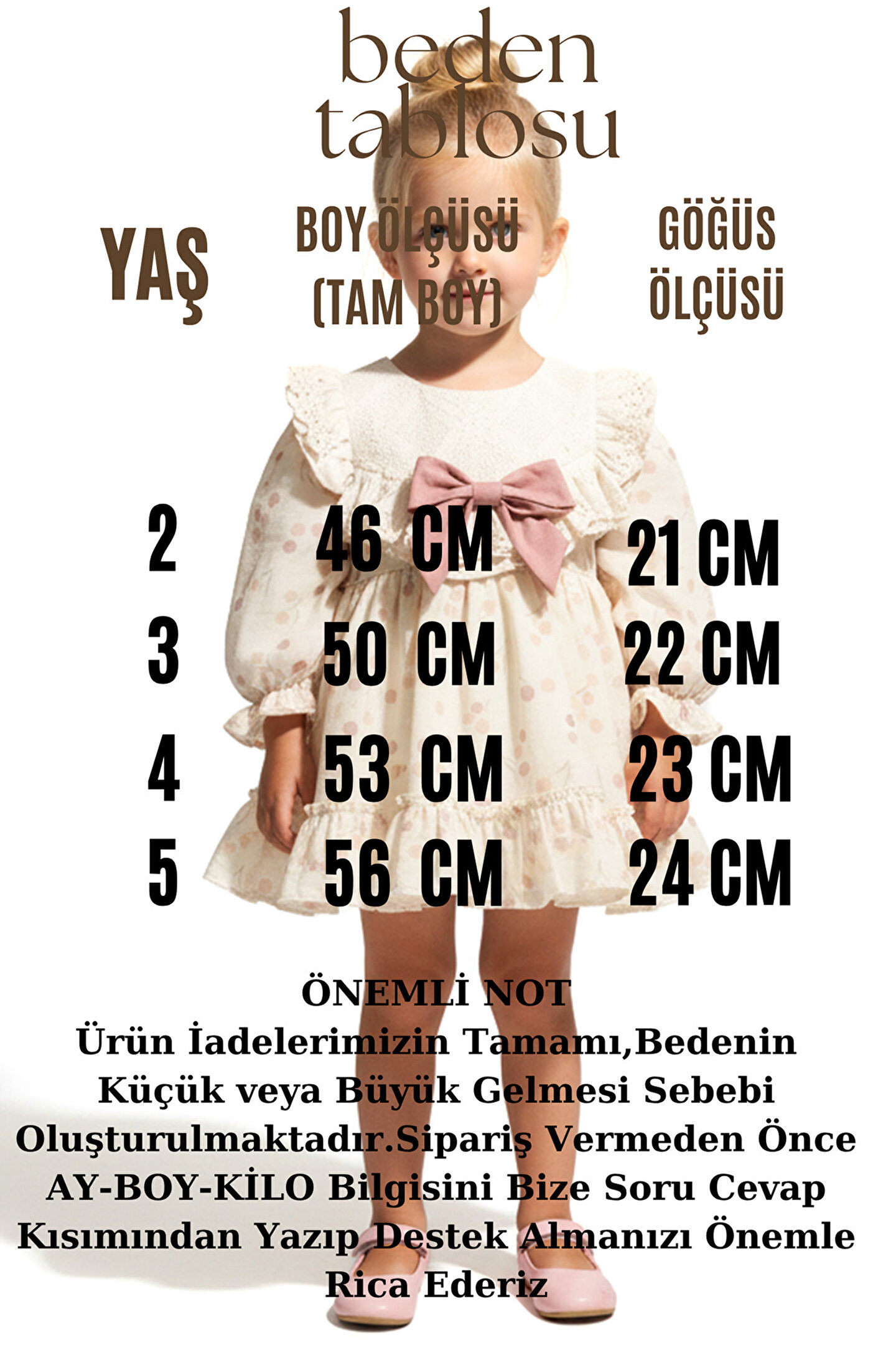 Mevsimlik Uzun Kollu Dantel Detaylı Kız Çocuk Elbisesi: Küçük prensesinizin özel günlerde zarafetini ve şıklığını ön plana çıkaracak bu elbise, önünde bulunan Yakalı fiyonk detayı ve dantel işlemeleriyle tasarlanmıştır.; Özellikler: Dantel Detaylar: Elbisenin ön kısmında ve kollarda bulunan dantel detaylar, zarafet ve incelik katarken, küçük prensesinizin görünümünü daha etkileyici hale getirir.; Önünde Yakalı Fiyonk Detayı: Elbisenin ön kısmında bulunan fiyonk detayı, sevimliliği ve şıklığı artırır.; Küçük prensesinizin görünümüne hoş bir dokunuş ekler.; Uzun Kollu Tasarım:Rahatlıkla giyilebilecek Uzun kollu tasarım, bebeğinizin serin kalmasını sağlar ve özgürce hareket etmesine olanak tanır.; Mevsimlik Kullanıma Uygun: Hafif yapısı ve nefes alabilen kumaşıyla rahatlıkla giyilebilir.; Özel Günler İçin Uygun: Özel günlerde tercih edilebilecek şık tasarımıyla bebeğinizin her anında göz kamaştırmasını sağlar.; Bu önü Yakalı fiyonklu ve dantel detaylı Uzun kollu kız çocuk elbisesi, küçük prensesinizin şık kalmasını sağlarken, aynı zamanda özel günlerde de zarafetini tamamlar.; Zarif detaylarıyla bezenmiş bu elbise, bebeğinizin tarzını ve güzelliğini ön plana çıkarır.