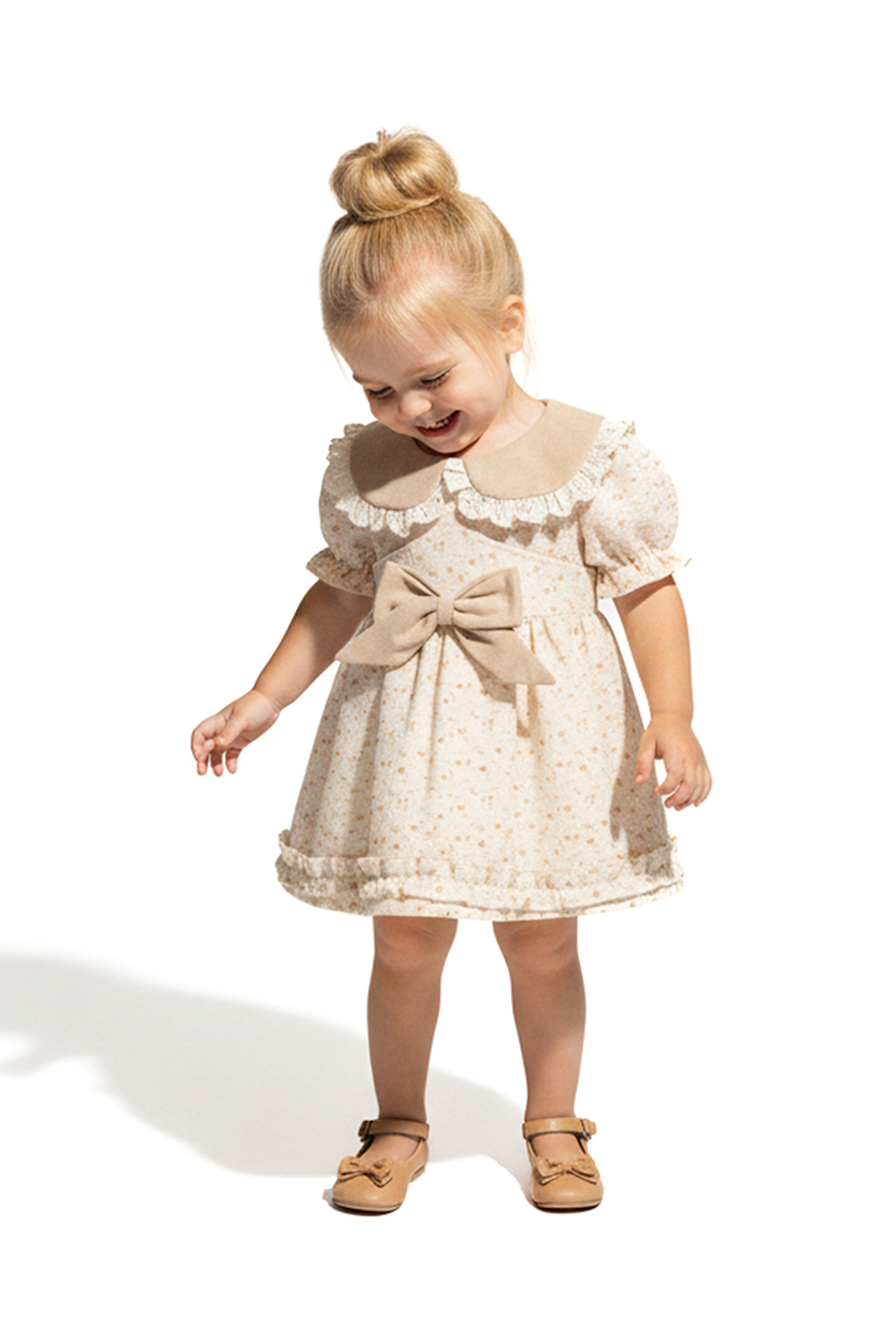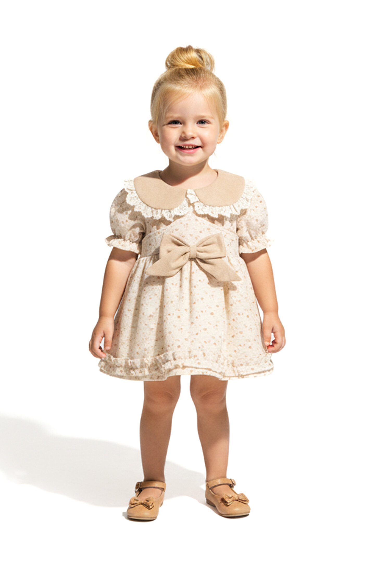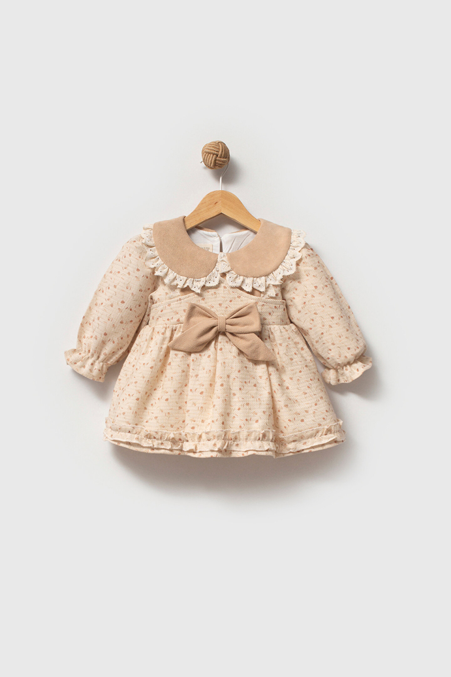 Mevsimlik Uzun Kollu Dantel Detaylı Kız Çocuk Elbisesi: Küçük prensesinizin özel günlerde zarafetini ve şıklığını ön plana çıkaracak bu elbise, önünde bulunan Yakalı fiyonk detayı ve dantel işlemeleriyle tasarlanmıştır.; Özellikler: Dantel Detaylar: Elbisenin ön kısmında ve kollarda bulunan dantel detaylar, zarafet ve incelik katarken, küçük prensesinizin görünümünü daha etkileyici hale getirir.; Önünde Yakalı Fiyonk Detayı: Elbisenin ön kısmında bulunan fiyonk detayı, sevimliliği ve şıklığı artırır.; Küçük prensesinizin görünümüne hoş bir dokunuş ekler.; Uzun Kollu Tasarım:Rahatlıkla giyilebilecek Uzun kollu tasarım, bebeğinizin serin kalmasını sağlar ve özgürce hareket etmesine olanak tanır.; Mevsimlik Kullanıma Uygun: Hafif yapısı ve nefes alabilen kumaşıyla rahatlıkla giyilebilir.; Özel Günler İçin Uygun: Özel günlerde tercih edilebilecek şık tasarımıyla bebeğinizin her anında göz kamaştırmasını sağlar.; Bu önü Yakalı fiyonklu ve dantel detaylı Uzun kollu kız çocuk elbisesi, küçük prensesinizin şık kalmasını sağlarken, aynı zamanda özel günlerde de zarafetini tamamlar.; Zarif detaylarıyla bezenmiş bu elbise, bebeğinizin tarzını ve güzelliğini ön plana çıkarır.