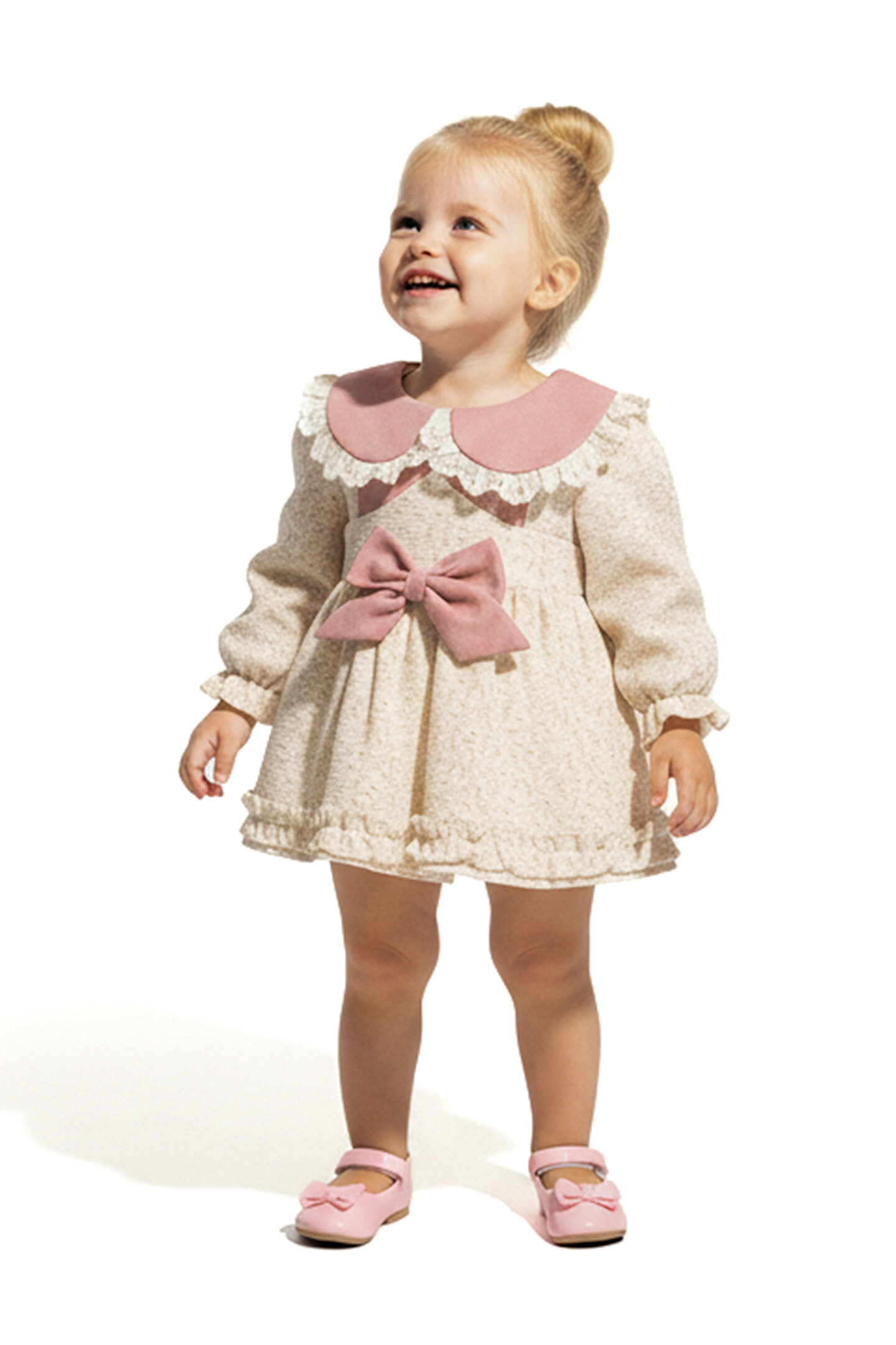 Mevsimlik Uzun Kollu Dantel Detaylı Kız Çocuk Elbisesi: Küçük prensesinizin özel günlerde zarafetini ve şıklığını ön plana çıkaracak bu elbise, önünde bulunan Yakalı fiyonk detayı ve dantel işlemeleriyle tasarlanmıştır.; Özellikler: Dantel Detaylar: Elbisenin ön kısmında ve kollarda bulunan dantel detaylar, zarafet ve incelik katarken, küçük prensesinizin görünümünü daha etkileyici hale getirir.; Önünde Yakalı Fiyonk Detayı: Elbisenin ön kısmında bulunan fiyonk detayı, sevimliliği ve şıklığı artırır.; Küçük prensesinizin görünümüne hoş bir dokunuş ekler.; Uzun Kollu Tasarım:Rahatlıkla giyilebilecek Uzun kollu tasarım, bebeğinizin serin kalmasını sağlar ve özgürce hareket etmesine olanak tanır.; Mevsimlik Kullanıma Uygun: Hafif yapısı ve nefes alabilen kumaşıyla rahatlıkla giyilebilir.; Özel Günler İçin Uygun: Özel günlerde tercih edilebilecek şık tasarımıyla bebeğinizin her anında göz kamaştırmasını sağlar.; Bu önü Yakalı fiyonklu ve dantel detaylı Uzun kollu kız çocuk elbisesi, küçük prensesinizin şık kalmasını sağlarken, aynı zamanda özel günlerde de zarafetini tamamlar.; Zarif detaylarıyla bezenmiş bu elbise, bebeğinizin tarzını ve güzelliğini ön plana çıkarır.