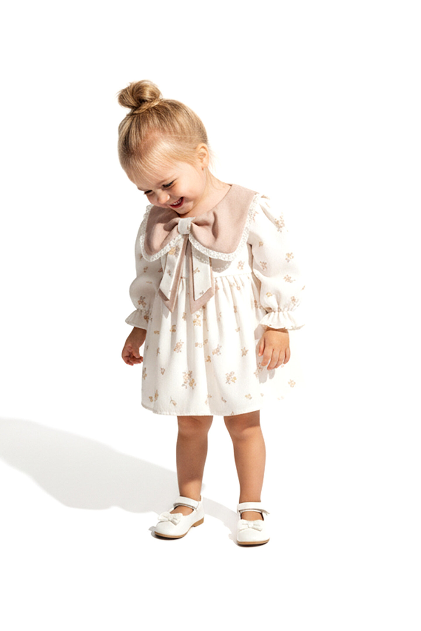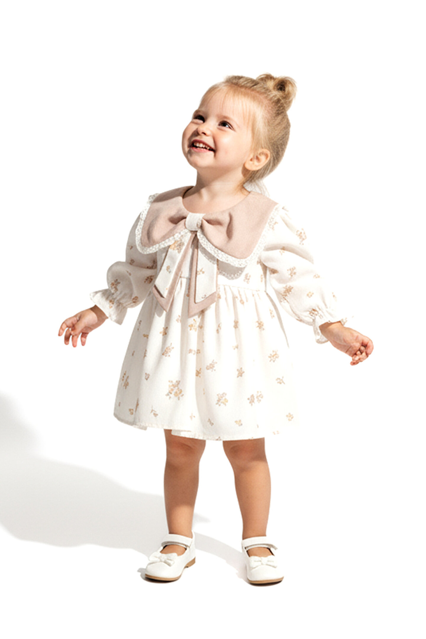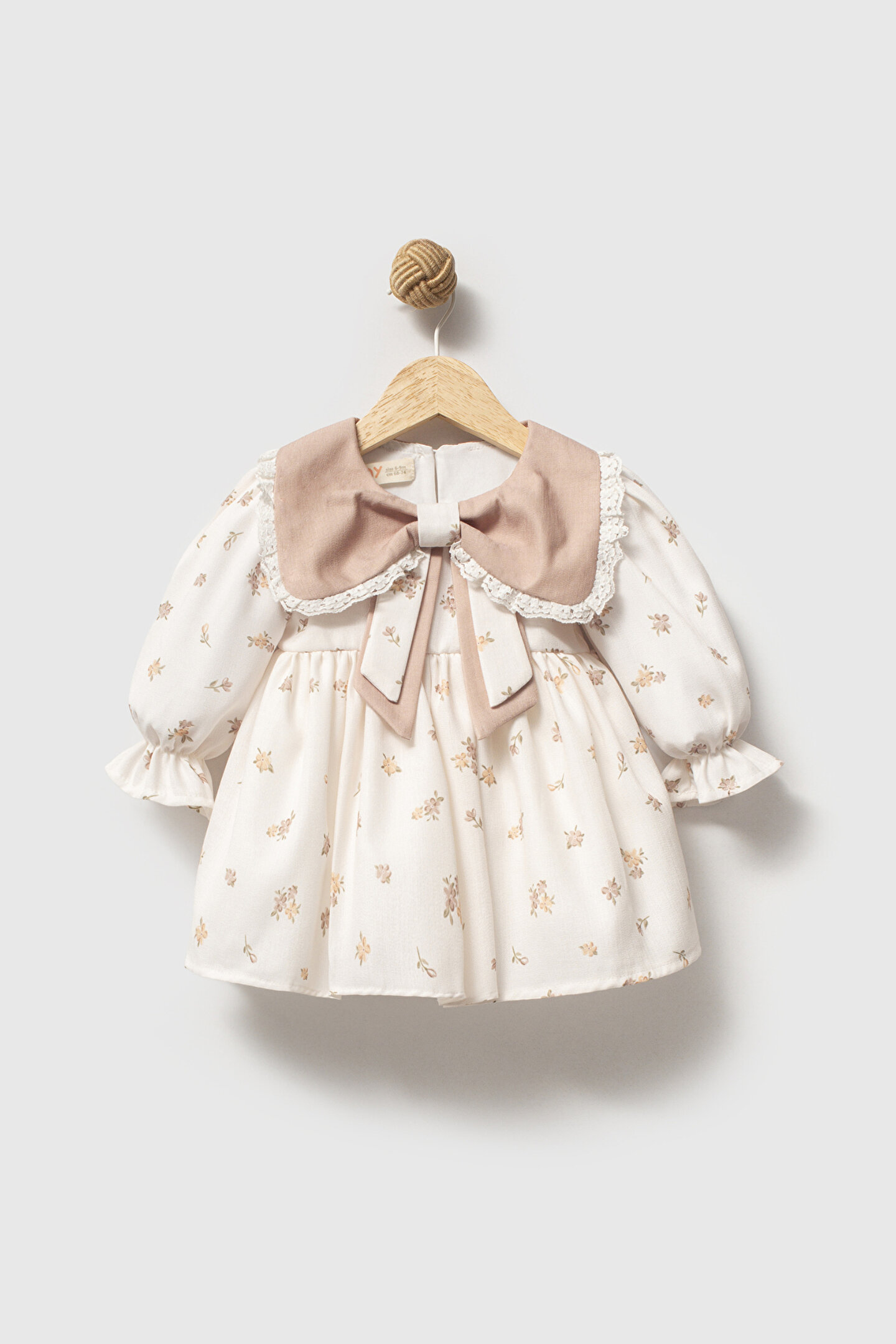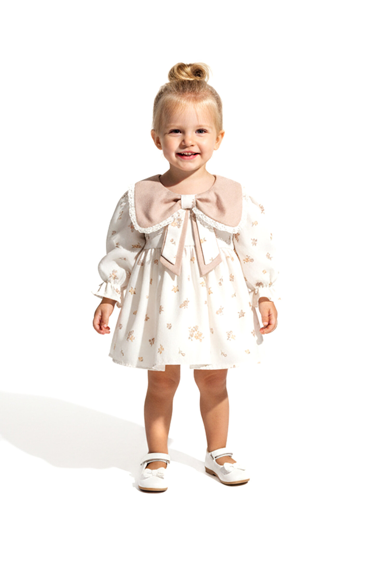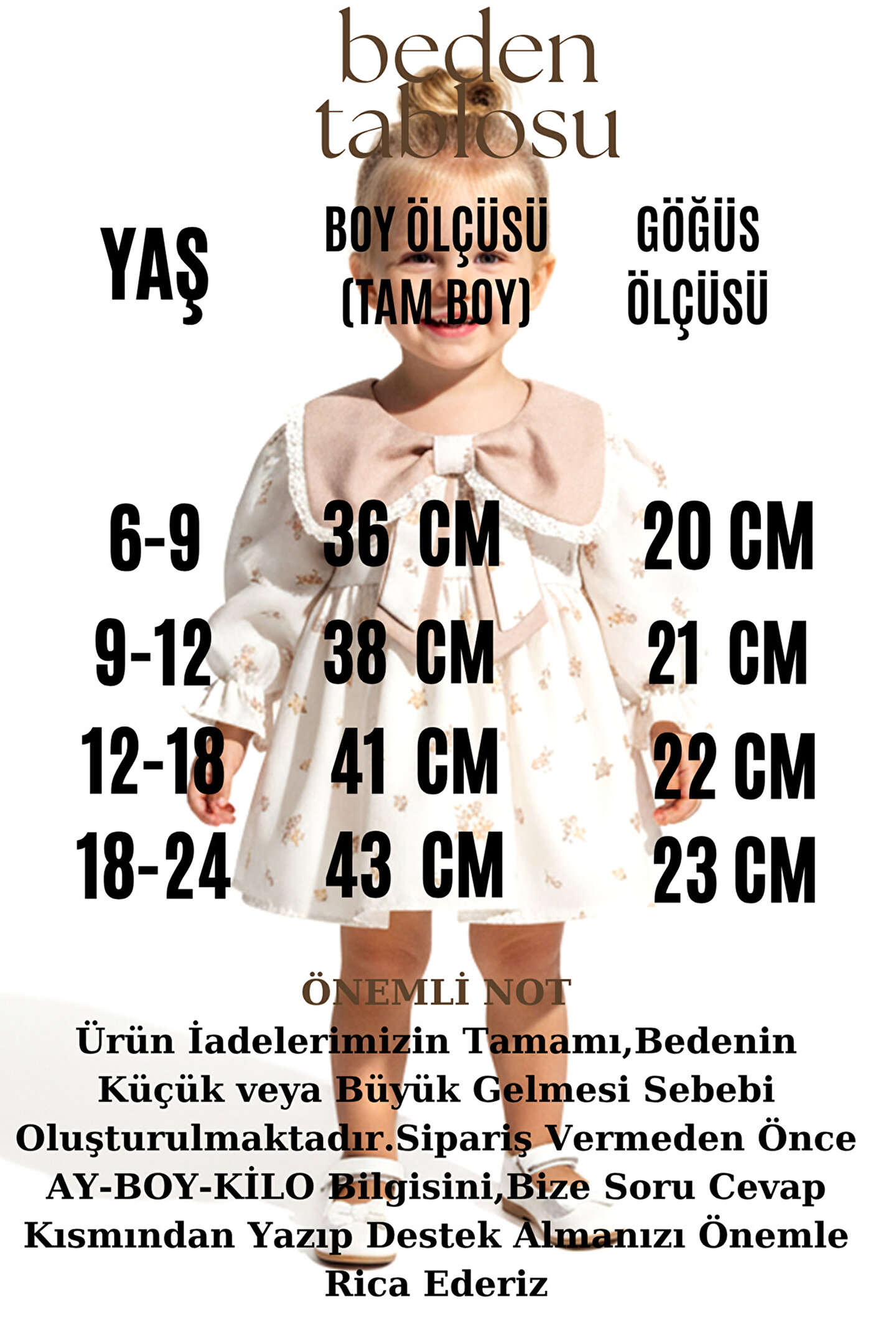 Mevsimlik Uzun Kollu Dantel Detaylı Kız Çocuk Elbisesi: Küçük prensesinizin özel günlerde zarafetini ve şıklığını ön plana çıkaracak bu elbise, önünde bulunan Yakalı fiyonk detayı ve dantel işlemeleriyle tasarlanmıştır.; Özellikler: Dantel Detaylar: Elbisenin ön kısmında ve kollarda bulunan dantel detaylar, zarafet ve incelik katarken, küçük prensesinizin görünümünü daha etkileyici hale getirir.; Önünde Yakalı Fiyonk Detayı: Elbisenin ön kısmında bulunan fiyonk detayı, sevimliliği ve şıklığı artırır.; Küçük prensesinizin görünümüne hoş bir dokunuş ekler.; Uzun Kollu Tasarım:Rahatlıkla giyilebilecek Uzun kollu tasarım, bebeğinizin serin kalmasını sağlar ve özgürce hareket etmesine olanak tanır.; Mevsimlik Kullanıma Uygun: Hafif yapısı ve nefes alabilen kumaşıyla rahatlıkla giyilebilir.; Özel Günler İçin Uygun: Özel günlerde tercih edilebilecek şık tasarımıyla bebeğinizin her anında göz kamaştırmasını sağlar.; Bu önü Yakalı fiyonklu ve dantel detaylı Uzun kollu kız çocuk elbisesi, küçük prensesinizin şık kalmasını sağlarken, aynı zamanda özel günlerde de zarafetini tamamlar.; Zarif detaylarıyla bezenmiş bu elbise, bebeğinizin tarzını ve güzelliğini ön plana çıkarır.