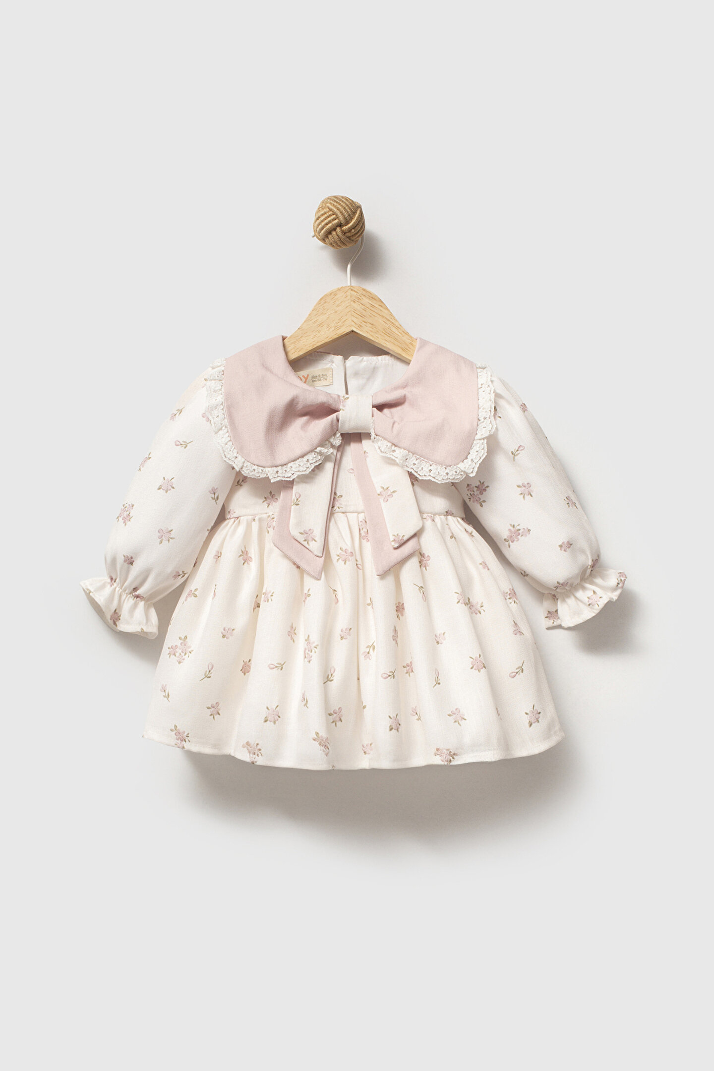 Mevsimlik Uzun Kollu Dantel Detaylı Kız Çocuk Elbisesi: Küçük prensesinizin özel günlerde zarafetini ve şıklığını ön plana çıkaracak bu elbise, önünde bulunan Yakalı fiyonk detayı ve dantel işlemeleriyle tasarlanmıştır.; Özellikler: Dantel Detaylar: Elbisenin ön kısmında ve kollarda bulunan dantel detaylar, zarafet ve incelik katarken, küçük prensesinizin görünümünü daha etkileyici hale getirir.; Önünde Yakalı Fiyonk Detayı: Elbisenin ön kısmında bulunan fiyonk detayı, sevimliliği ve şıklığı artırır.; Küçük prensesinizin görünümüne hoş bir dokunuş ekler.; Uzun Kollu Tasarım:Rahatlıkla giyilebilecek Uzun kollu tasarım, bebeğinizin serin kalmasını sağlar ve özgürce hareket etmesine olanak tanır.; Mevsimlik Kullanıma Uygun: Hafif yapısı ve nefes alabilen kumaşıyla rahatlıkla giyilebilir.; Özel Günler İçin Uygun: Özel günlerde tercih edilebilecek şık tasarımıyla bebeğinizin her anında göz kamaştırmasını sağlar.; Bu önü Yakalı fiyonklu ve dantel detaylı Uzun kollu kız çocuk elbisesi, küçük prensesinizin şık kalmasını sağlarken, aynı zamanda özel günlerde de zarafetini tamamlar.; Zarif detaylarıyla bezenmiş bu elbise, bebeğinizin tarzını ve güzelliğini ön plana çıkarır.