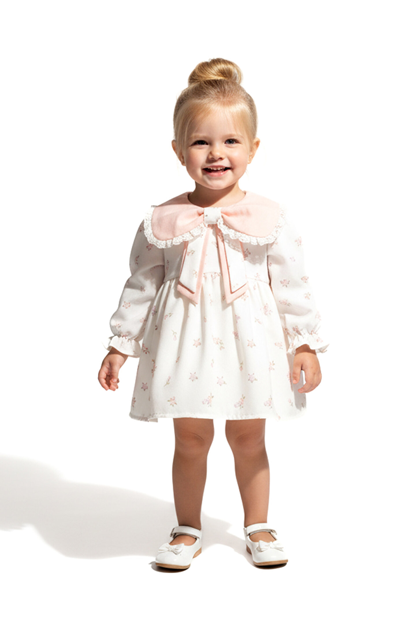 Mevsimlik Uzun Kollu Dantel Detaylı Kız Çocuk Elbisesi: Küçük prensesinizin özel günlerde zarafetini ve şıklığını ön plana çıkaracak bu elbise, önünde bulunan Yakalı fiyonk detayı ve dantel işlemeleriyle tasarlanmıştır.; Özellikler: Dantel Detaylar: Elbisenin ön kısmında ve kollarda bulunan dantel detaylar, zarafet ve incelik katarken, küçük prensesinizin görünümünü daha etkileyici hale getirir.; Önünde Yakalı Fiyonk Detayı: Elbisenin ön kısmında bulunan fiyonk detayı, sevimliliği ve şıklığı artırır.; Küçük prensesinizin görünümüne hoş bir dokunuş ekler.; Uzun Kollu Tasarım:Rahatlıkla giyilebilecek Uzun kollu tasarım, bebeğinizin serin kalmasını sağlar ve özgürce hareket etmesine olanak tanır.; Mevsimlik Kullanıma Uygun: Hafif yapısı ve nefes alabilen kumaşıyla rahatlıkla giyilebilir.; Özel Günler İçin Uygun: Özel günlerde tercih edilebilecek şık tasarımıyla bebeğinizin her anında göz kamaştırmasını sağlar.; Bu önü Yakalı fiyonklu ve dantel detaylı Uzun kollu kız çocuk elbisesi, küçük prensesinizin şık kalmasını sağlarken, aynı zamanda özel günlerde de zarafetini tamamlar.; Zarif detaylarıyla bezenmiş bu elbise, bebeğinizin tarzını ve güzelliğini ön plana çıkarır.