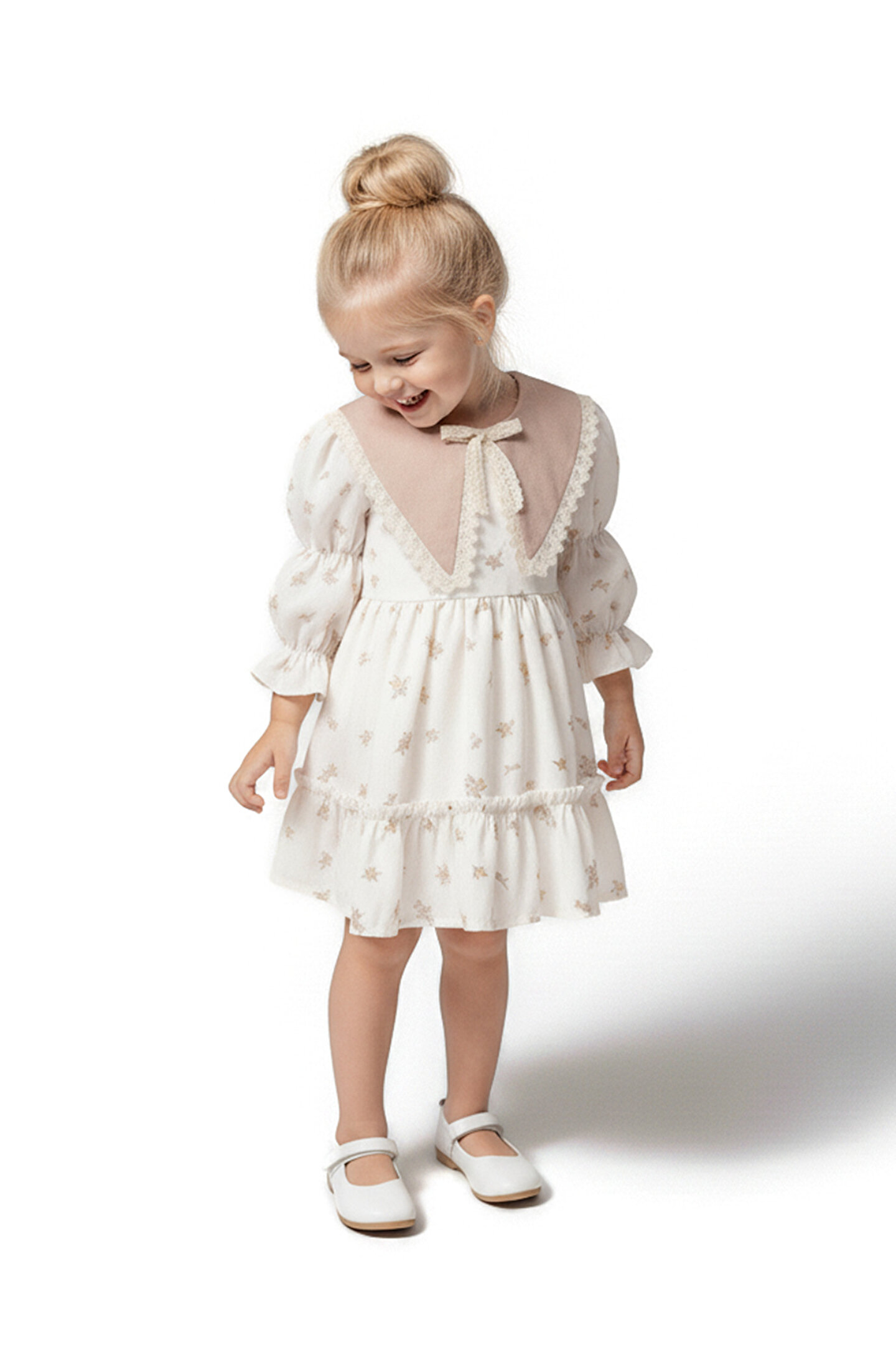 Mevsimlik Uzun Kollu Yakalı Dantel Detaylı Kız Çocuk Elbisesi: Küçük prensesinizin özel günlerde zarafetini ve şıklığını ön plana çıkaracak bu elbise, önünde bulunan Yakalı fiyonk detayı ve dantel işlemeleriyle tasarlanmıştır.; Özellikler: Dantel Detaylar: Elbisenin ön kısmında ve kollarda bulunan dantel detaylar, zarafet ve incelik katarken, küçük prensesinizin görünümünü daha etkileyici hale getirir.; Önünde Yakalı Fiyonk Detayı: Elbisenin ön kısmında bulunan fiyonk detayı, sevimliliği ve şıklığı artırır.; Küçük prensesinizin görünümüne hoş bir dokunuş ekler.; Uzun Kollu Tasarım:Rahatlıkla giyilebilecek Uzun kollu tasarım, bebeğinizin serin kalmasını sağlar ve özgürce hareket etmesine olanak tanır.; Mevsimlik Kullanıma Uygun: Hafif yapısı ve nefes alabilen kumaşıyla rahatlıkla giyilebilir.; Özel Günler İçin Uygun: Özel günlerde tercih edilebilecek şık tasarımıyla bebeğinizin her anında göz kamaştırmasını sağlar.; Bu önü Yakalı fiyonklu ve dantel detaylı Uzun kollu kız çocuk elbisesi, küçük prensesinizin şık kalmasını sağlarken, aynı zamanda özel günlerde de zarafetini tamamlar.; Zarif detaylarıyla bezenmiş bu elbise, bebeğinizin tarzını ve güzelliğini ön plana çıkarır.