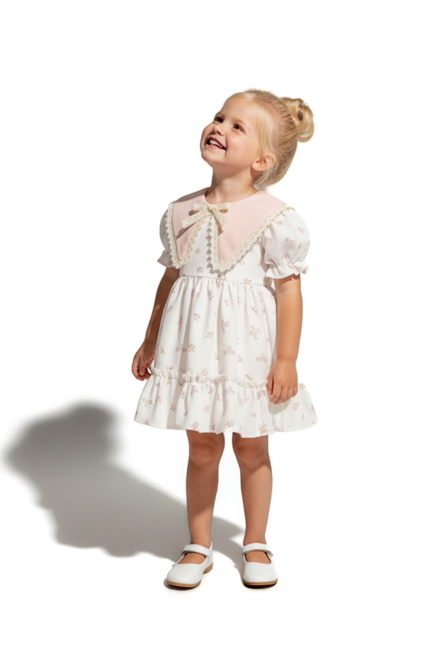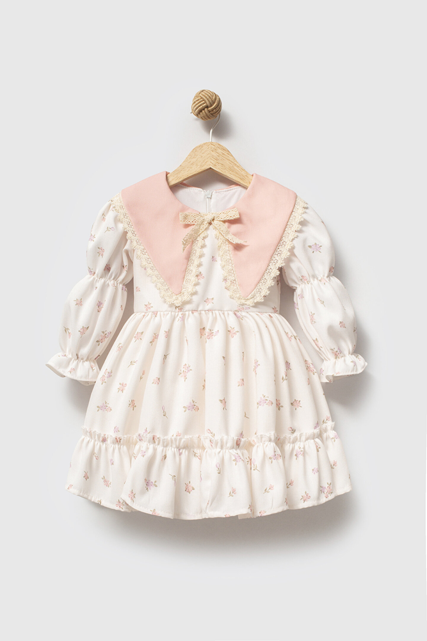 Mevsimlik Uzun Kollu Yakalı Dantel Detaylı Kız Çocuk Elbisesi: Küçük prensesinizin özel günlerde zarafetini ve şıklığını ön plana çıkaracak bu elbise, önünde bulunan Yakalı fiyonk detayı ve dantel işlemeleriyle tasarlanmıştır.; Özellikler: Dantel Detaylar: Elbisenin ön kısmında ve kollarda bulunan dantel detaylar, zarafet ve incelik katarken, küçük prensesinizin görünümünü daha etkileyici hale getirir.; Önünde Yakalı Fiyonk Detayı: Elbisenin ön kısmında bulunan fiyonk detayı, sevimliliği ve şıklığı artırır.; Küçük prensesinizin görünümüne hoş bir dokunuş ekler.; Uzun Kollu Tasarım:Rahatlıkla giyilebilecek Uzun kollu tasarım, bebeğinizin serin kalmasını sağlar ve özgürce hareket etmesine olanak tanır.; Mevsimlik Kullanıma Uygun: Hafif yapısı ve nefes alabilen kumaşıyla rahatlıkla giyilebilir.; Özel Günler İçin Uygun: Özel günlerde tercih edilebilecek şık tasarımıyla bebeğinizin her anında göz kamaştırmasını sağlar.; Bu önü Yakalı fiyonklu ve dantel detaylı Uzun kollu kız çocuk elbisesi, küçük prensesinizin şık kalmasını sağlarken, aynı zamanda özel günlerde de zarafetini tamamlar.; Zarif detaylarıyla bezenmiş bu elbise, bebeğinizin tarzını ve güzelliğini ön plana çıkarır.