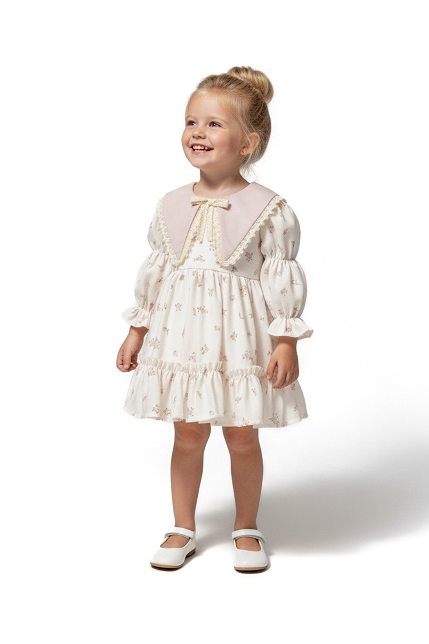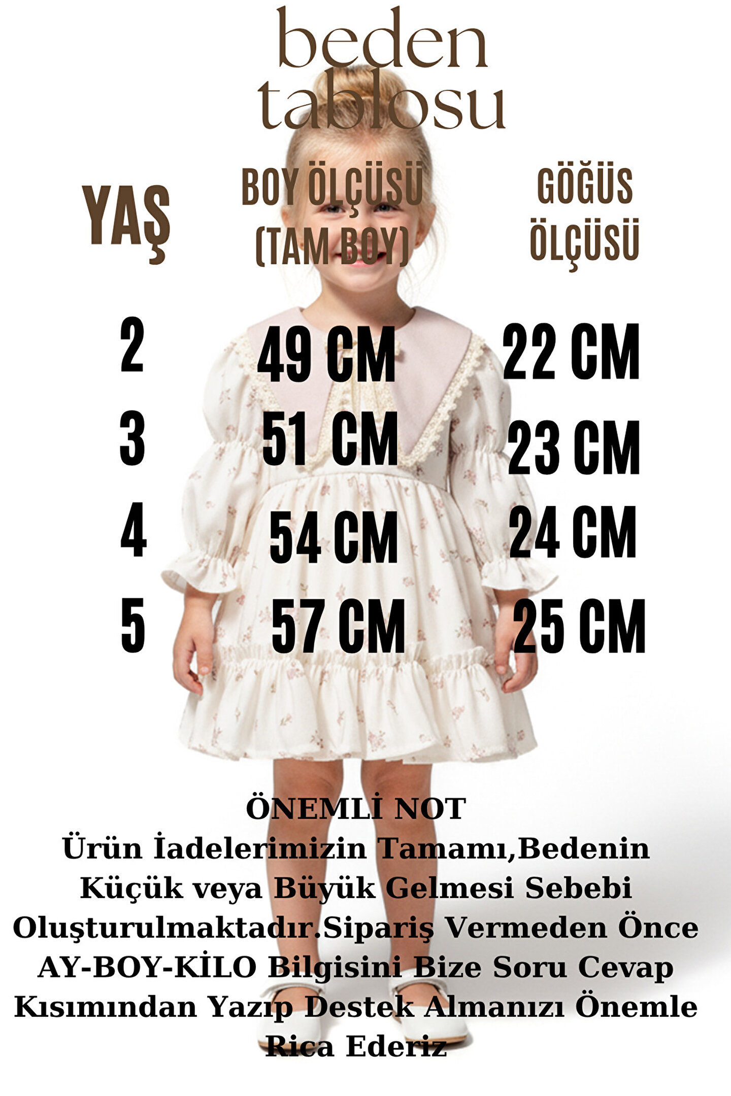 Mevsimlik Uzun Kollu Yakalı Dantel Detaylı Kız Çocuk Elbisesi: Küçük prensesinizin özel günlerde zarafetini ve şıklığını ön plana çıkaracak bu elbise, önünde bulunan Yakalı fiyonk detayı ve dantel işlemeleriyle tasarlanmıştır.; Özellikler: Dantel Detaylar: Elbisenin ön kısmında ve kollarda bulunan dantel detaylar, zarafet ve incelik katarken, küçük prensesinizin görünümünü daha etkileyici hale getirir.; Önünde Yakalı Fiyonk Detayı: Elbisenin ön kısmında bulunan fiyonk detayı, sevimliliği ve şıklığı artırır.; Küçük prensesinizin görünümüne hoş bir dokunuş ekler.; Uzun Kollu Tasarım:Rahatlıkla giyilebilecek Uzun kollu tasarım, bebeğinizin serin kalmasını sağlar ve özgürce hareket etmesine olanak tanır.; Mevsimlik Kullanıma Uygun: Hafif yapısı ve nefes alabilen kumaşıyla rahatlıkla giyilebilir.; Özel Günler İçin Uygun: Özel günlerde tercih edilebilecek şık tasarımıyla bebeğinizin her anında göz kamaştırmasını sağlar.; Bu önü Yakalı fiyonklu ve dantel detaylı Uzun kollu kız çocuk elbisesi, küçük prensesinizin şık kalmasını sağlarken, aynı zamanda özel günlerde de zarafetini tamamlar.; Zarif detaylarıyla bezenmiş bu elbise, bebeğinizin tarzını ve güzelliğini ön plana çıkarır.