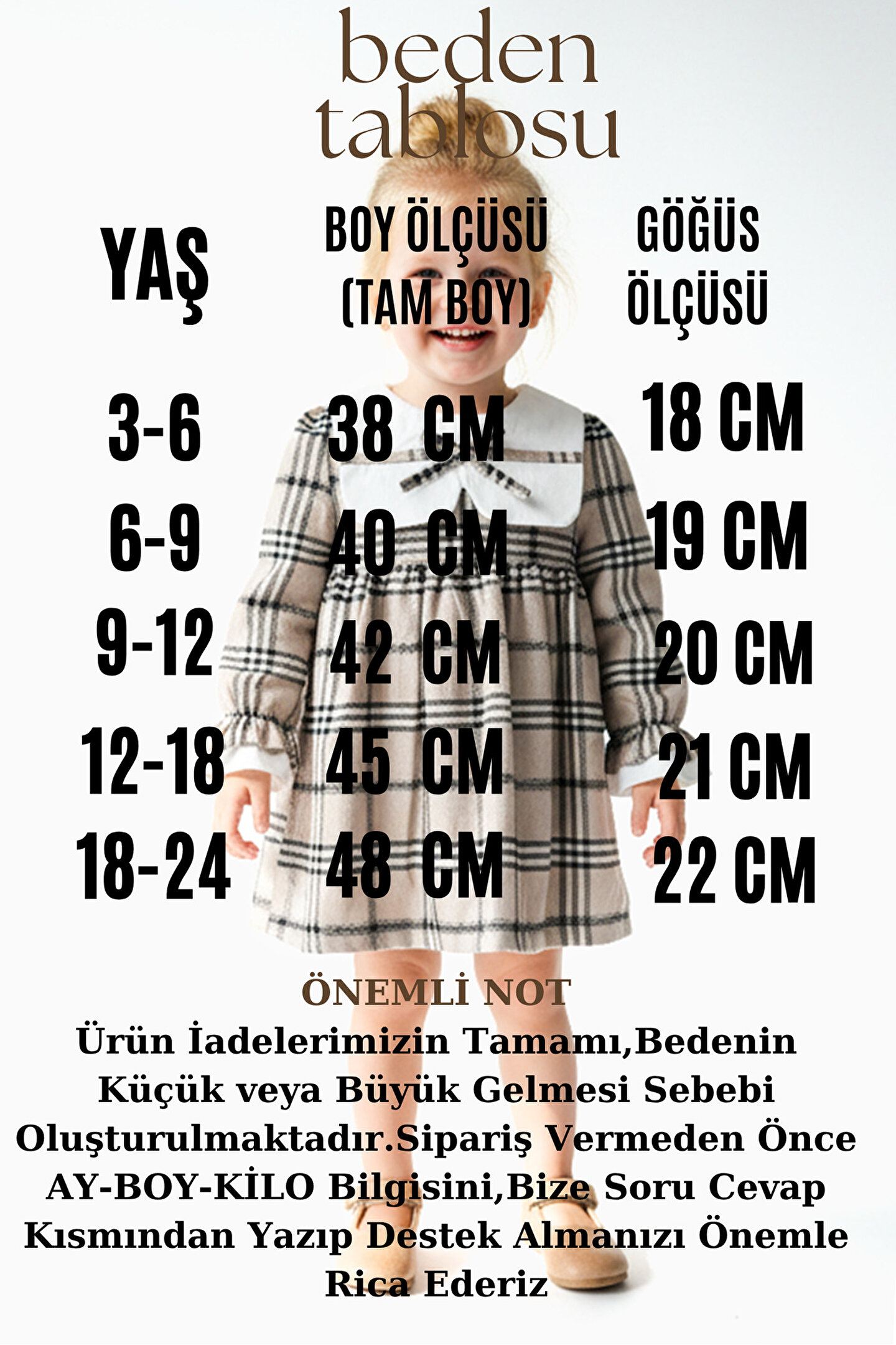 Mevsimlik Uzun Kollu Dantel Detaylı Kız Çocuk Elbisesi: Küçük prensesinizin özel günlerde zarafetini ve şıklığını ön plana çıkaracak bu elbise, önünde bulunan Yakalı fiyonk detayı ve dantel işlemeleriyle tasarlanmıştır.; Özellikler: Dantel Detaylar: Elbisenin ön kısmında ve kollarda bulunan dantel detaylar, zarafet ve incelik katarken, küçük prensesinizin görünümünü daha etkileyici hale getirir.; Önünde Yakalı Fiyonk Detayı: Elbisenin ön kısmında bulunan fiyonk detayı, sevimliliği ve şıklığı artırır.; Küçük prensesinizin görünümüne hoş bir dokunuş ekler.; Uzun Kollu Tasarım:Rahatlıkla giyilebilecek Uzun kollu tasarım, bebeğinizin serin kalmasını sağlar ve özgürce hareket etmesine olanak tanır.; Mevsimlik Kullanıma Uygun: Hafif yapısı ve nefes alabilen kumaşıyla rahatlıkla giyilebilir.; Özel Günler İçin Uygun: Özel günlerde tercih edilebilecek şık tasarımıyla bebeğinizin her anında göz kamaştırmasını sağlar.; Bu önü Yakalı fiyonklu ve dantel detaylı Uzun kollu kız çocuk elbisesi, küçük prensesinizin şık kalmasını sağlarken, aynı zamanda özel günlerde de zarafetini tamamlar.; Zarif detaylarıyla bezenmiş bu elbise, bebeğinizin tarzını ve güzelliğini ön plana çıkarır.