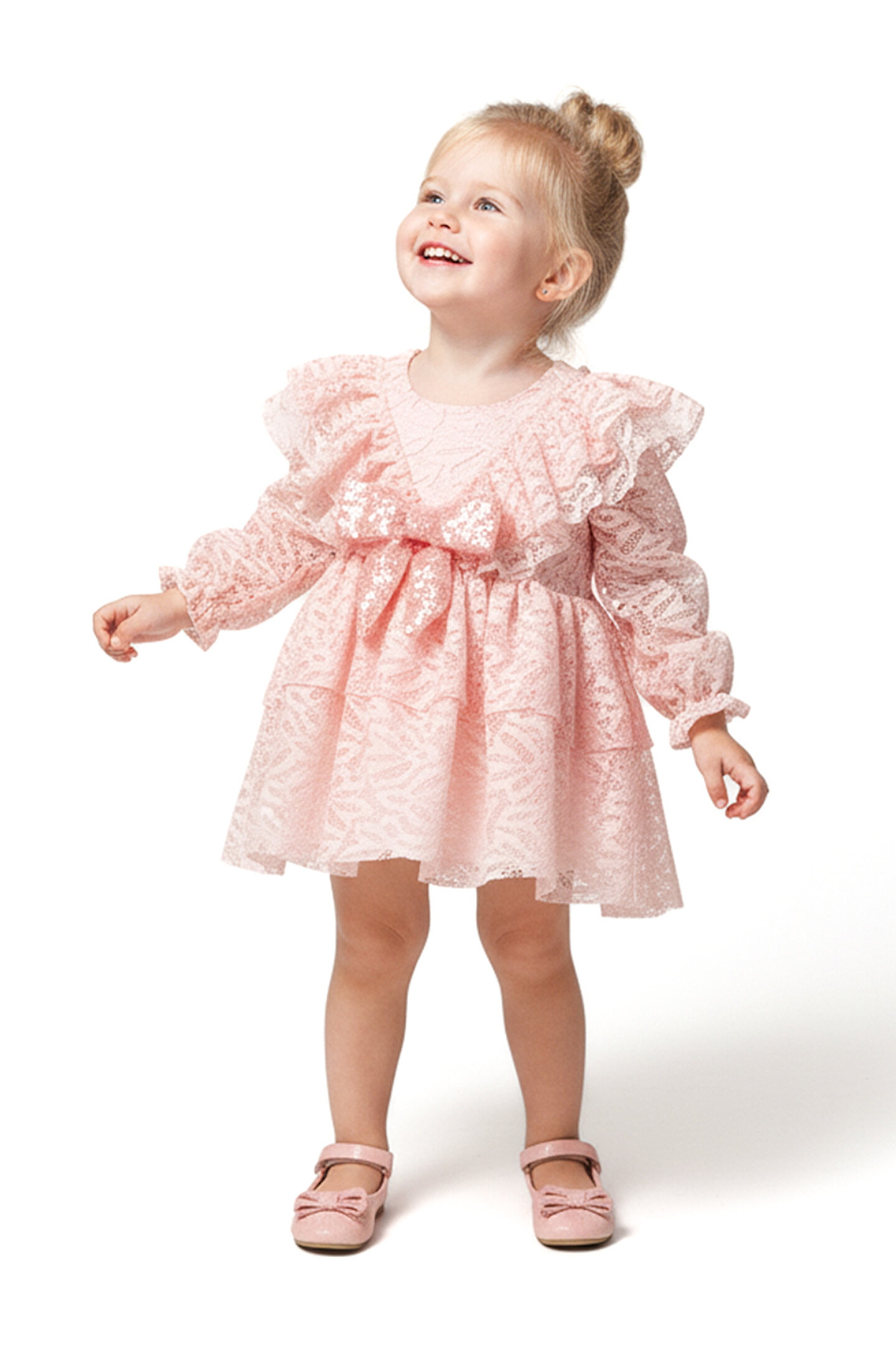 Mevsimlik Uzun Kollu Dantel Detaylı Kız Çocuk Elbisesi: Küçük prensesinizin özel günlerde zarafetini ve şıklığını ön plana çıkaracak bu elbise, önünde bulunan Yakalı fiyonk detayı ve dantel işlemeleriyle tasarlanmıştır.; Özellikler: Dantel Detaylar: Elbisenin ön kısmında ve kollarda bulunan dantel detaylar, zarafet ve incelik katarken, küçük prensesinizin görünümünü daha etkileyici hale getirir.; Önünde Yakalı Fiyonk Detayı: Elbisenin ön kısmında bulunan fiyonk detayı, sevimliliği ve şıklığı artırır.; Küçük prensesinizin görünümüne hoş bir dokunuş ekler.; Uzun Kollu Tasarım:Rahatlıkla giyilebilecek Uzun kollu tasarım, bebeğinizin serin kalmasını sağlar ve özgürce hareket etmesine olanak tanır.; Mevsimlik Kullanıma Uygun: Hafif yapısı ve nefes alabilen kumaşıyla rahatlıkla giyilebilir.; Özel Günler İçin Uygun: Özel günlerde tercih edilebilecek şık tasarımıyla bebeğinizin her anında göz kamaştırmasını sağlar.; Bu önü Yakalı fiyonklu ve dantel detaylı Uzun kollu kız çocuk elbisesi, küçük prensesinizin şık kalmasını sağlarken, aynı zamanda özel günlerde de zarafetini tamamlar.; Zarif detaylarıyla bezenmiş bu elbise, bebeğinizin tarzını ve güzelliğini ön plana çıkarır.