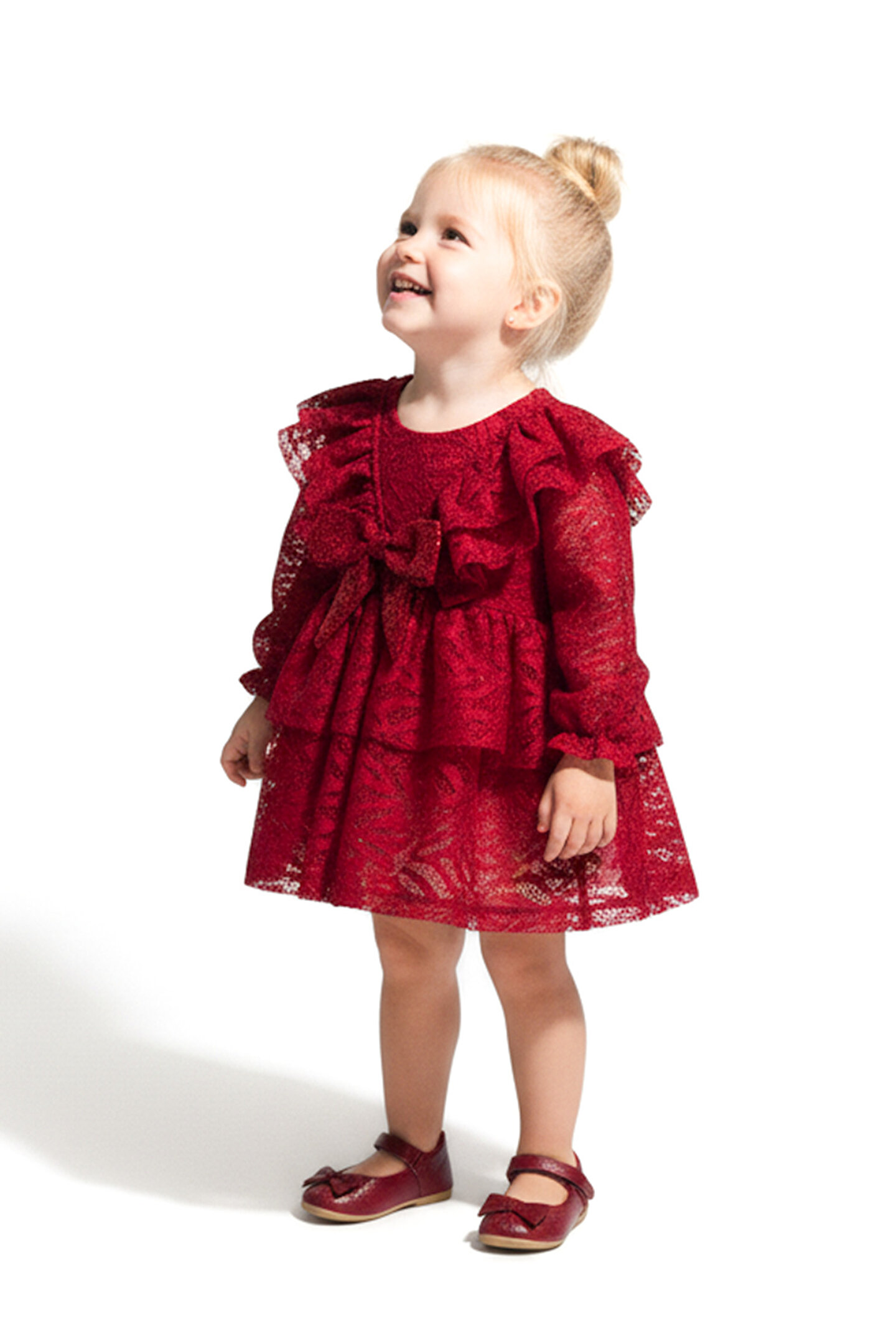 Mevsimlik Uzun Kollu Dantel Detaylı Kız Çocuk Elbisesi: Küçük prensesinizin özel günlerde zarafetini ve şıklığını ön plana çıkaracak bu elbise, önünde bulunan Yakalı fiyonk detayı ve dantel işlemeleriyle tasarlanmıştır.; Özellikler: Dantel Detaylar: Elbisenin ön kısmında ve kollarda bulunan dantel detaylar, zarafet ve incelik katarken, küçük prensesinizin görünümünü daha etkileyici hale getirir.; Önünde Yakalı Fiyonk Detayı: Elbisenin ön kısmında bulunan fiyonk detayı, sevimliliği ve şıklığı artırır.; Küçük prensesinizin görünümüne hoş bir dokunuş ekler.; Uzun Kollu Tasarım:Rahatlıkla giyilebilecek Uzun kollu tasarım, bebeğinizin serin kalmasını sağlar ve özgürce hareket etmesine olanak tanır.; Mevsimlik Kullanıma Uygun: Hafif yapısı ve nefes alabilen kumaşıyla rahatlıkla giyilebilir.; Özel Günler İçin Uygun: Özel günlerde tercih edilebilecek şık tasarımıyla bebeğinizin her anında göz kamaştırmasını sağlar.; Bu önü Yakalı fiyonklu ve dantel detaylı Uzun kollu kız çocuk elbisesi, küçük prensesinizin şık kalmasını sağlarken, aynı zamanda özel günlerde de zarafetini tamamlar.; Zarif detaylarıyla bezenmiş bu elbise, bebeğinizin tarzını ve güzelliğini ön plana çıkarır.