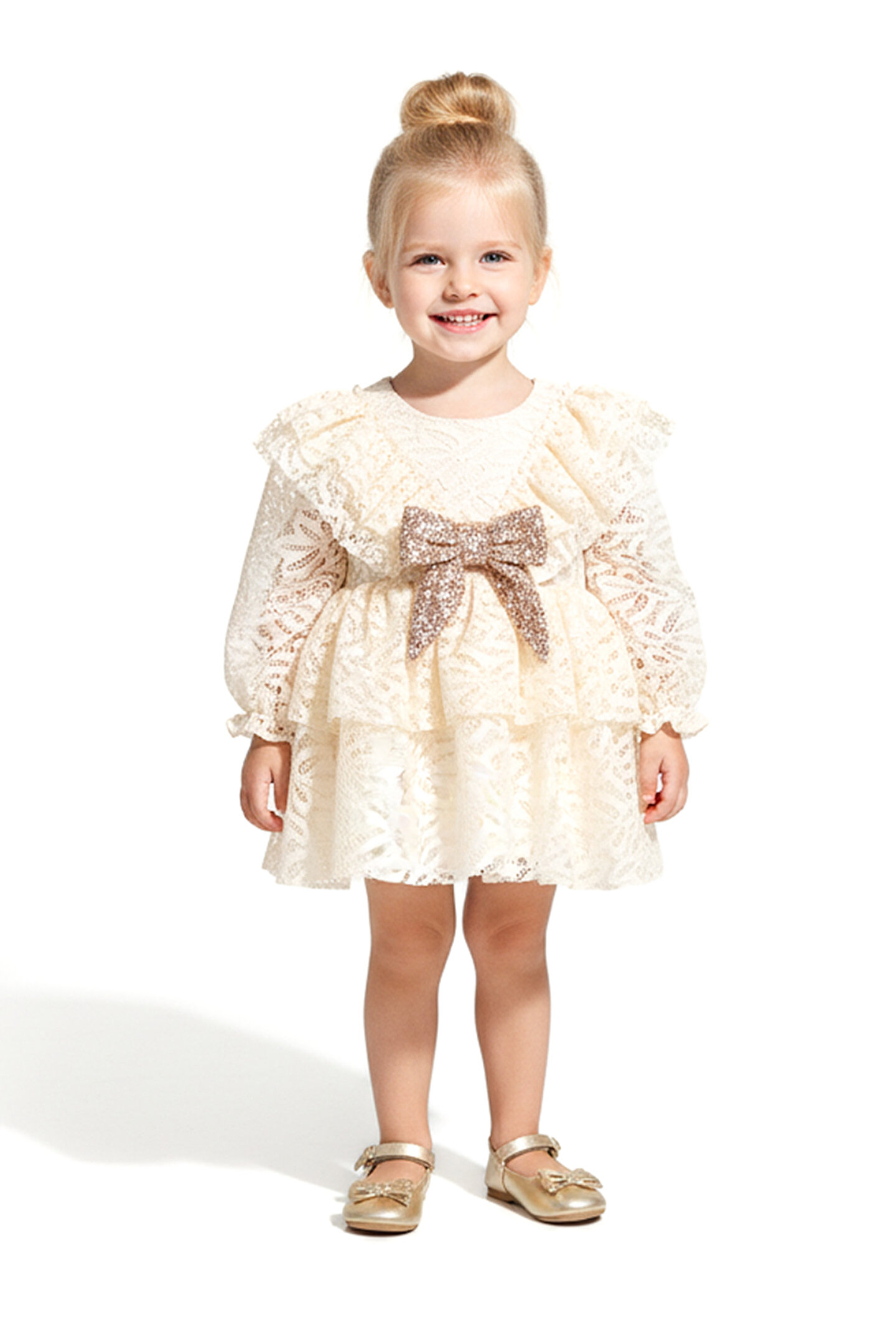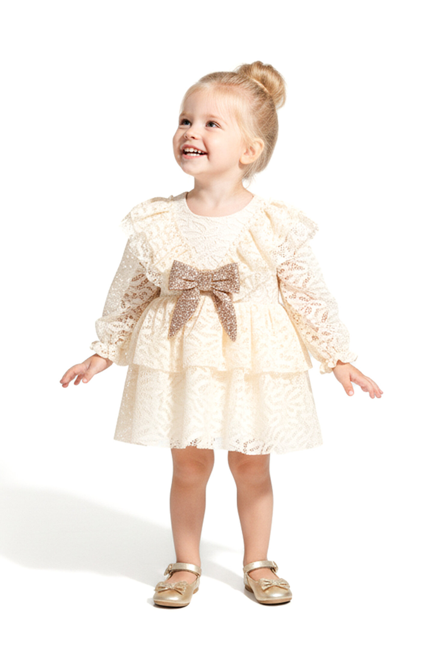 Mevsimlik Uzun Kollu Dantel Detaylı Kız Çocuk Elbisesi: Küçük prensesinizin özel günlerde zarafetini ve şıklığını ön plana çıkaracak bu elbise, önünde bulunan Yakalı fiyonk detayı ve dantel işlemeleriyle tasarlanmıştır.; Özellikler: Dantel Detaylar: Elbisenin ön kısmında ve kollarda bulunan dantel detaylar, zarafet ve incelik katarken, küçük prensesinizin görünümünü daha etkileyici hale getirir.; Önünde Yakalı Fiyonk Detayı: Elbisenin ön kısmında bulunan fiyonk detayı, sevimliliği ve şıklığı artırır.; Küçük prensesinizin görünümüne hoş bir dokunuş ekler.; Uzun Kollu Tasarım:Rahatlıkla giyilebilecek Uzun kollu tasarım, bebeğinizin serin kalmasını sağlar ve özgürce hareket etmesine olanak tanır.; Mevsimlik Kullanıma Uygun: Hafif yapısı ve nefes alabilen kumaşıyla rahatlıkla giyilebilir.; Özel Günler İçin Uygun: Özel günlerde tercih edilebilecek şık tasarımıyla bebeğinizin her anında göz kamaştırmasını sağlar.; Bu önü Yakalı fiyonklu ve dantel detaylı Uzun kollu kız çocuk elbisesi, küçük prensesinizin şık kalmasını sağlarken, aynı zamanda özel günlerde de zarafetini tamamlar.; Zarif detaylarıyla bezenmiş bu elbise, bebeğinizin tarzını ve güzelliğini ön plana çıkarır.