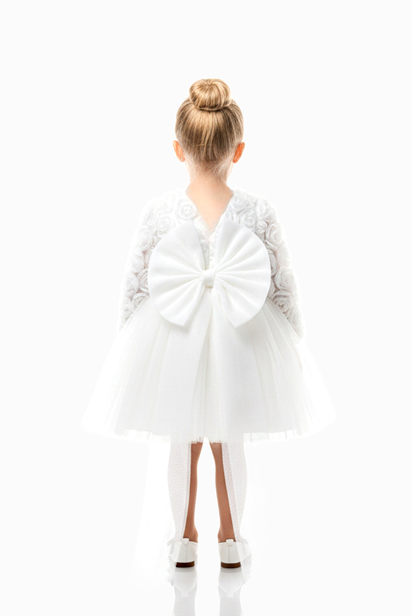 Mevsimlik Uzun Kollu Dantel Detaylı Kız Çocuk Elbisesi: Küçük prensesinizin özel günlerde zarafetini ve şıklığını ön plana çıkaracak bu elbise, arkasında bulunan fiyonk detayı ve dantel işlemeleriyle tasarlanmıştır.; Ayrıca etek kısmında bulunan yırtmaç detayı, hareket özgürlüğü sağlarken bebeğinizin zarif bir görünüm sergilemesini sağlar.; Özellikler tül Detaylar: Elbisenin ön kısmında ve kollarda bulunan tül detaylar, zarafet ve incelik katarken, küçük prensesinizin görünümünü daha etkileyici hale getirir.; Arkasındaki Fiyonk Detayı: Elbisenin ön kısmında bulunan fiyonk detayı, sevimliliği ve şıklığı artırır.; Küçük prensesinizin görünümüne hoş bir dokunuş ekler.; Yırtmaç Detayı: Etek kısmında bulunan yırtmaç detayı, hareket özgürlüğü sağlarken, elbisenin tasarımına dinamizm katar.; Uzun Kollu Tasarım:Rahatlıkla giyilebilecek Uzun kollu tasarım, bebeğinizin özgürce hareket etmesine olanak tanır.; Mevsimlik Kullanıma Uygun: Hafif yapısı ve nefes alabilen kumaşıyla rahatlıkla giyilebilir.; Özel Günler İçin Uygun: Özel günlerde tercih edilebilecek şık tasarımıyla bebeğinizin her anında göz kamaştırmasını sağlar.; Bu yırtmaçlı,arkası fiyonklu Uzun kollu kız çocuk elbisesi, küçük prensesinizin serin ve şık kalmasını sağlarken, aynı zamanda özel günlerde de zarafetini tamamlar.; Zarif detaylarıyla bezenmiş bu elbise, bebeğinizin tarzını ve güzelliğini ön plana çıkarır.